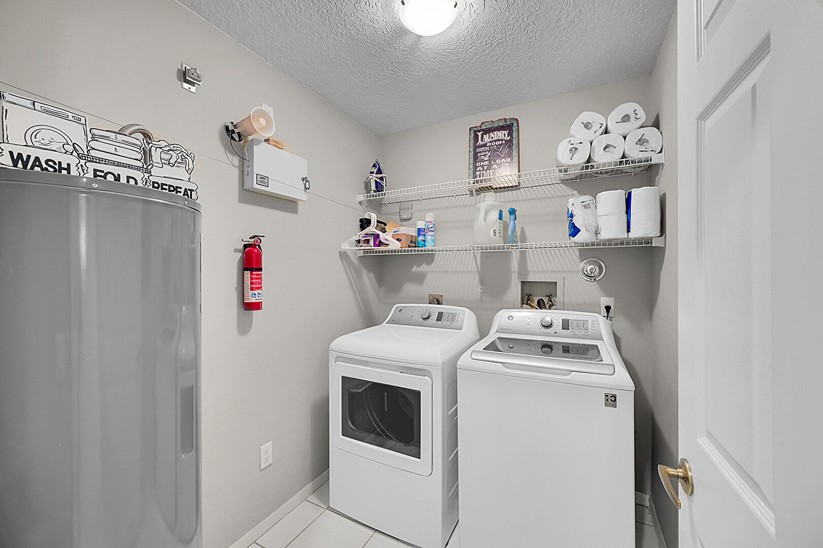 Drywall, Fire Extinguisher, Laundry, Textured Ceiling, Tile Floor, Washer Hookup, Water Heater, Baseboards Wall