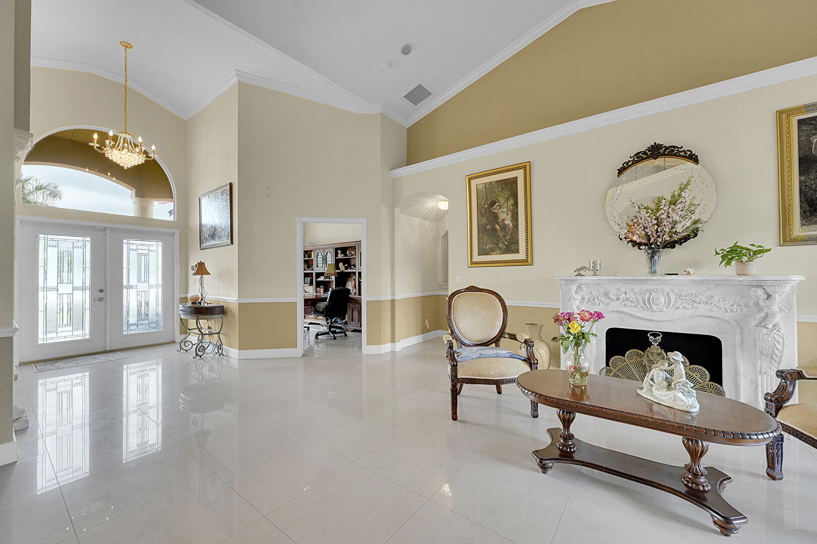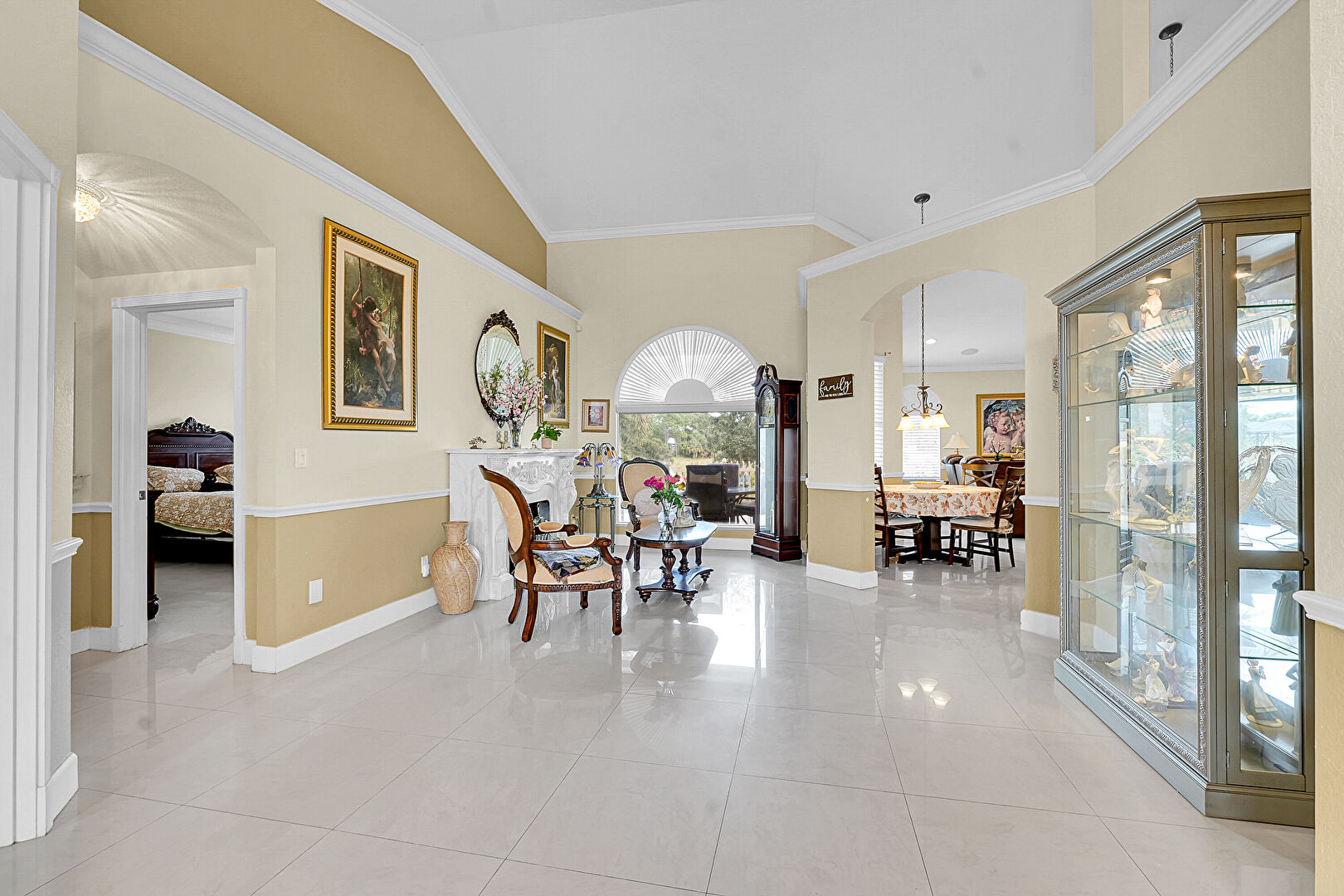 Arched Walkways, Baseboards Wall, Cathedral Ceiling, Crown Molding, Drywall, Fireplace, French Doors, High Ceiling, Marble Finish Floor, Natural Light, Notable Chandelier, Tile Floor, Vaulted Ceiling, Vent, Crown Molding, Drywall