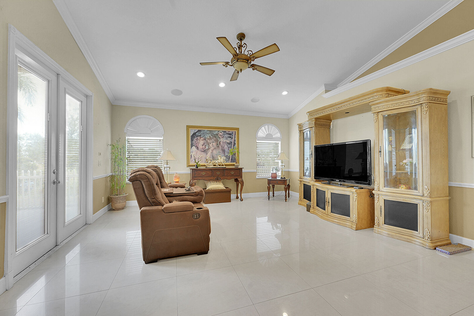 Crown Molding, Drywall, High Ceiling, Natural Light, Office Area, Tile Floor, Vaulted Ceiling, Ceiling Fan
