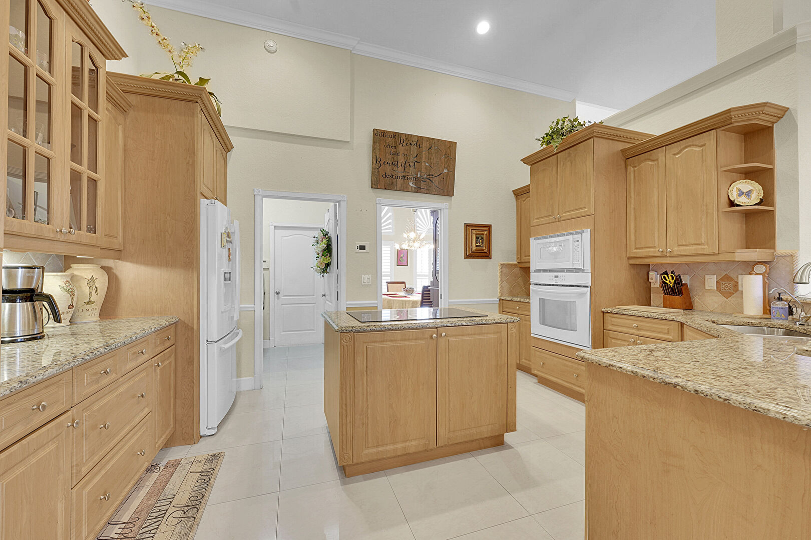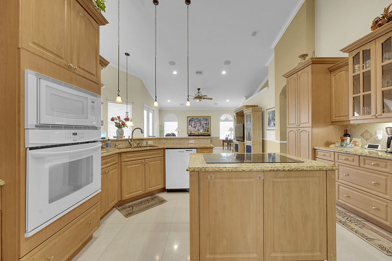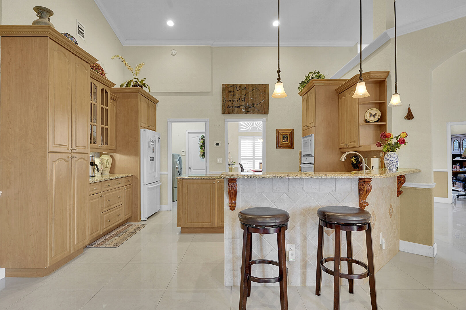 Arched Cabinets, Baseboards Wall, Ceiling Fan, Crown Molding, Crown Molding Cabinets, Drywall, Glass Insert Cabinets, High Ceiling, Kitchen Bar, Kitchen Island, Kitchen Peninsula, Medium Brown Cabinets, Natural Light, Open Shelves, Opens To Living Area, Pendant Lighting, Raised Cabinets, Recessed Lighting, Stone Countertops, Tile Floor, Vaulted Ceiling, Vent, Drywall, Raised Cabinets, U Shaped Kitchen
