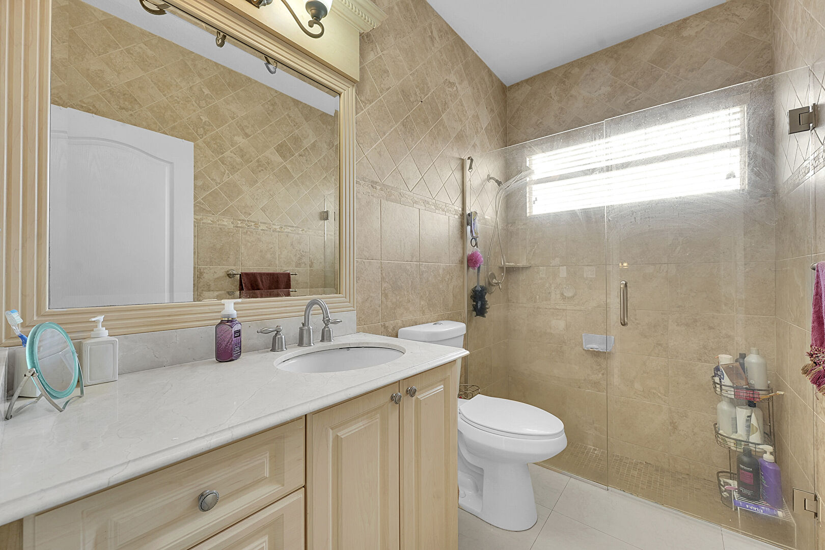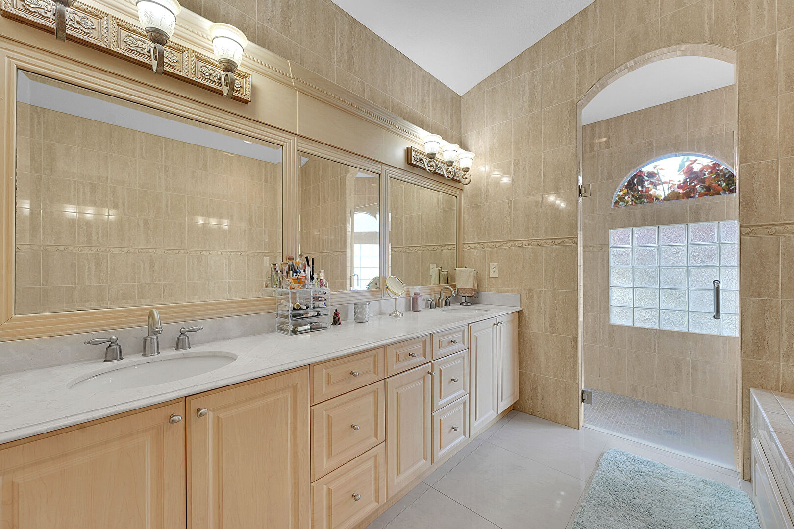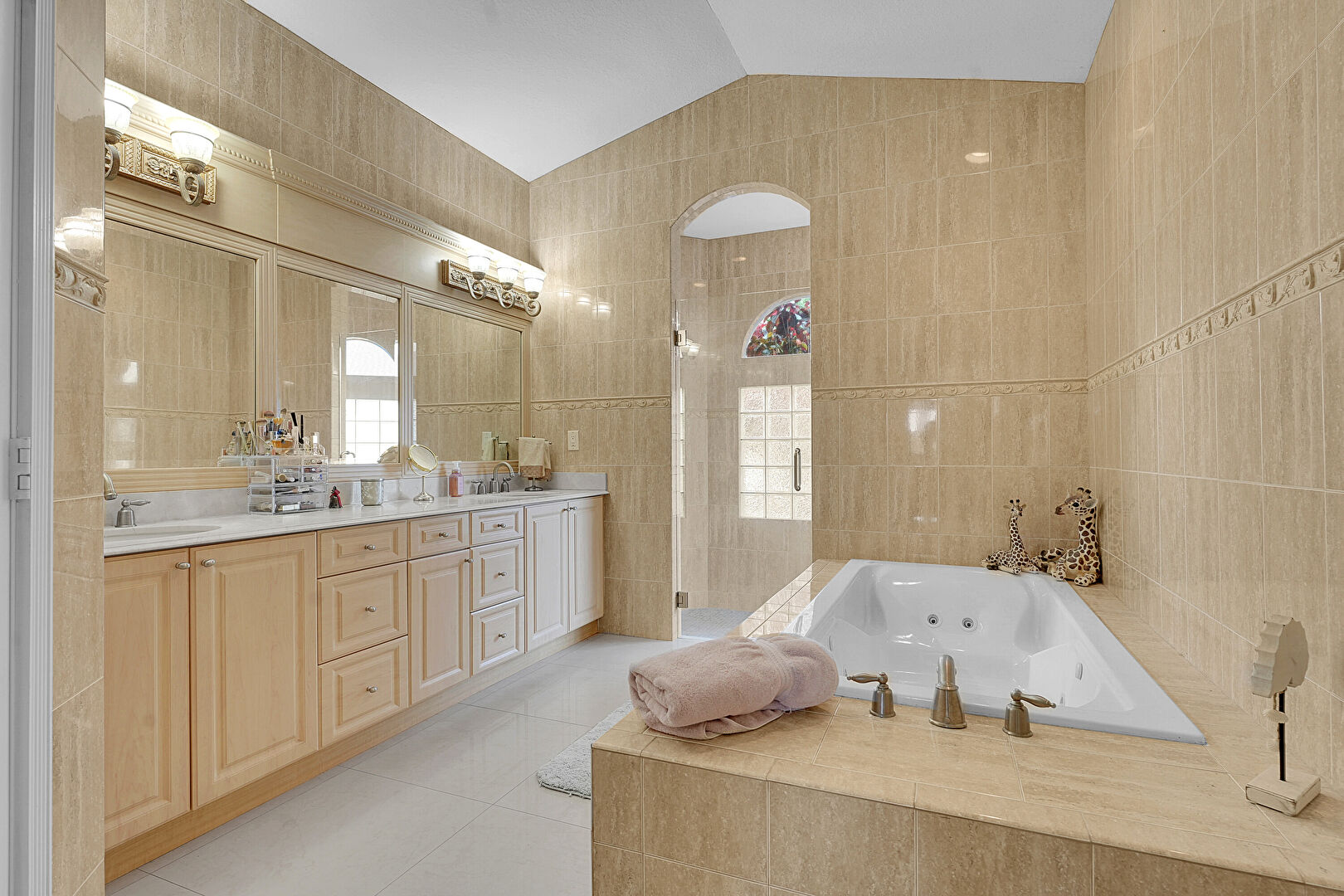 Double Vanity, Full Bathroom, Natural Light, Tile Floor, Tile Wall, Vaulted Ceiling, Tile Floor, Tile Wall