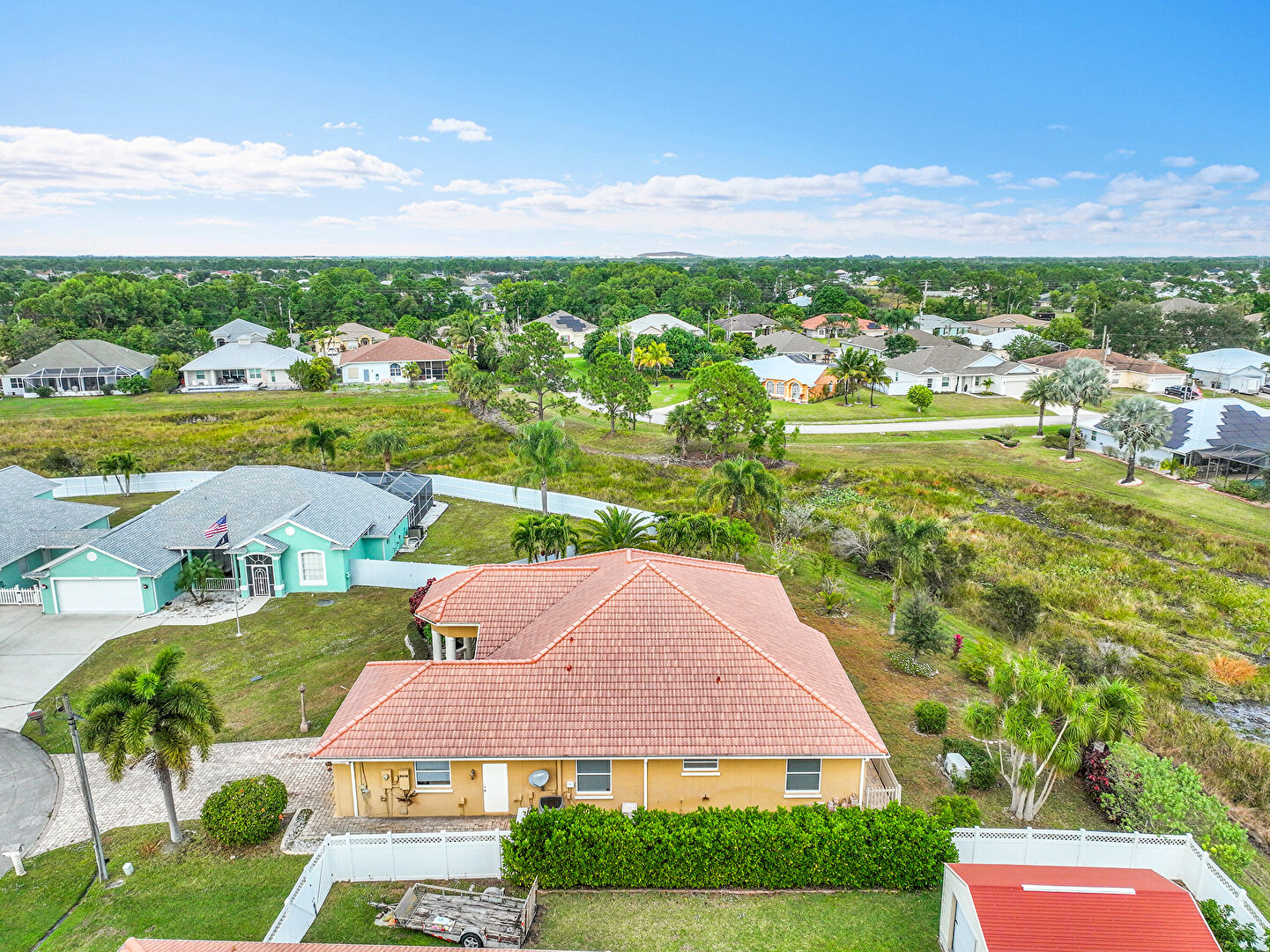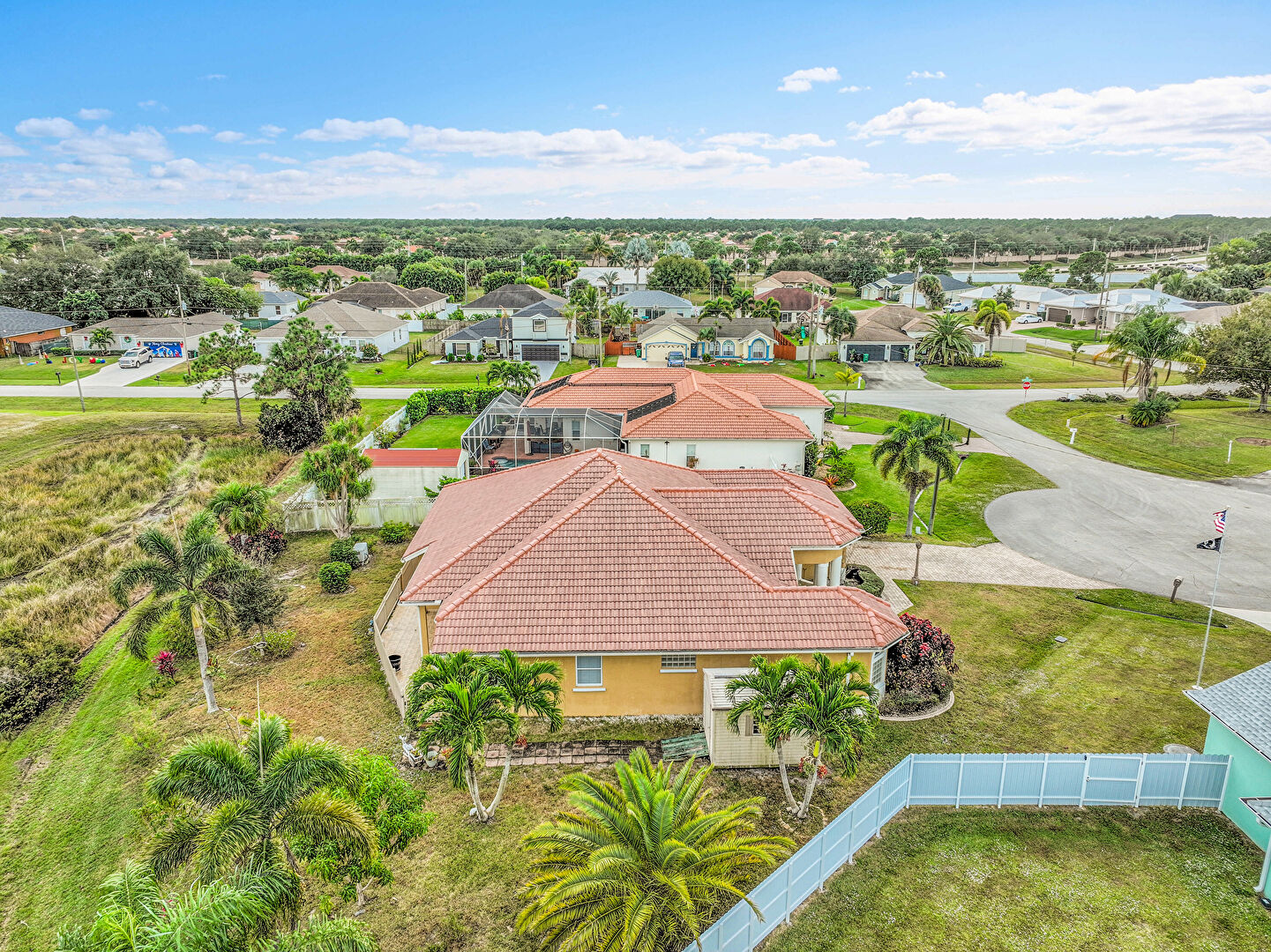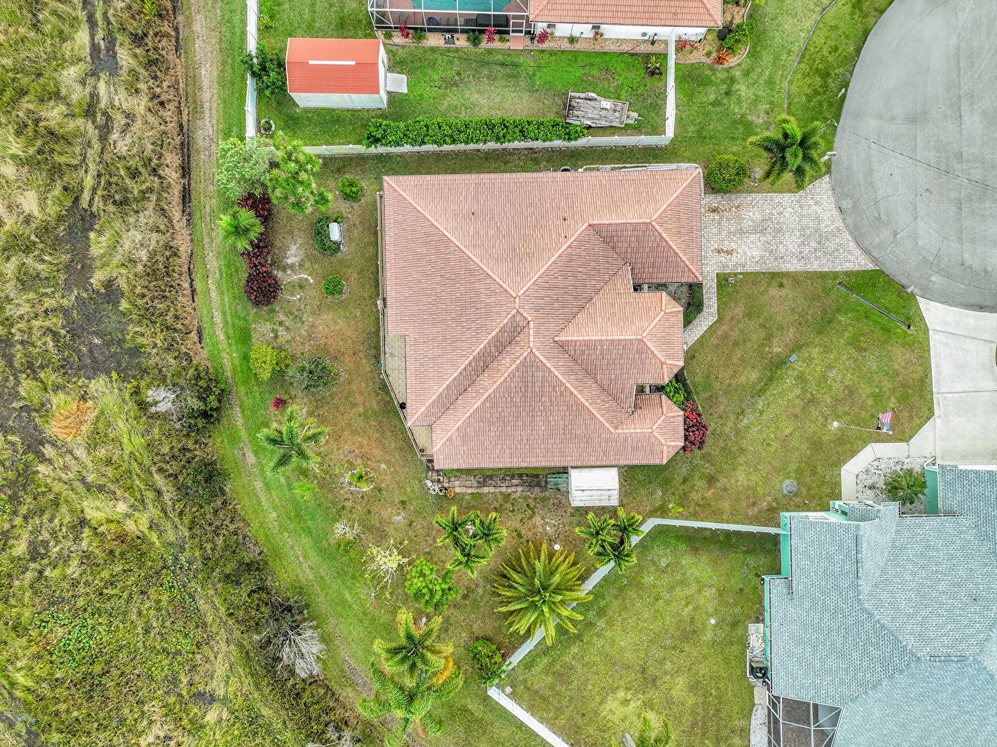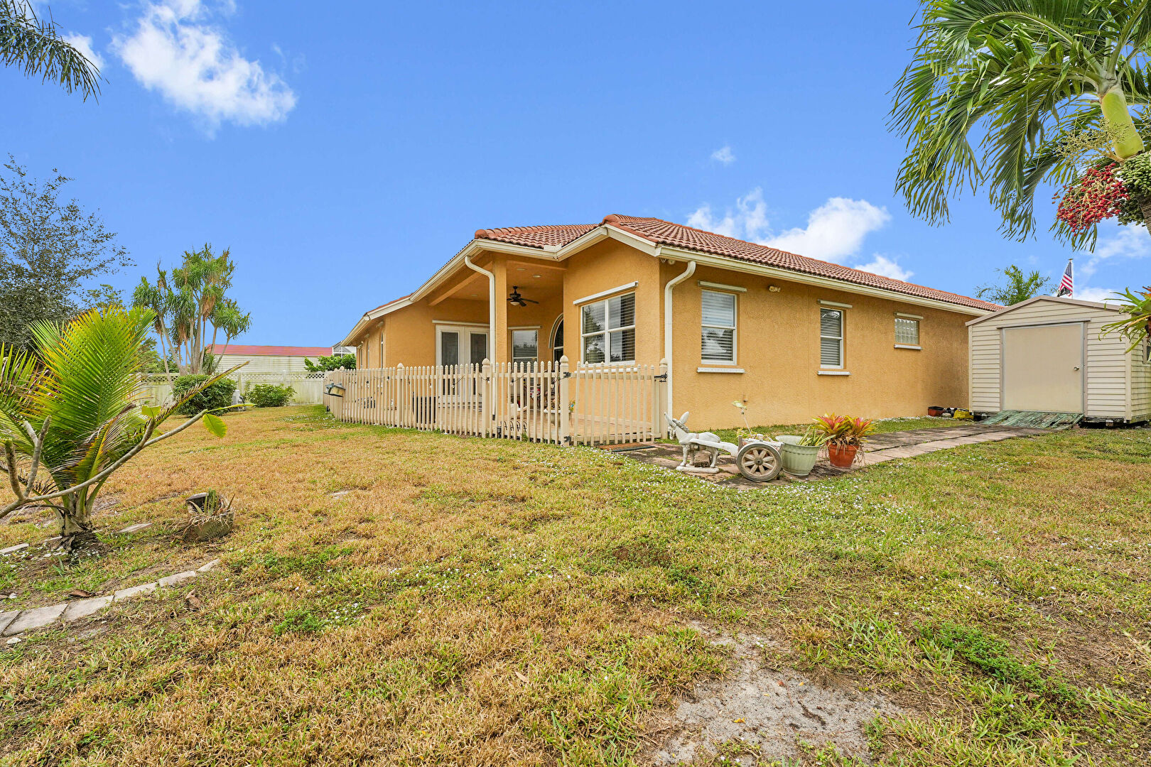 Downspout, Fence, Gutters, Lawn, Outdoor Structure, Patio, Shed, Stucco Siding, Tile Roof, Ceiling Fan, Stucco Siding