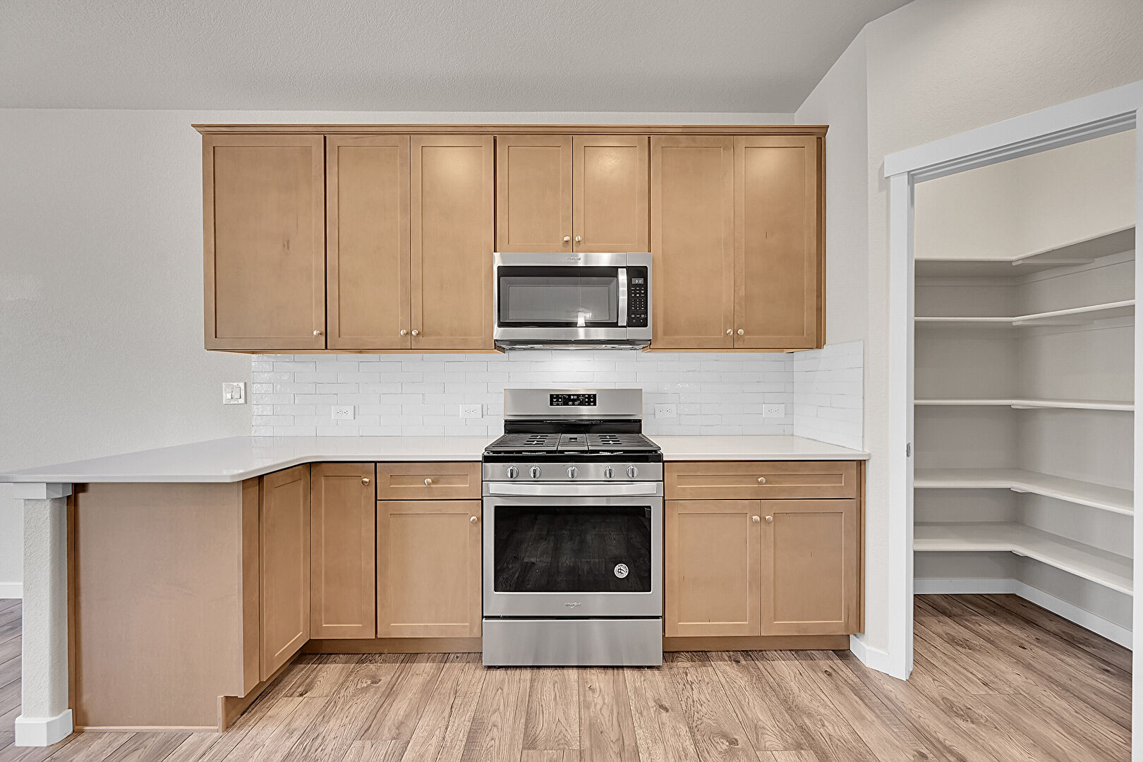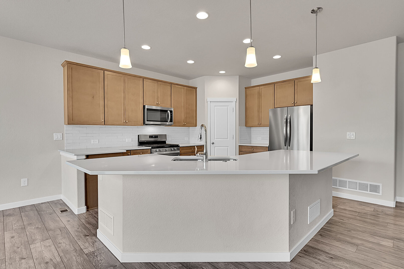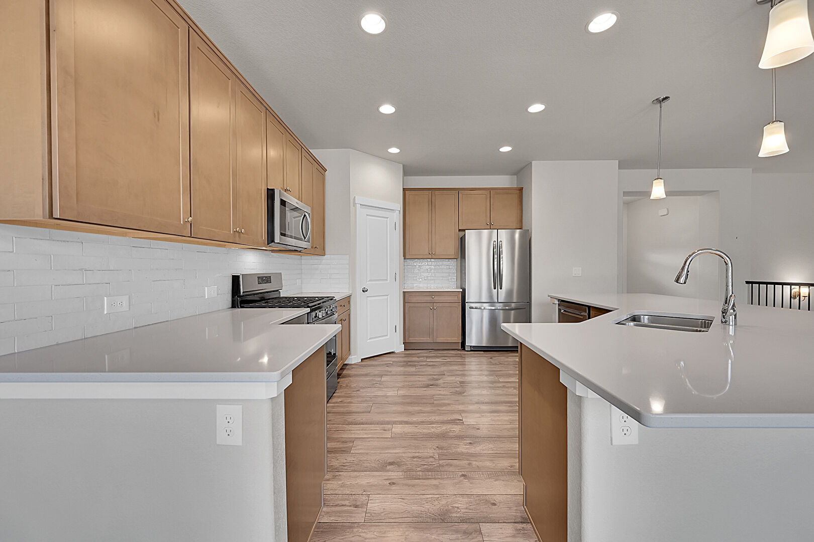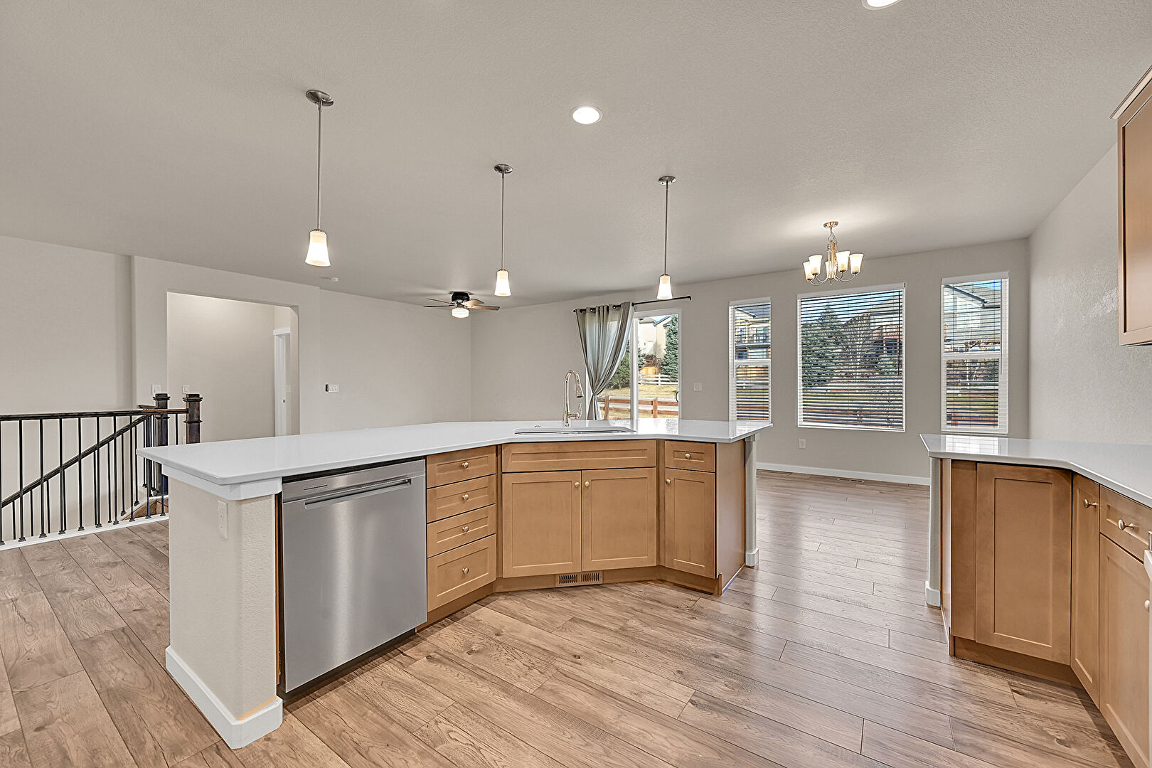 Baseboards Wall, Ceiling Fan, Crown Molding Cabinets, Drywall, Kitchen Bar, Kitchen Island, Kitchen Peninsula, L Shaped Kitchen, Medium Brown Cabinets, Natural Light, Notable Chandelier, Opens To Living Area, Pendant Lighting, Recessed Lighting, Shaker Cabinets, Stone Countertops, Vent, Wood Finish Floor, Baseboards Wall, Drywall, Kitchen Island, Pendant Lighting, Shaker Cabinets, Stone Countertops