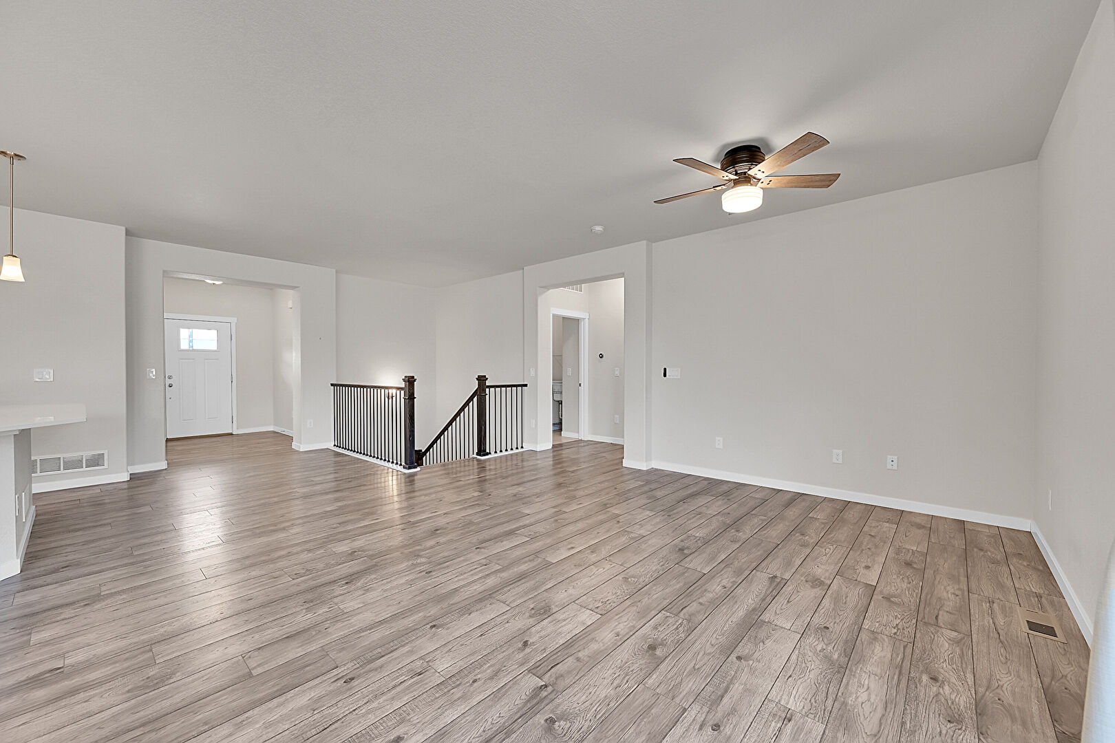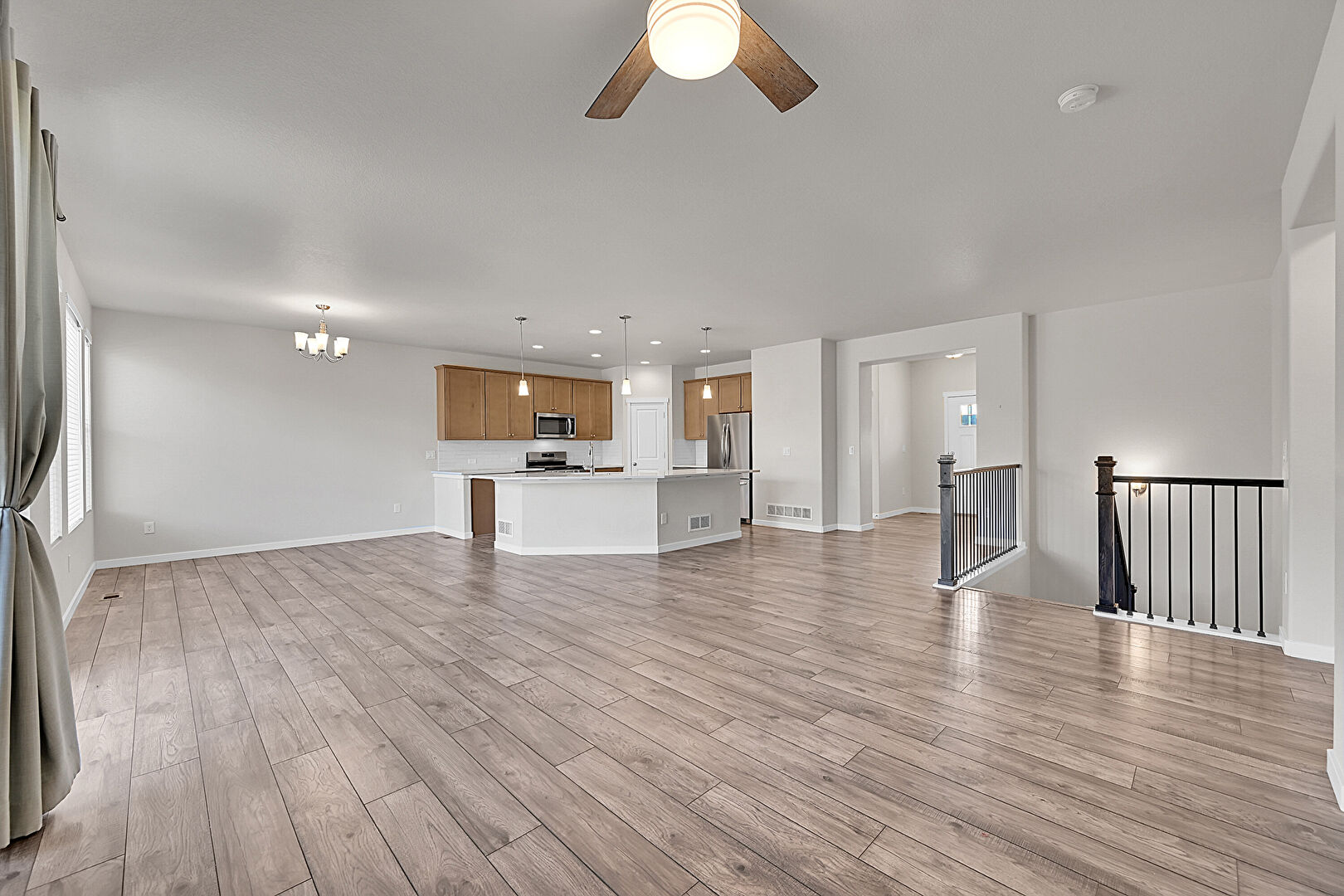 Baseboards Wall, Carpet, Drywall, Natural Light, Notable Chandelier, Vent, Ceiling Fan, Wood Finish Floor