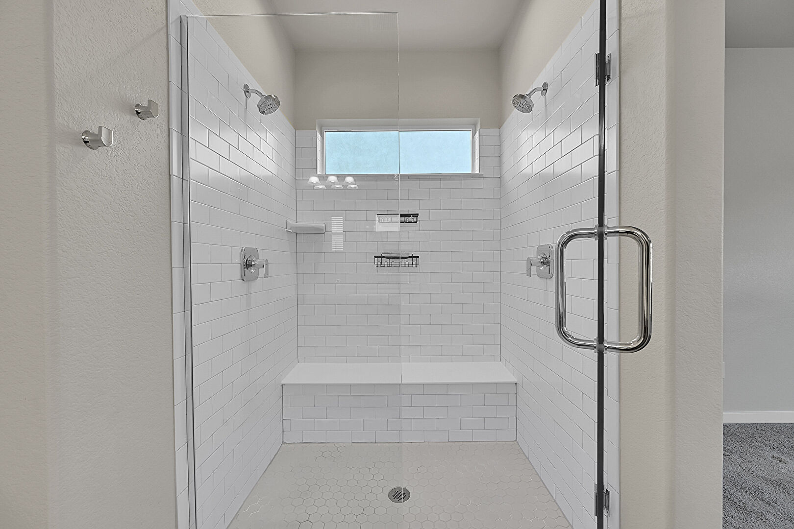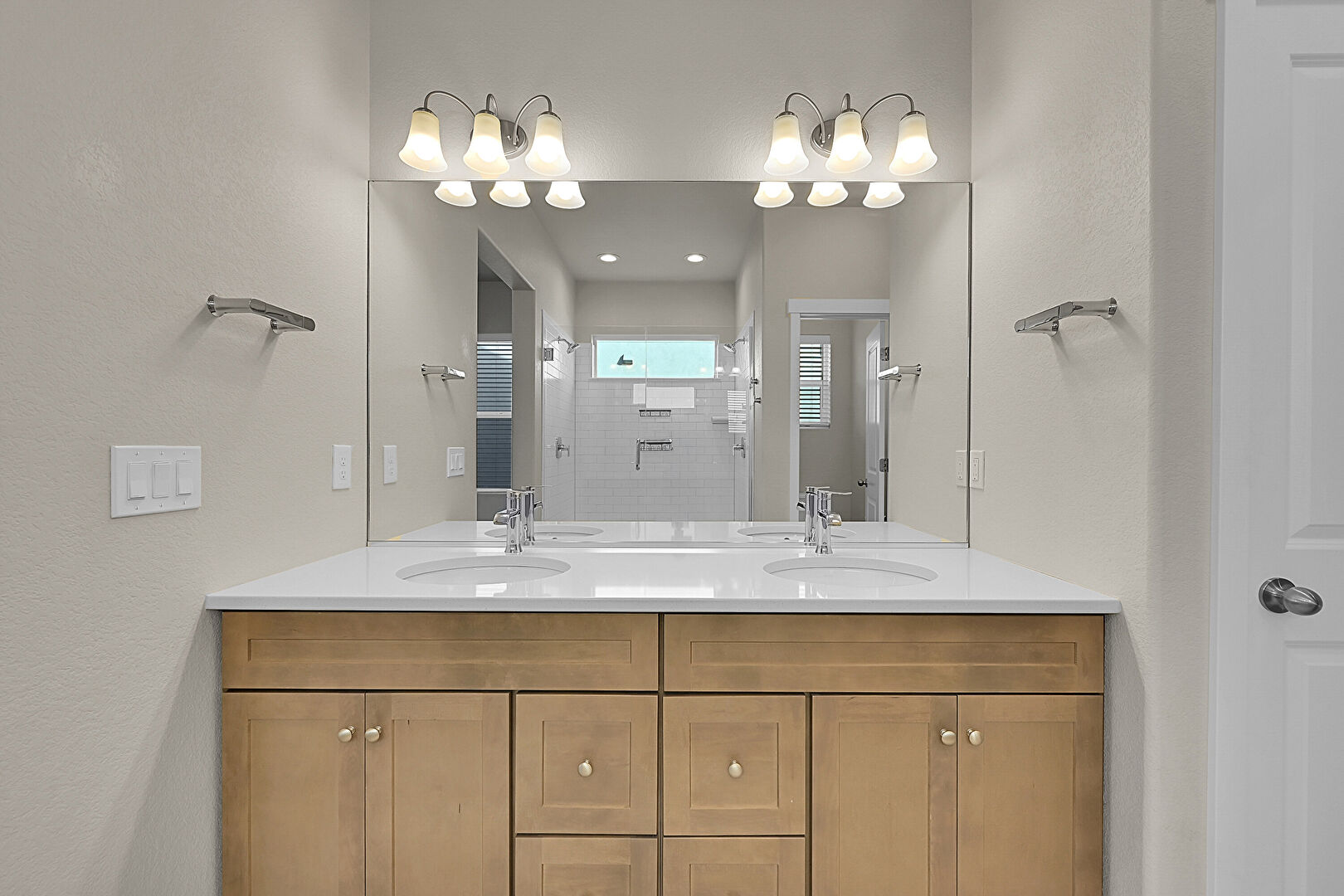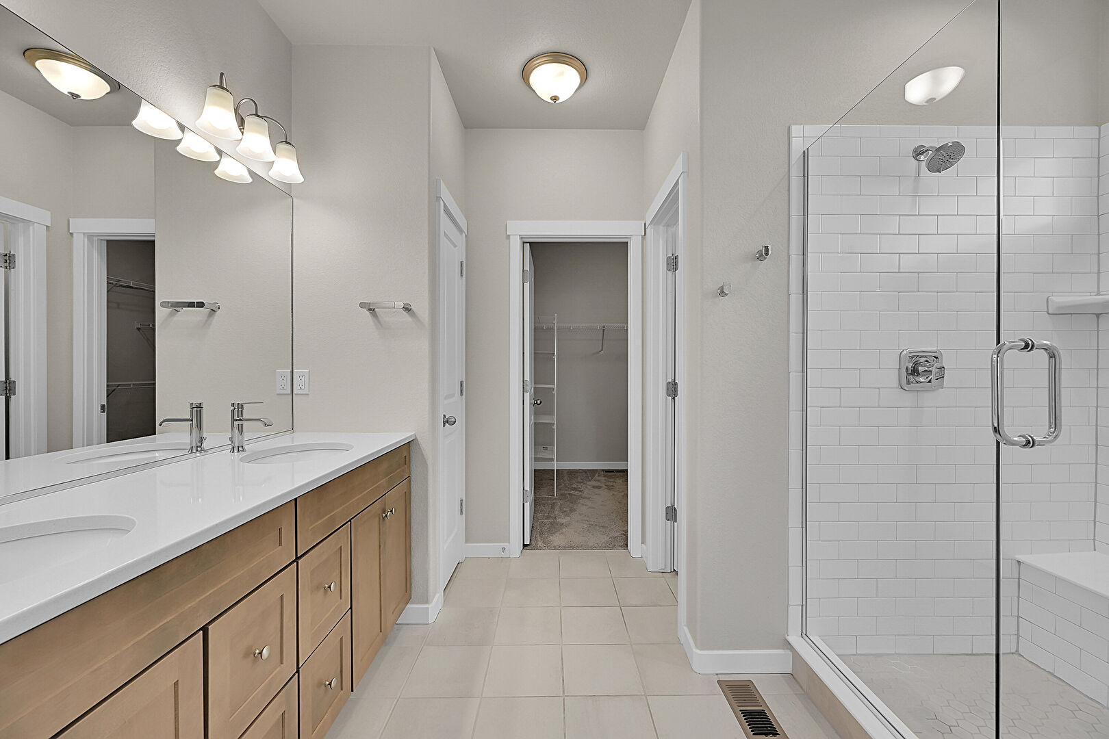Baseboards Wall, Double Vanity, Drywall, Full Bathroom, Natural Light, Textured Wall, Tile Floor, Vent, Full Bathroom, Natural Light, Walk In Closet