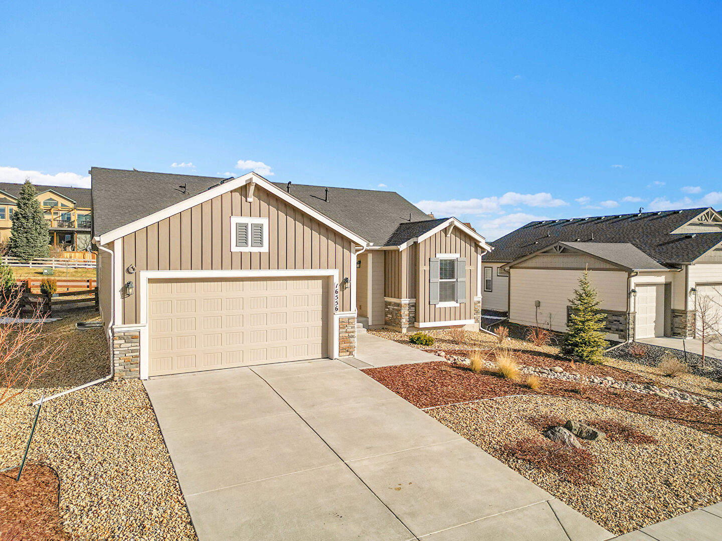 Board Batten Siding, Downspout, Driveway, Fence, Gutters, Horizontal Siding, Shingle Roof, Stone Siding, Vertical Siding, Stone Siding, Vertical Siding