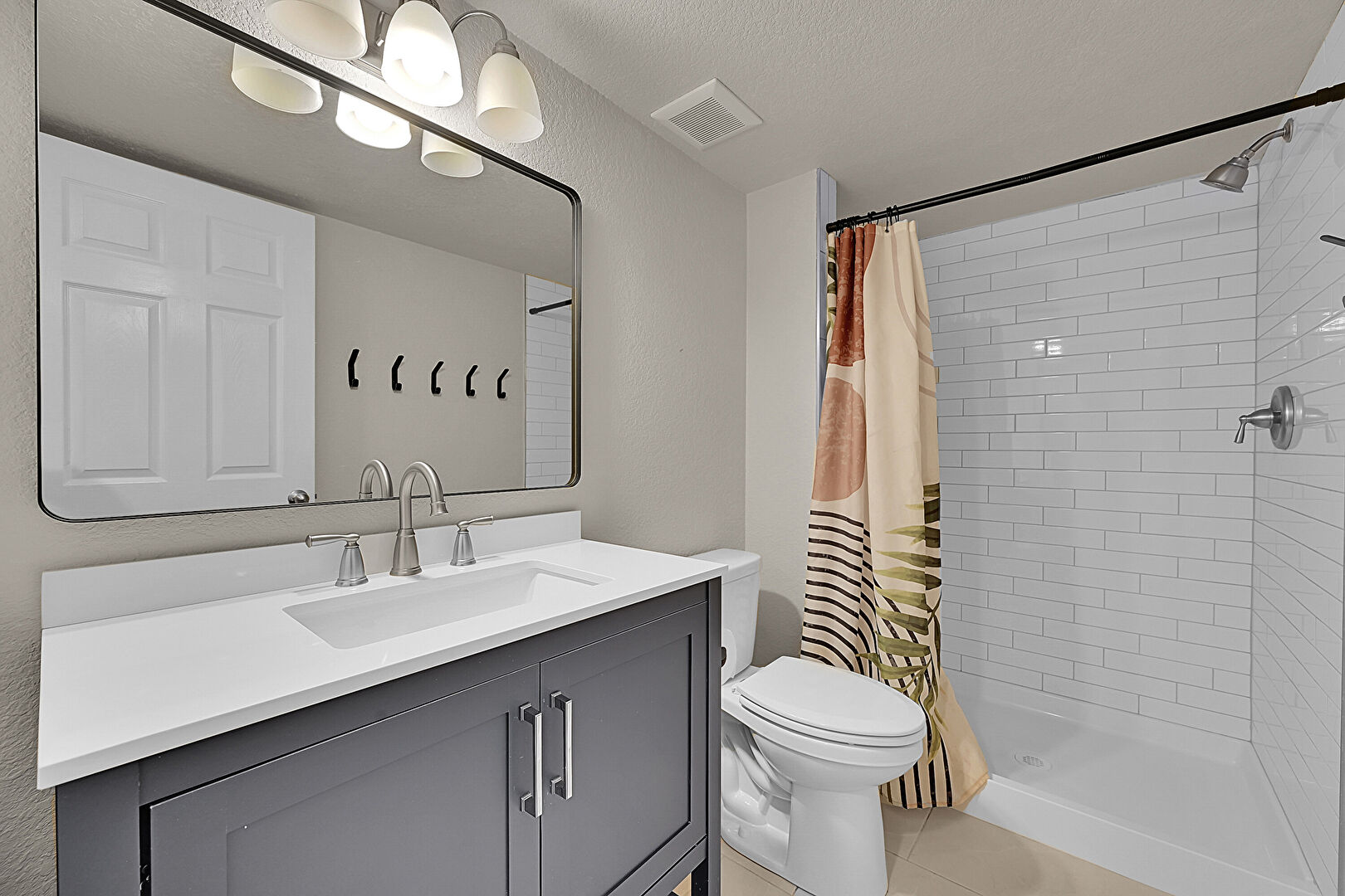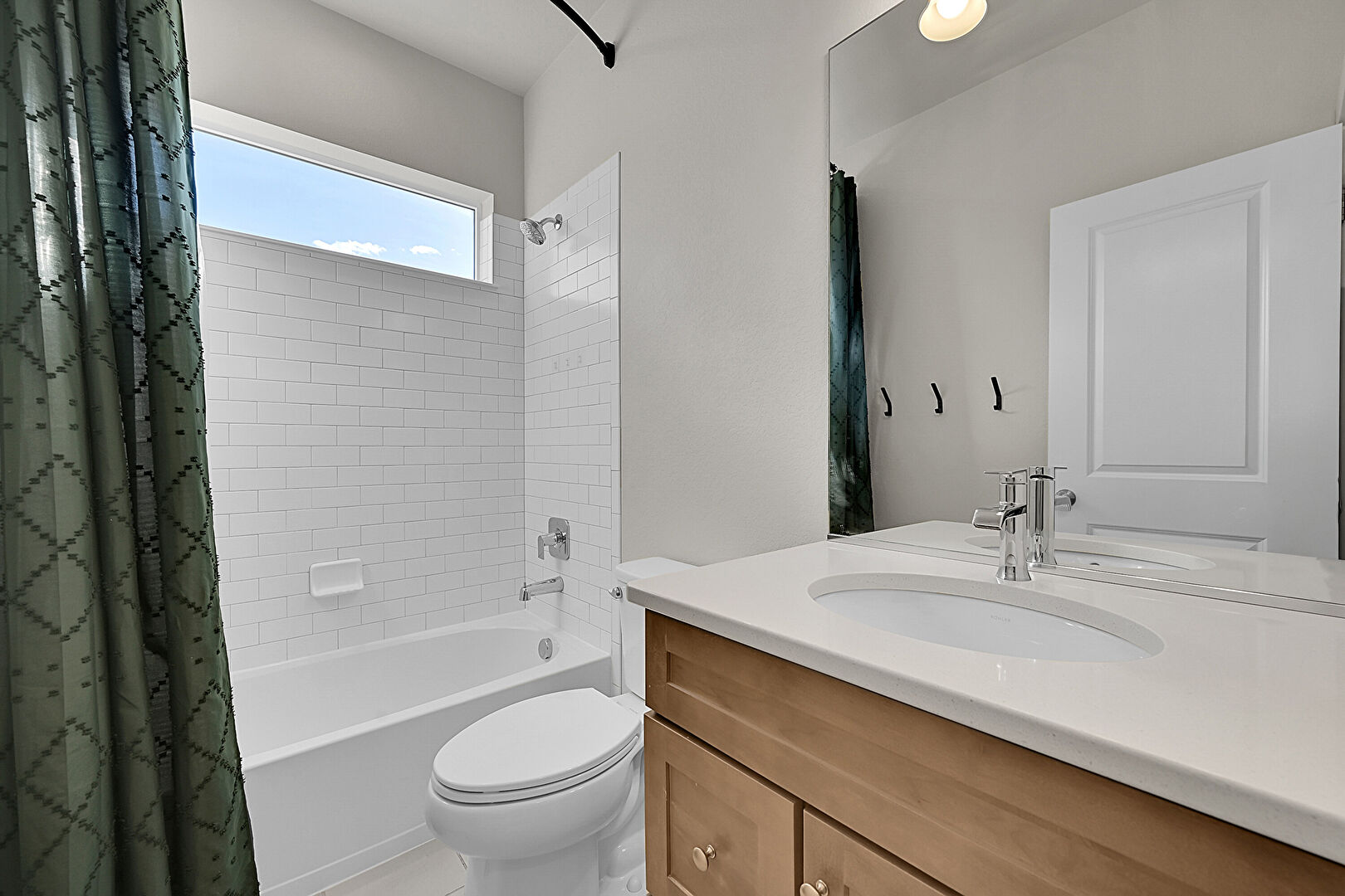 Combined Bath Shower, Drywall, Full Bathroom, Natural Light, Textured Ceiling, Tile Floor, Vanity, Drywall, Vent