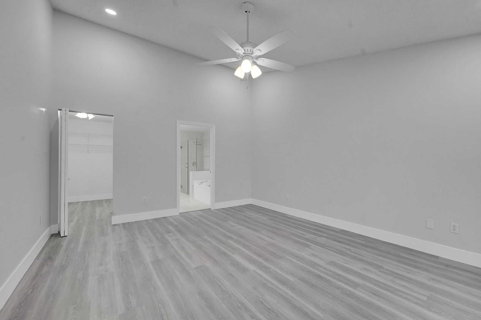 Baseboards Wall, Ceiling Fan, Drywall, High Ceiling, Natural Light, Vaulted Ceiling, Vent, Wood Finish Floor, Ceiling Fan, Recessed Lighting