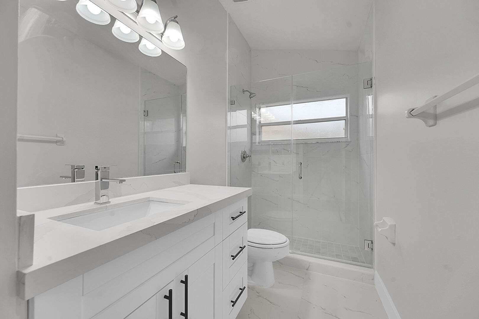 Baseboards Wall, Drywall, Full Bathroom, Marble Finish Floor, Natural Light, Vanity