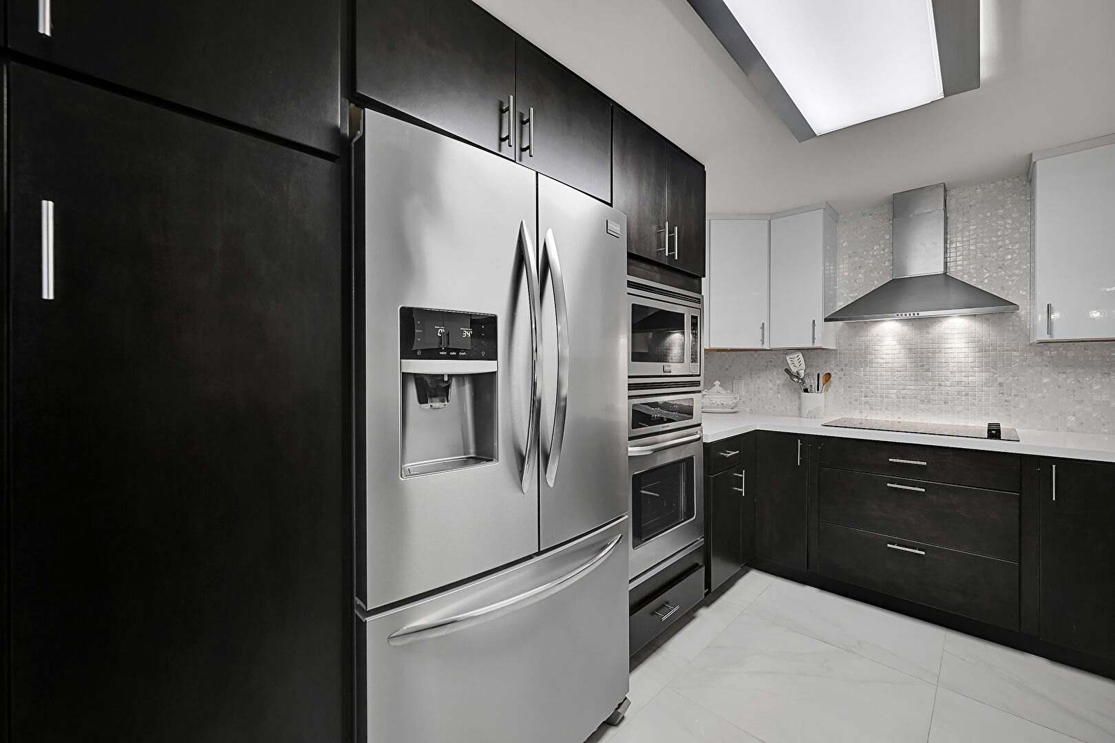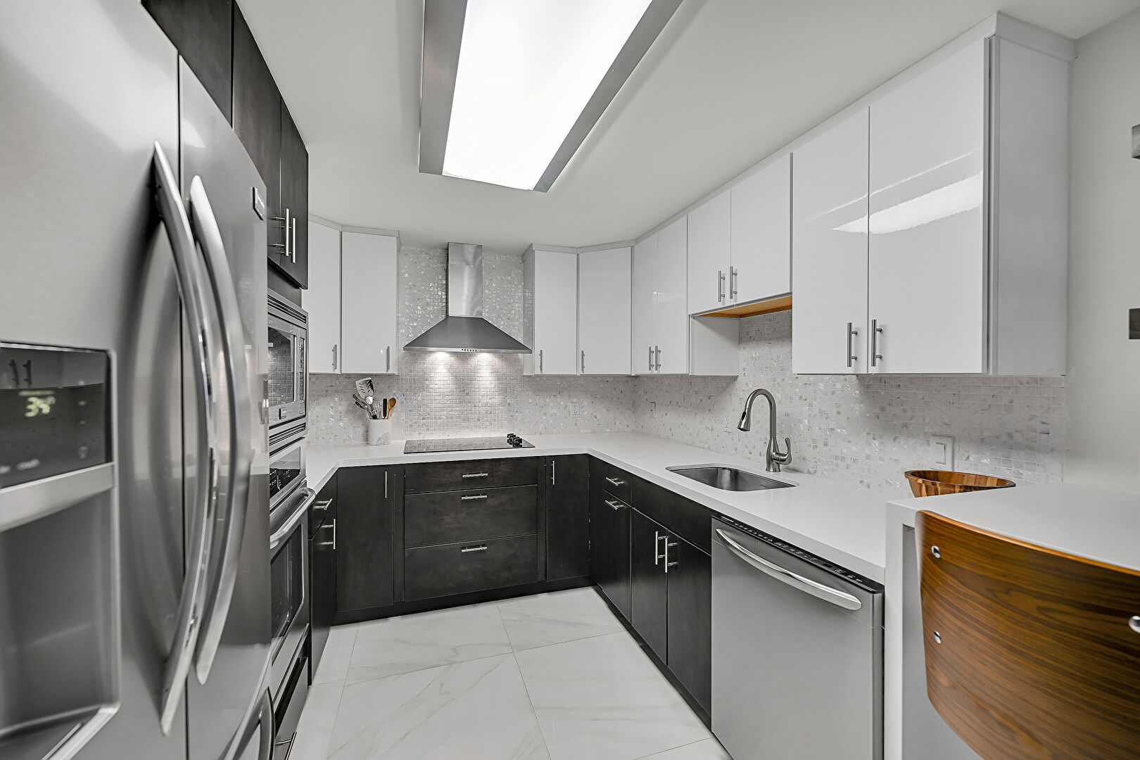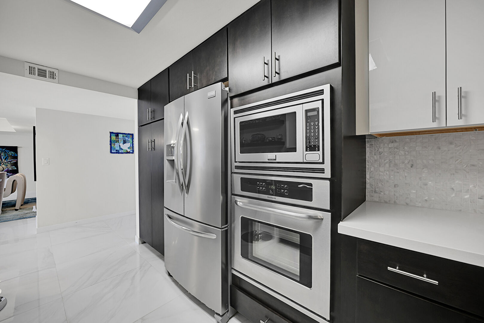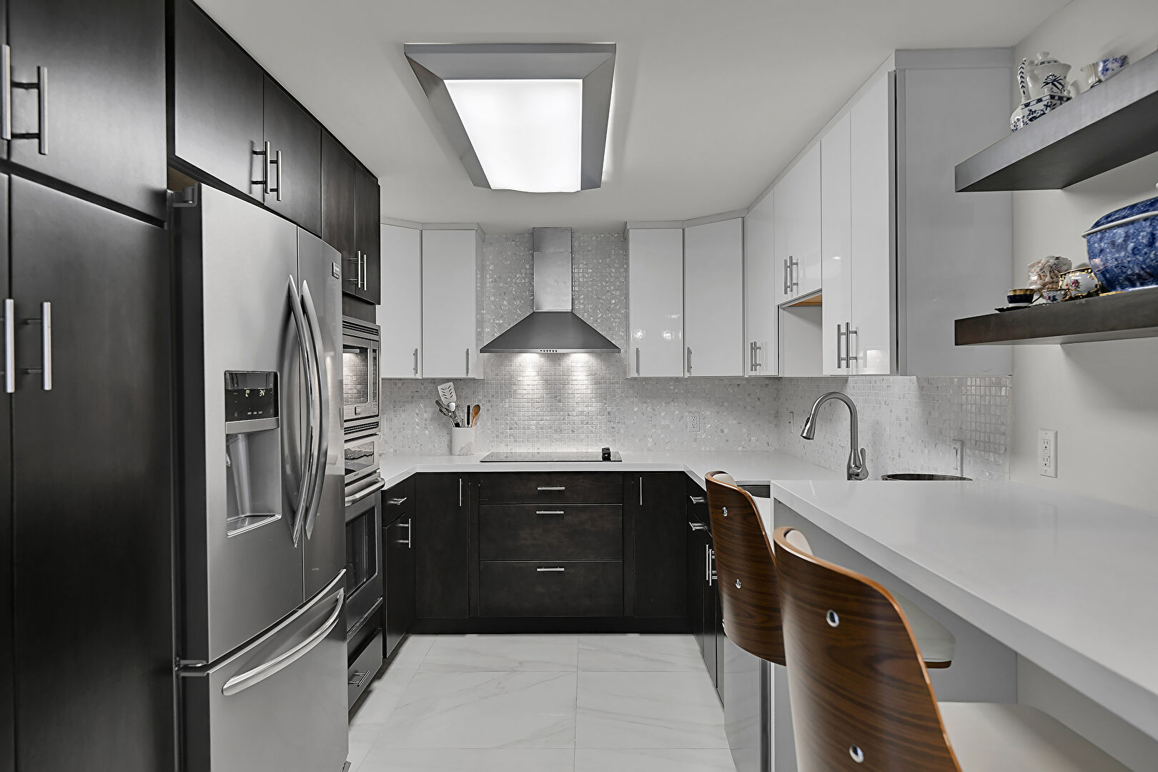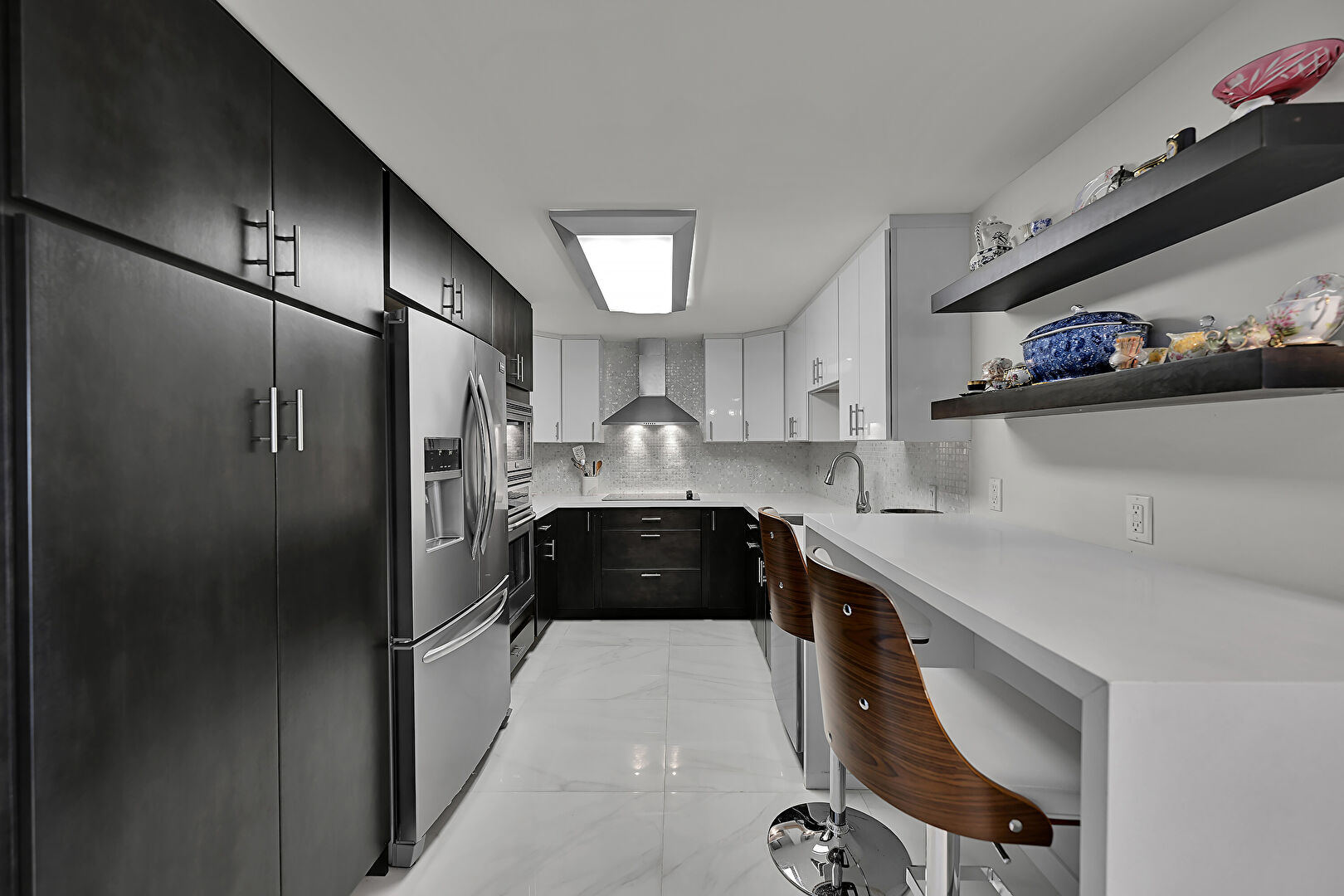 Black Cabinets, Double Oven, Flat Panel Cabinets, Kitchen Bar, Marble Finish Floor, Open Shelves, Stone Countertops, U Shaped Kitchen, Vent, Drywall, Kitchen Bar, Marble Finish Floor, Stone Countertops
