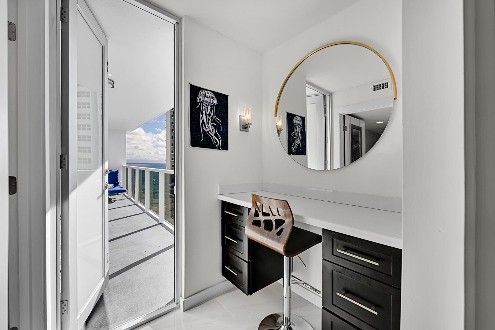 Built In Desk, Drywall, Floor Ceiling Windows, Natural Light, Office Area, Vent, Marble Finish Floor