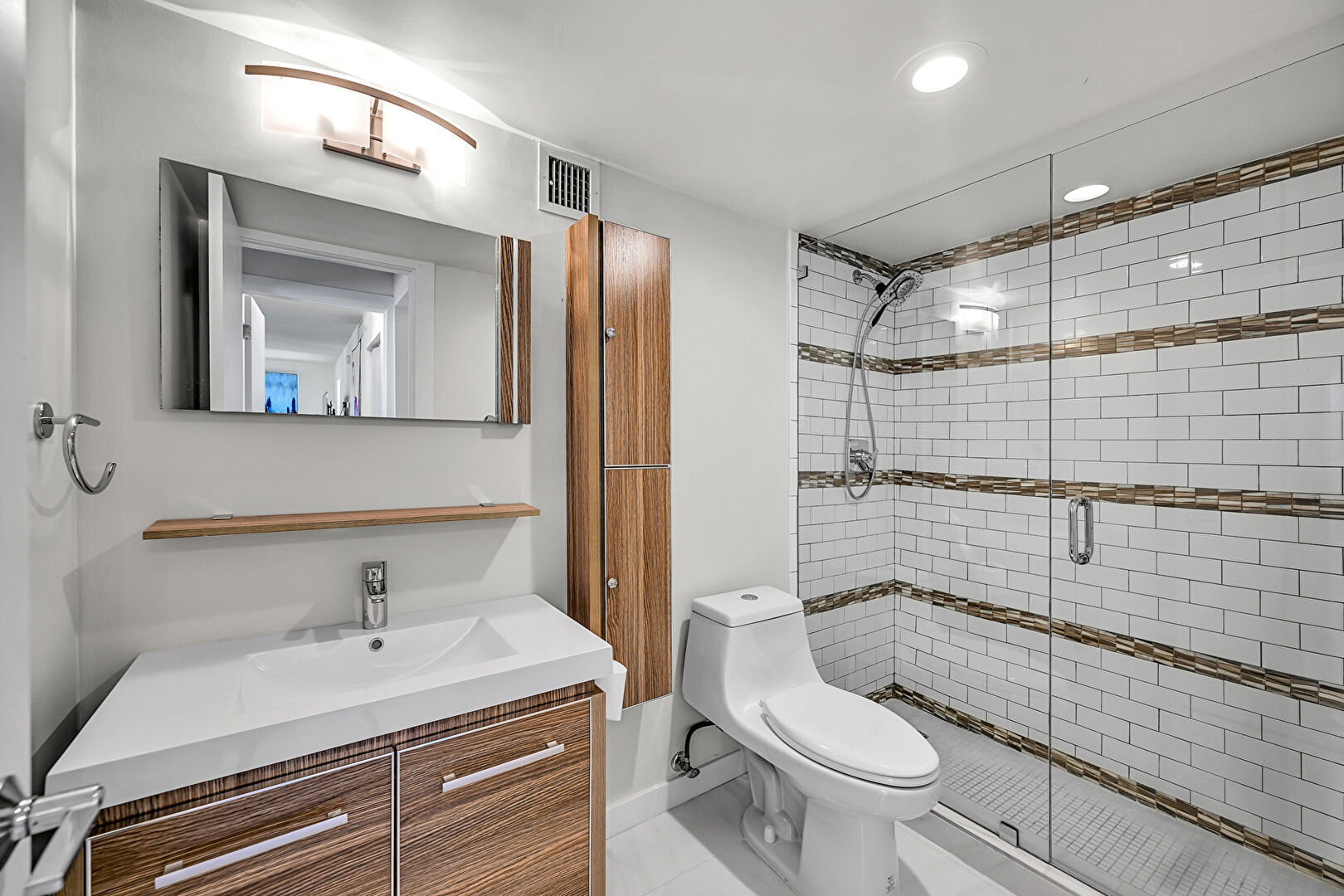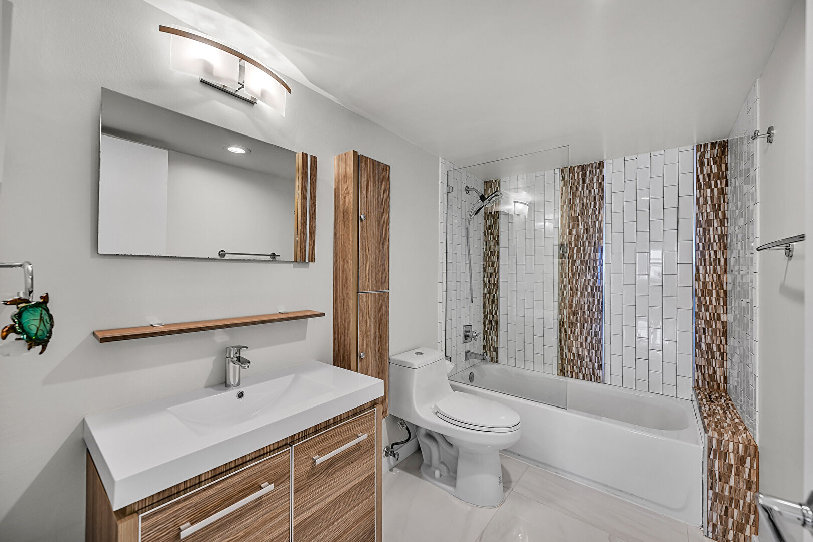 Baseboards Wall, Drywall, Full Bathroom, Recessed Lighting, Tile Floor, Vanity, Vent, Combined Bath Shower, Drywall, Vanity