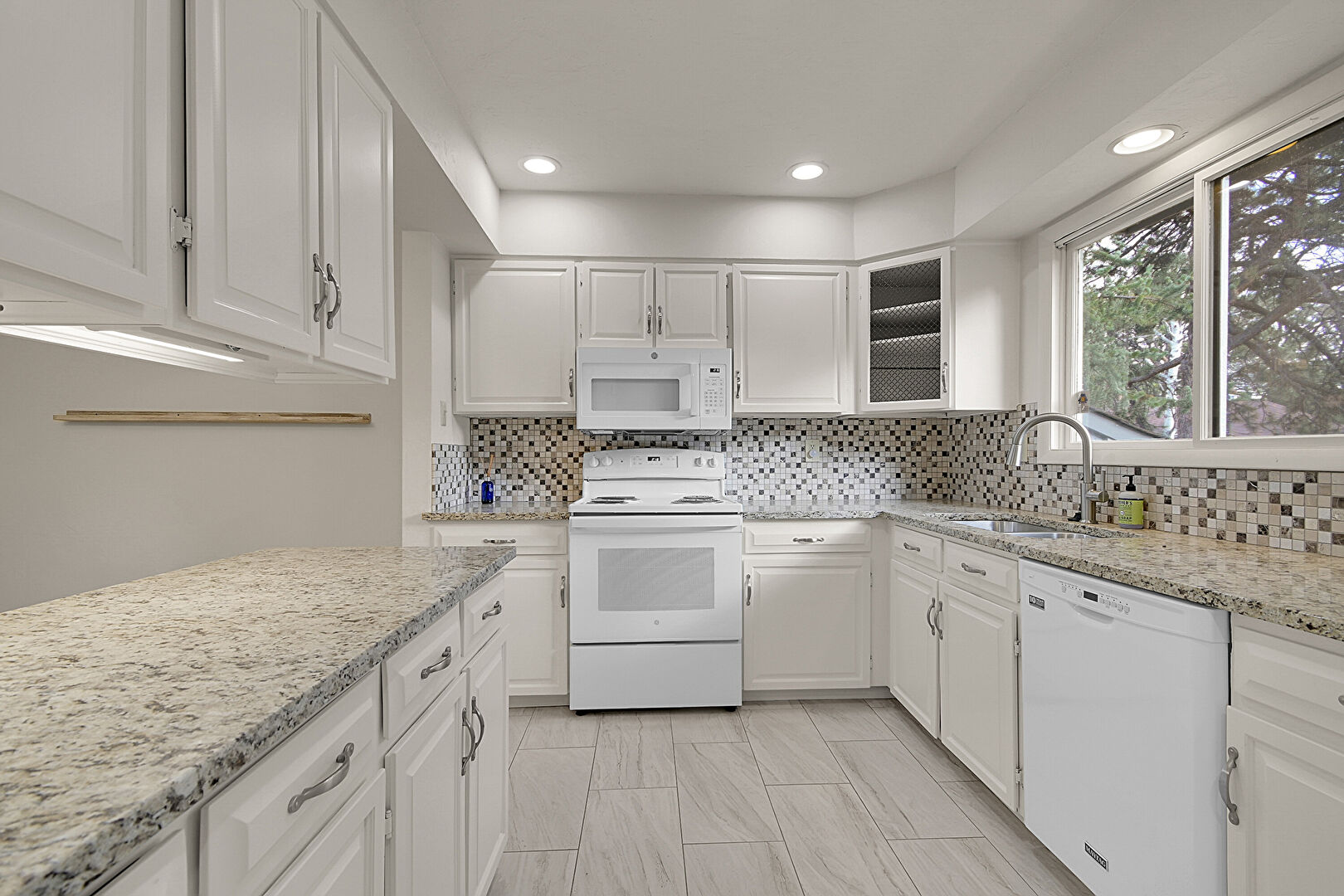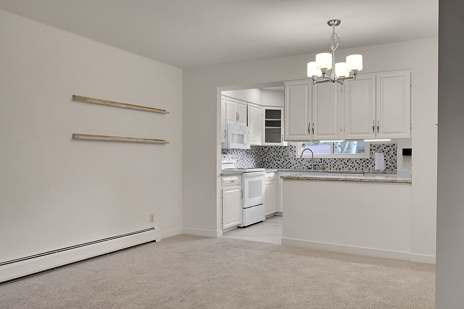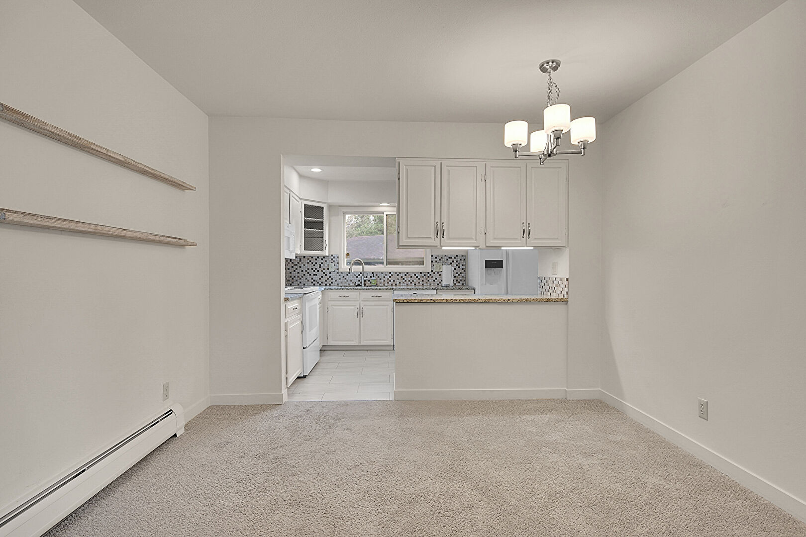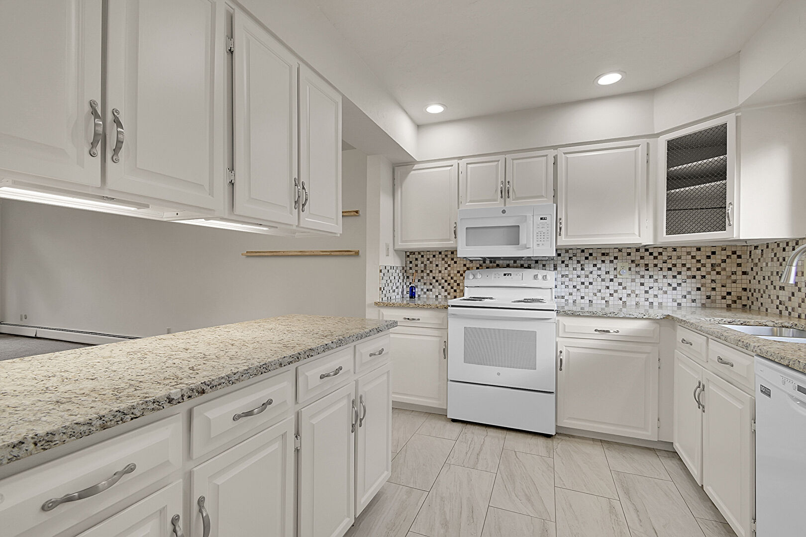 Baseboard Radiator, Baseboards Wall, Carpet, Drywall, Glass Insert Cabinets, Kitchen Peninsula, Marble Finish Floor, Natural Light, Pendant Lighting, Raised Cabinets, Recessed Lighting, Stone Countertops, Tile Floor, Visible Hinge Cabinets, Glass Insert Cabinets, Notable Chandelier, Recessed Lighting, Stone Countertops