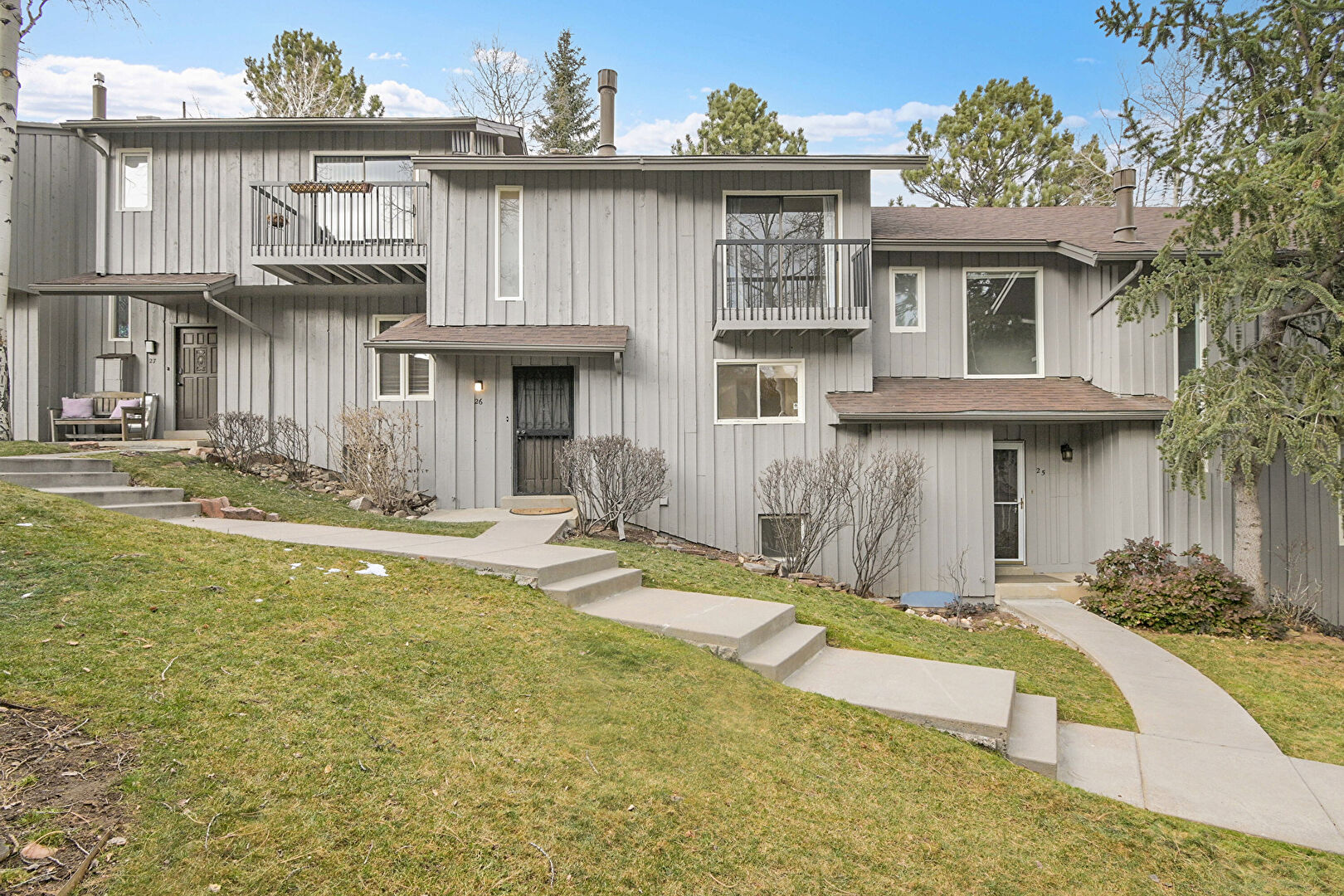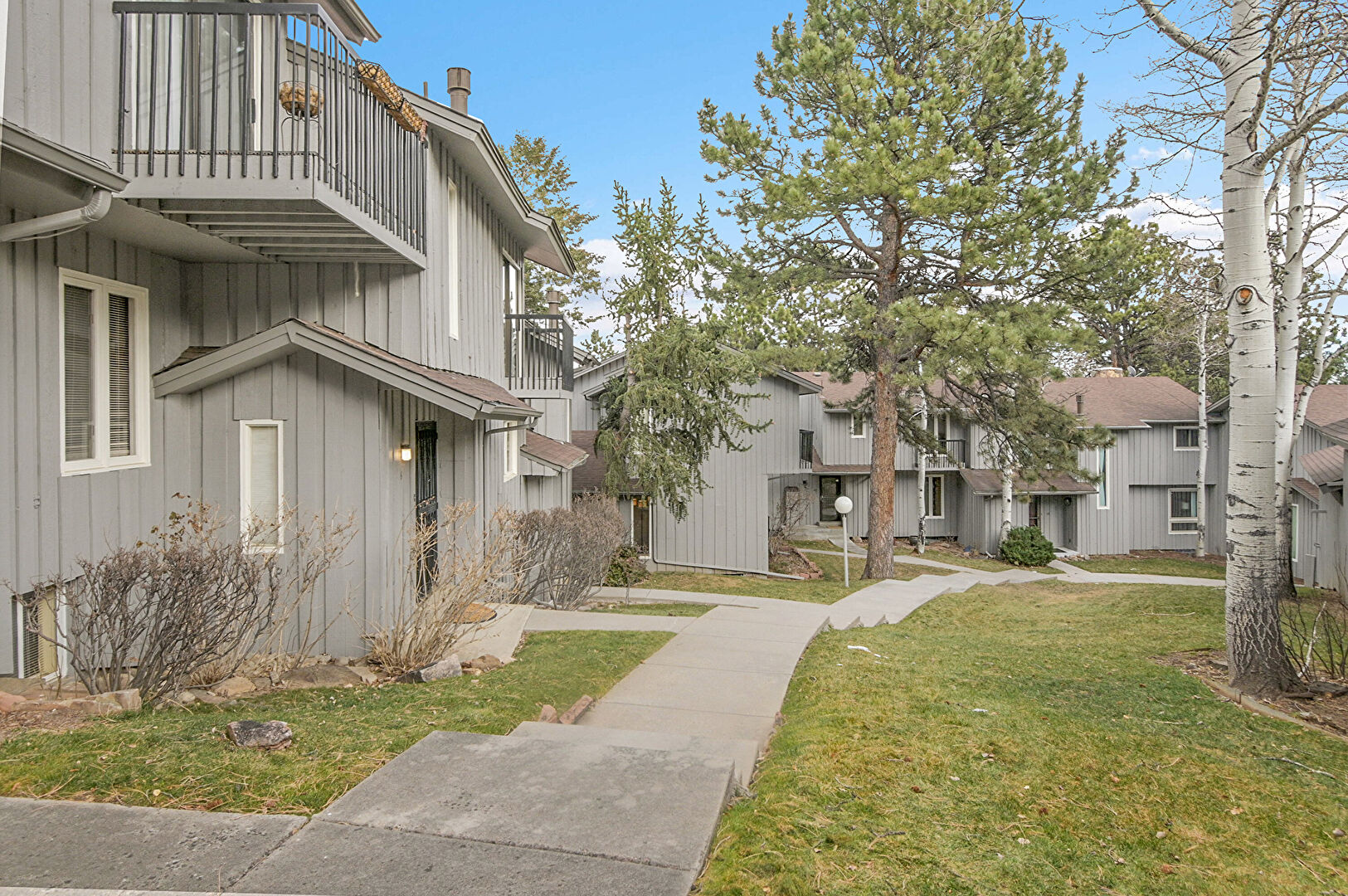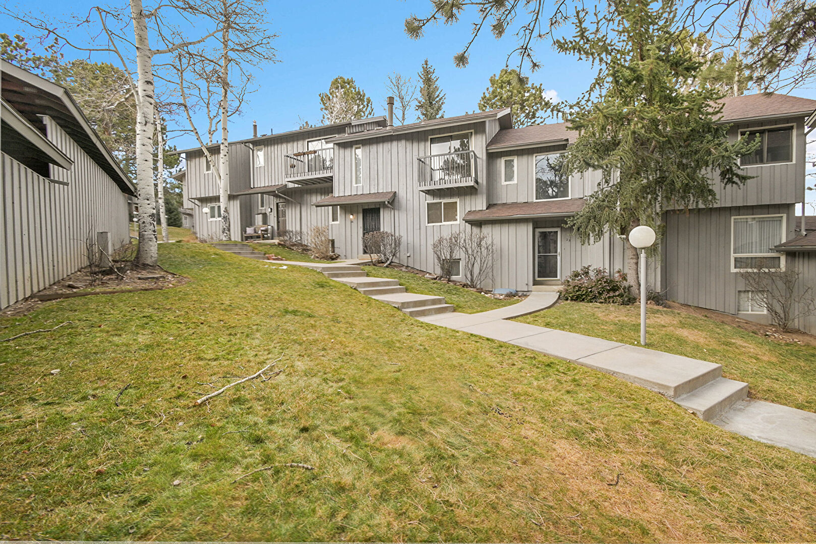 Apartment Complex View, Balcony, Board Batten Siding, Concrete Foundation, Downspout, Gutters, Lawn, Shingle Roof, Stoop, Vertical Siding, Board Batten Siding, Downspout