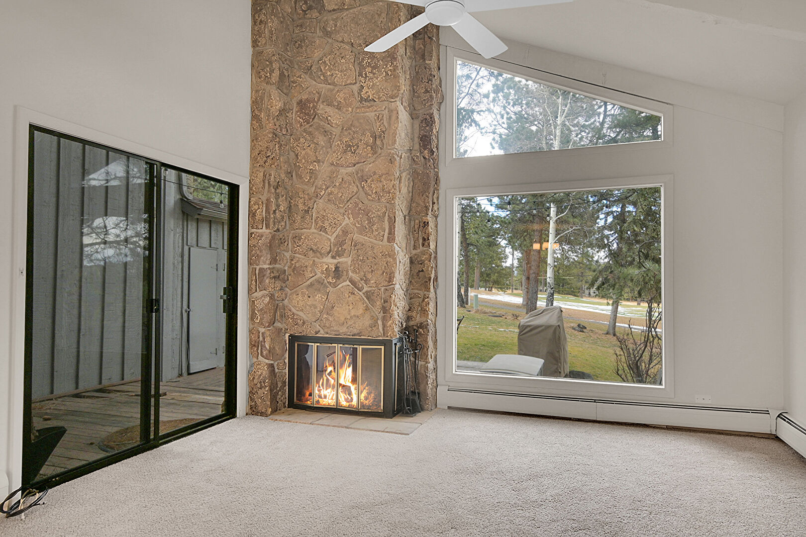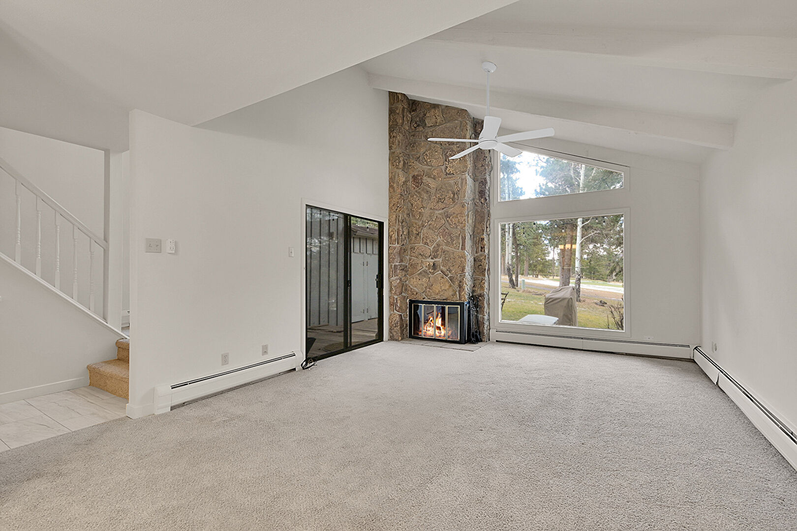 Baseboard Radiator, Baseboards Wall, Carpet, Ceiling Fan, Drywall, Fireplace, High Ceiling, Natural Light, Notable Chandelier, Stairs, Stone Wall, Vaulted Ceiling, Beamed Ceiling, Carpet, Ceiling Fan