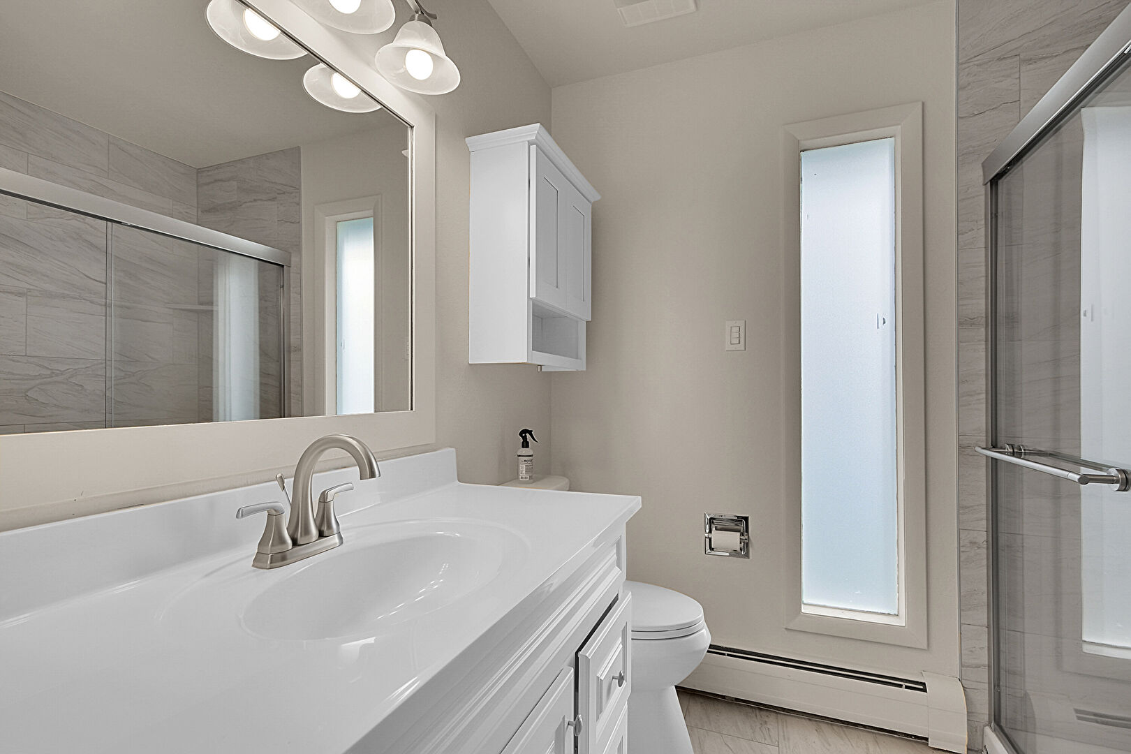 Baseboard Radiator, Baseboards Wall, Drywall, Full Bathroom, Half Bathroom, Marble Finish Floor, Natural Light, Textured Wall, Vanity, Vent, Drywall, Full Bathroom, Vent