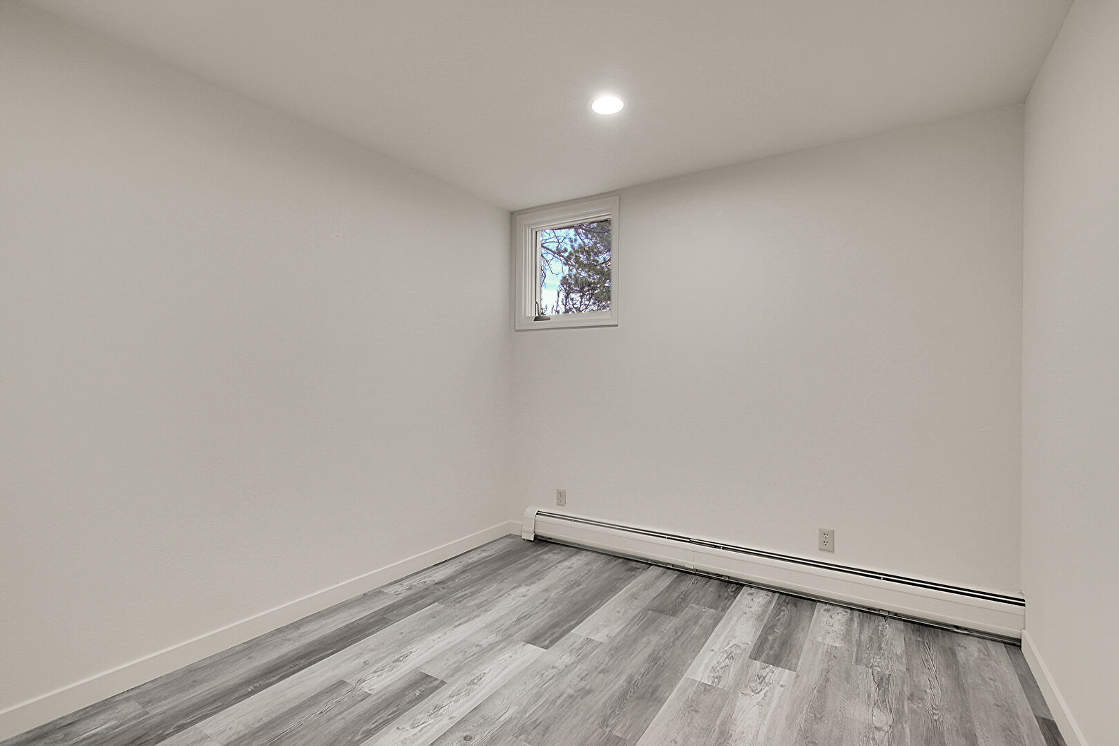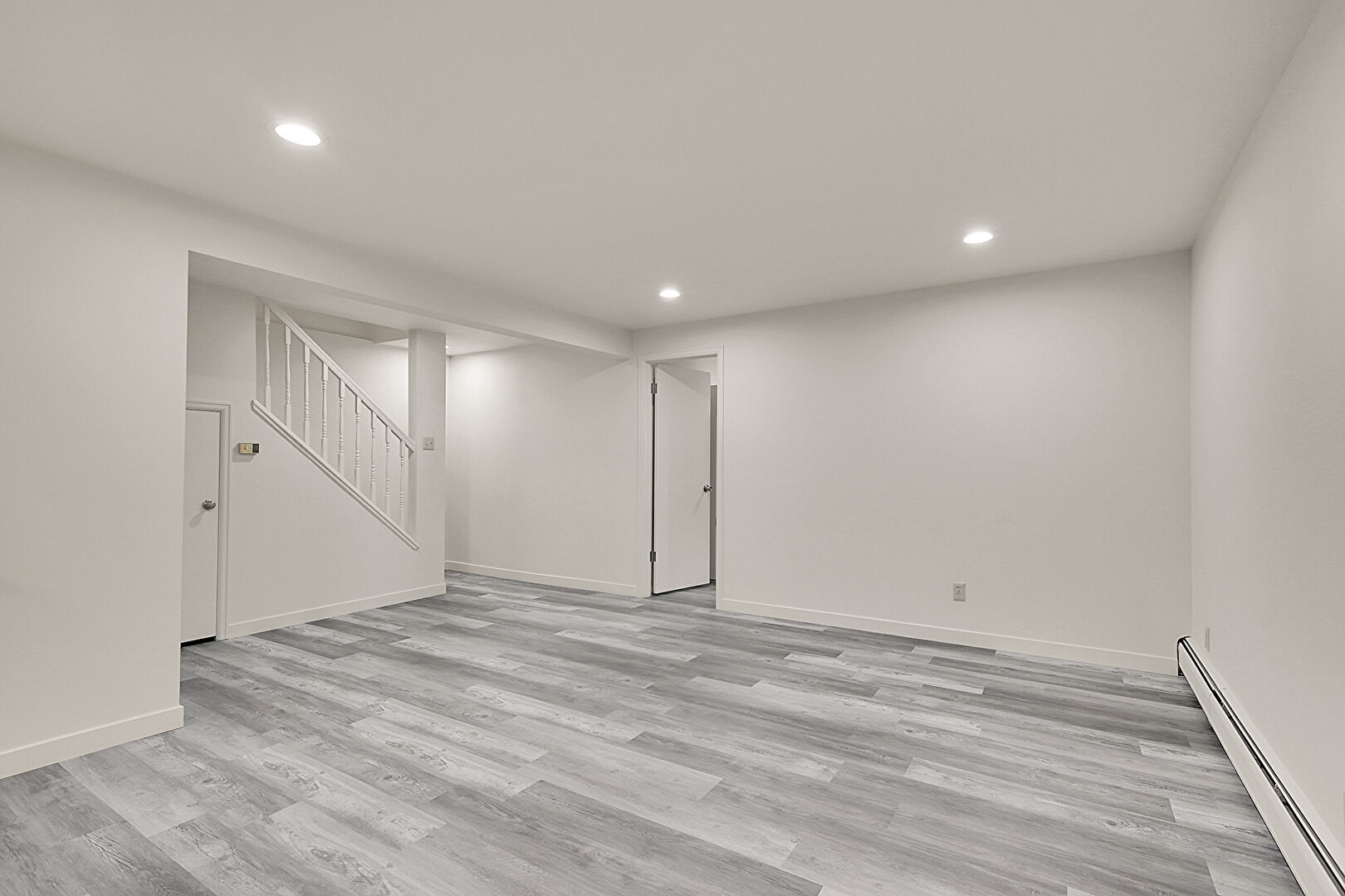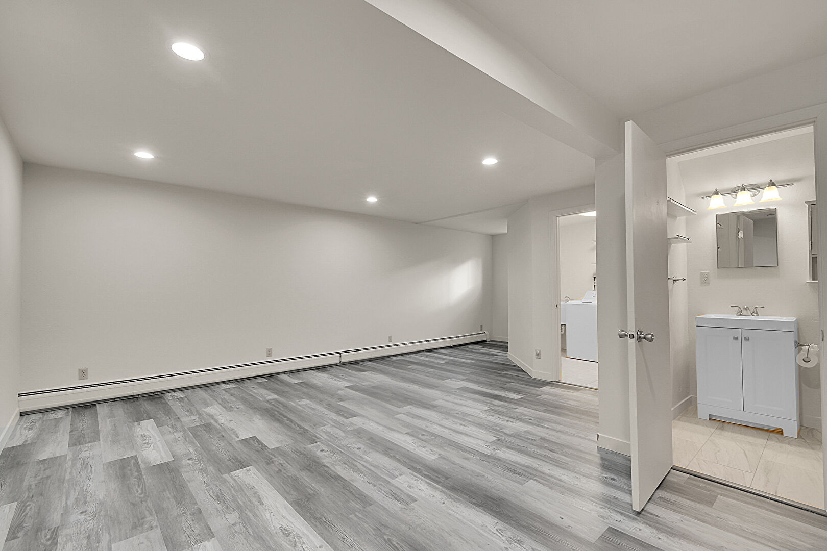 Baseboard Radiator, Baseboards Wall, Basement, Carpet, Drywall, Natural Light, Recessed Lighting, Two Closets, Vaulted Ceiling, High Ceiling, Natural Light, Wood Finish Floor
