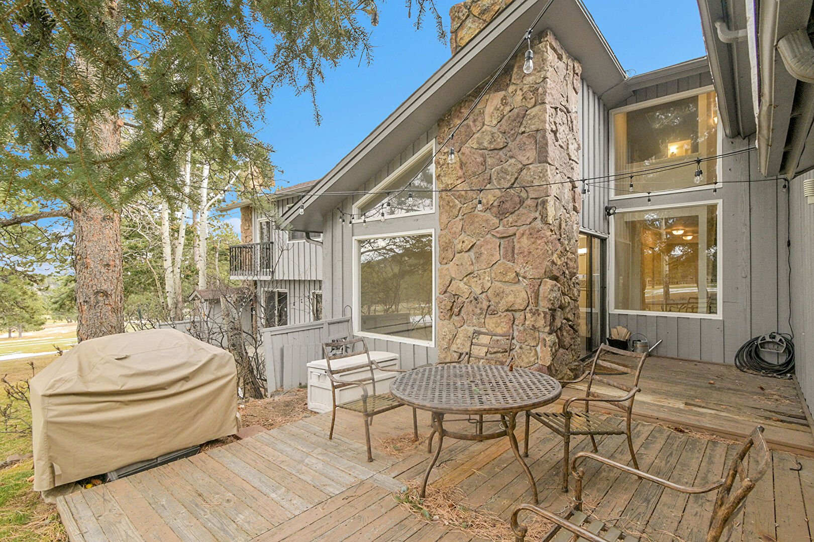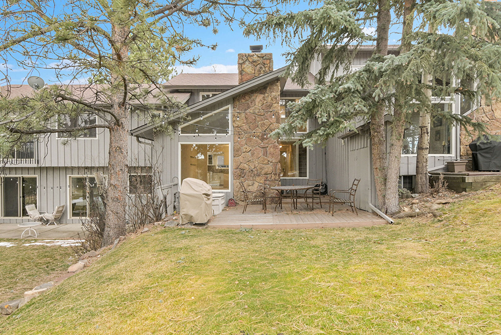 Chimney, Deck, Downspout, Grill, Gutters, Lawn, Satellite Dish, Stone Siding, Vertical Siding, Patio