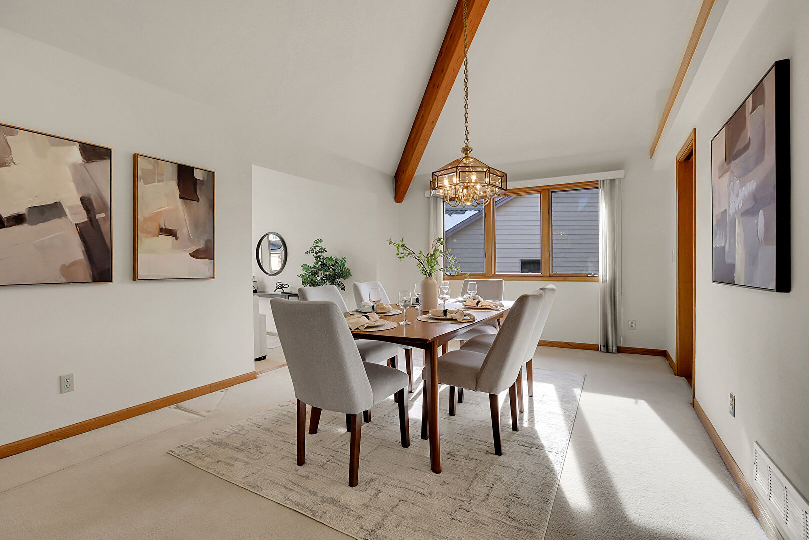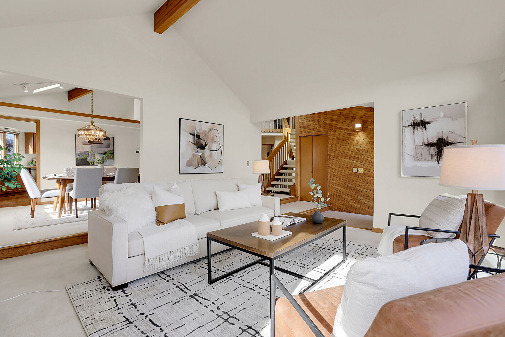 Baseboards Wall, Beamed Ceiling, Carpet, Cathedral Ceiling, Drywall, Natural Light, Notable Chandelier, Stairs, Track Lighting, Vaulted Ceiling, Vent, High Ceiling, Vaulted Ceiling