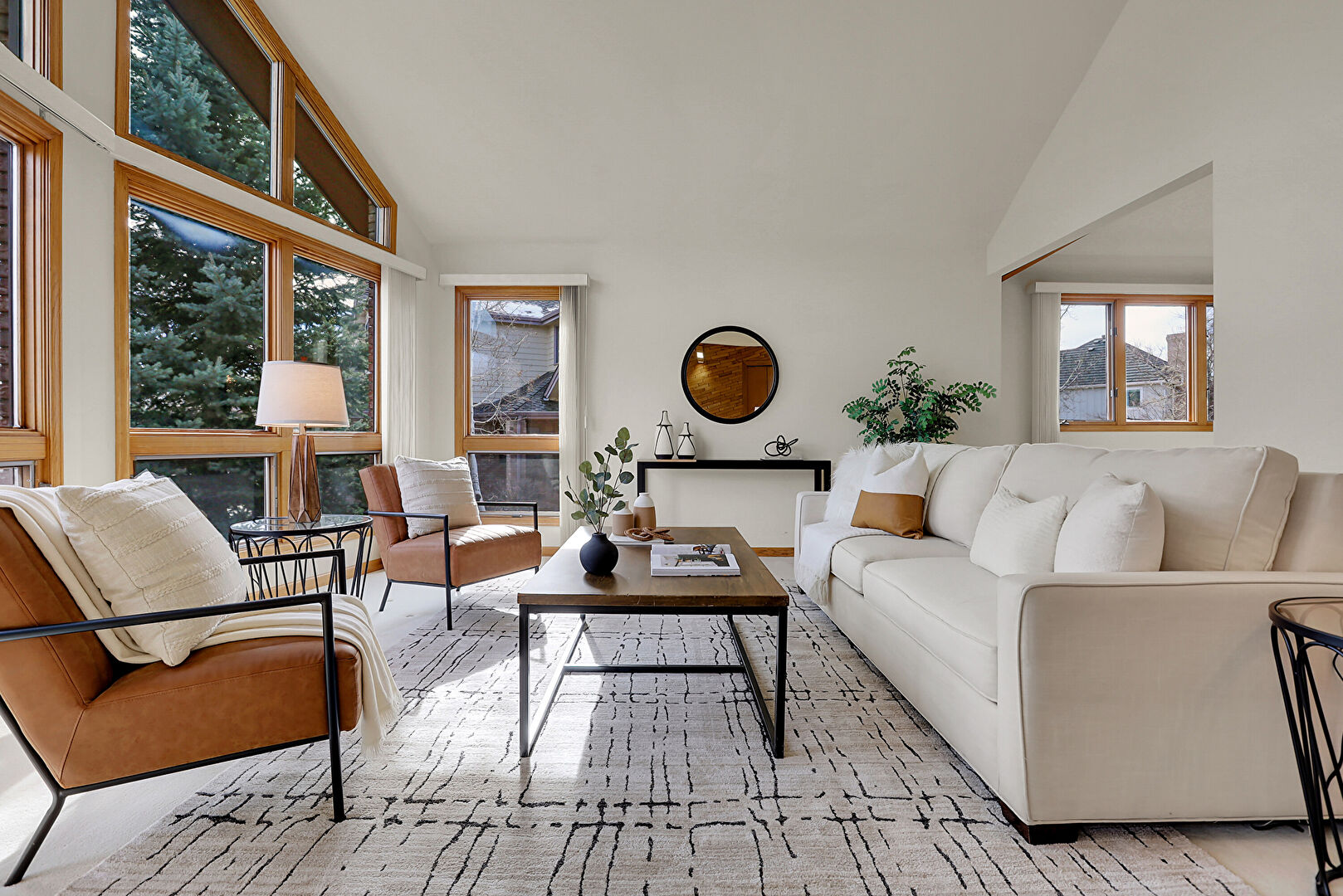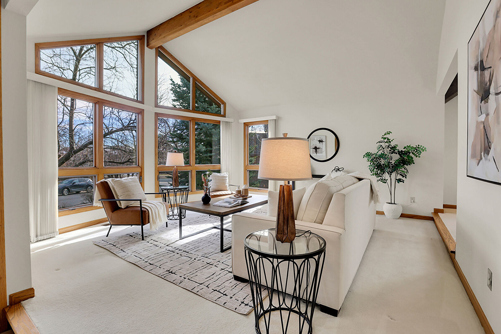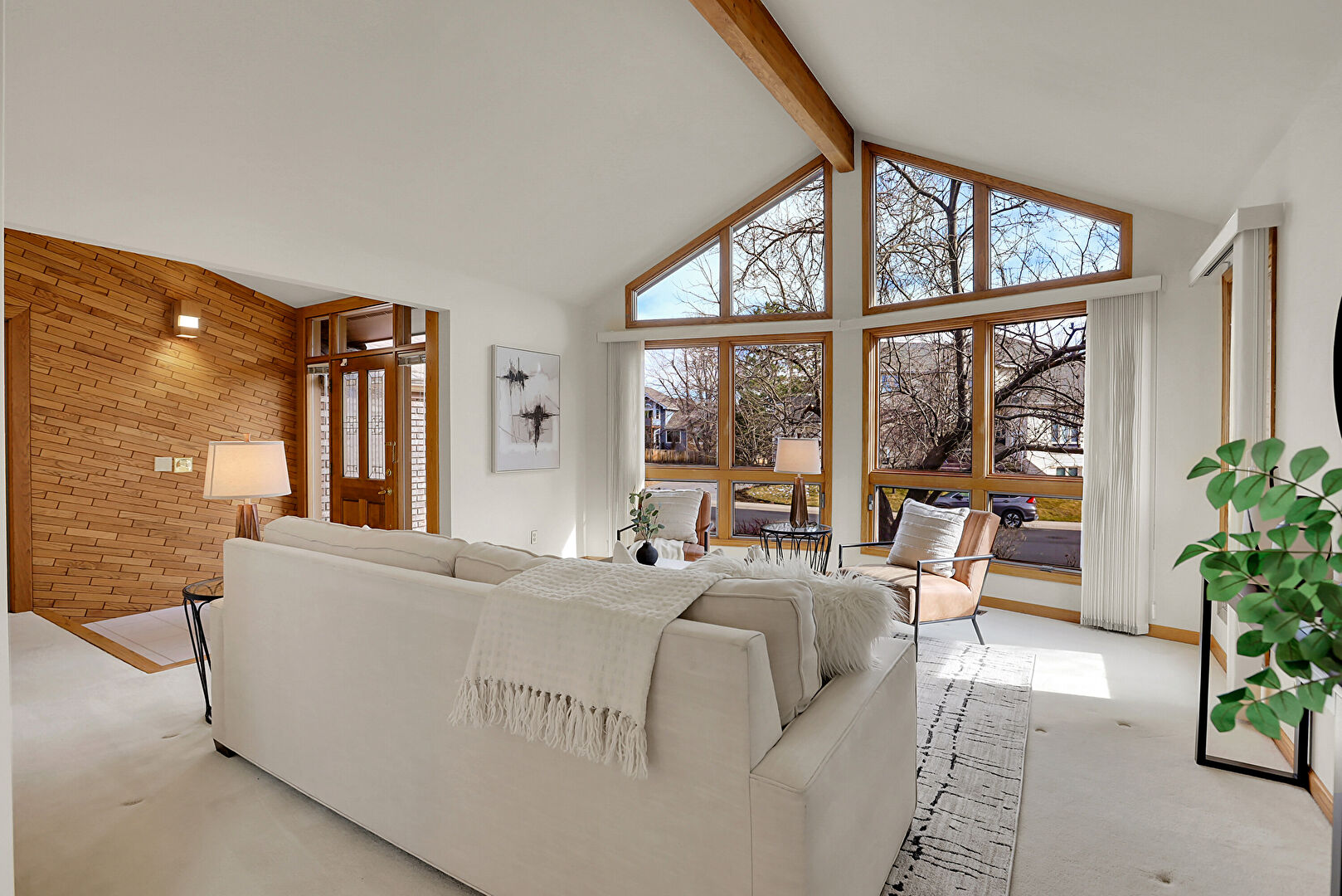 Accent Wall, Baseboards Wall, Beamed Ceiling, Brick Wall, Carpet, Cathedral Ceiling, Drywall, High Ceiling, Natural Light, Notable Chandelier, Sunroom, Vaulted Ceiling, Wood Wall, Cathedral Ceiling, High Ceiling, Stairs, Vaulted Ceiling