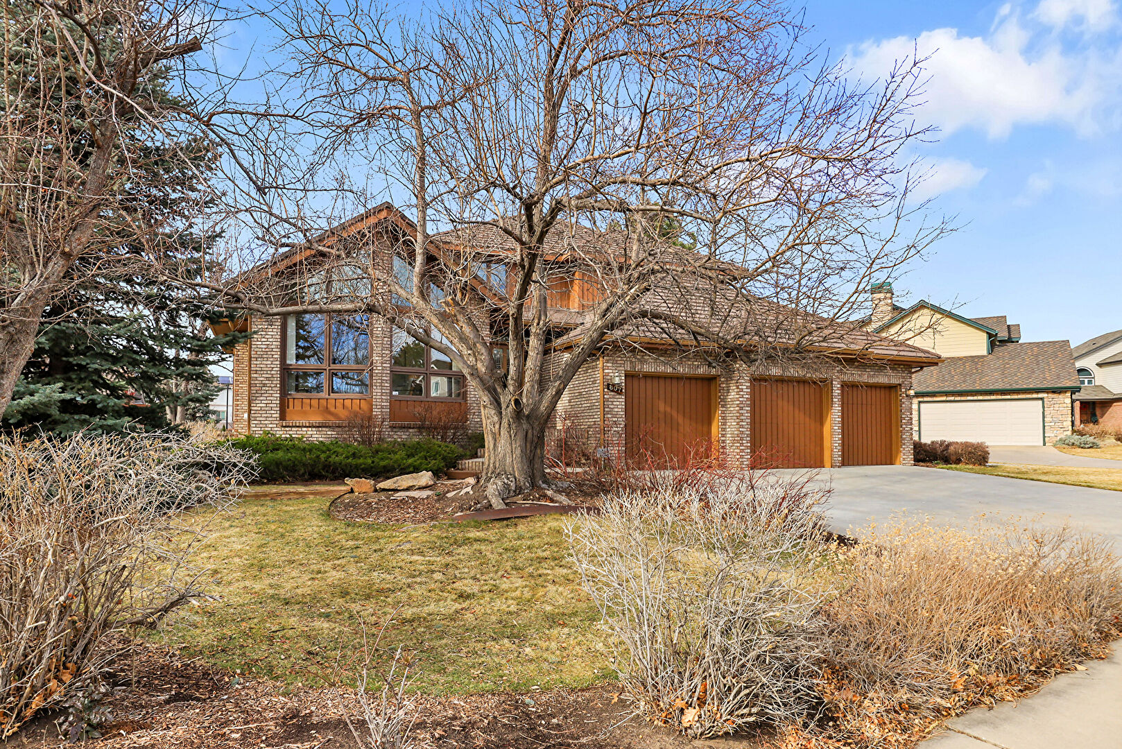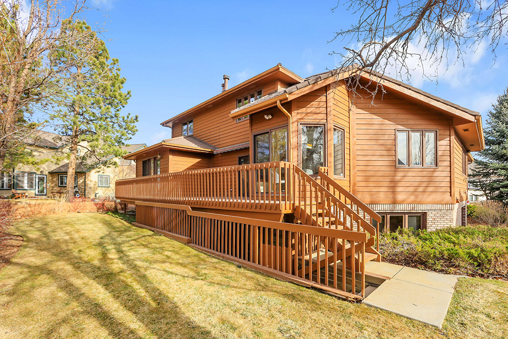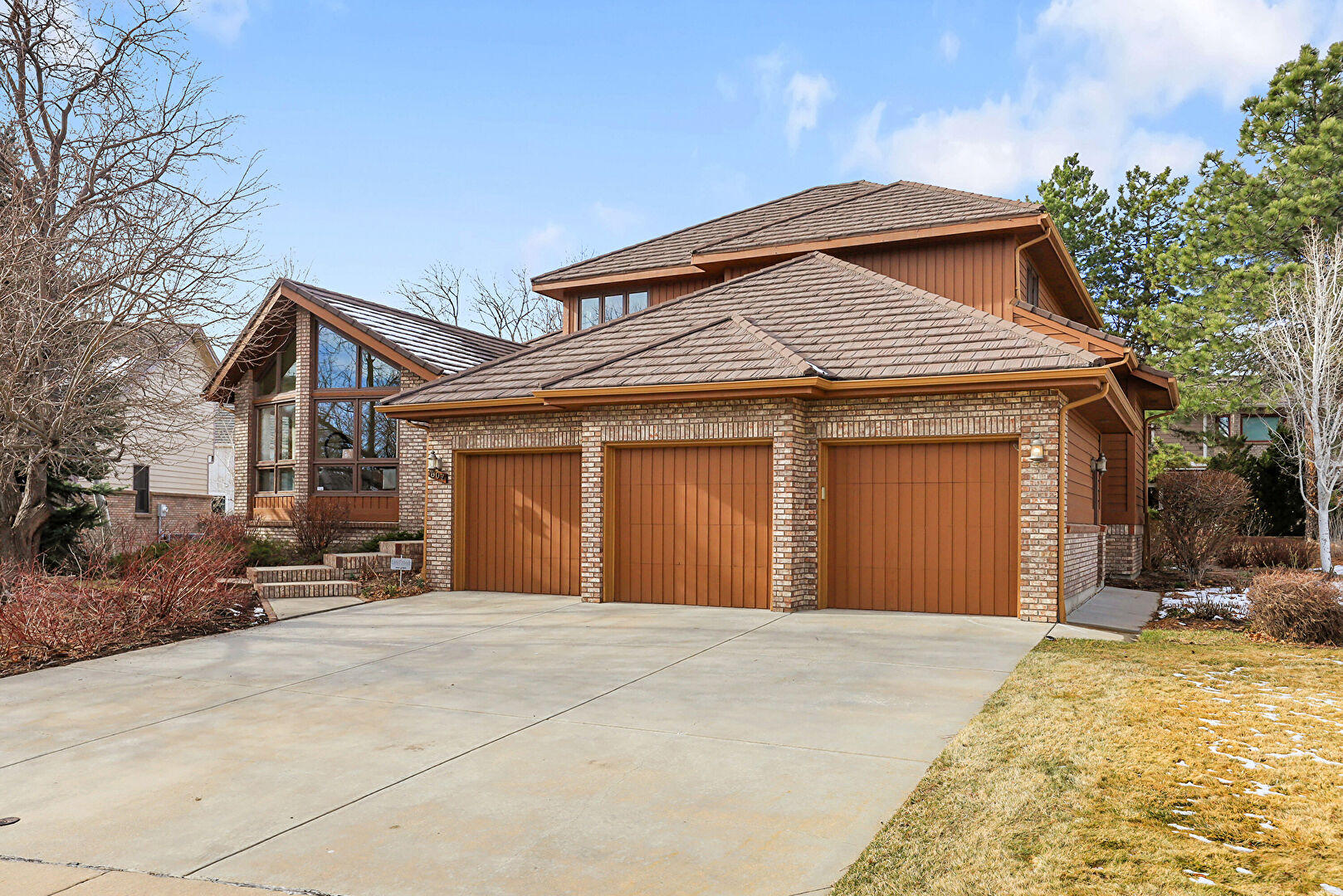 Board Batten Siding, Brick Siding, Concrete Foundation, Downspout, Gutters, Horizontal Siding, Lawn, Stairs, Vertical Siding, Deck, Driveway