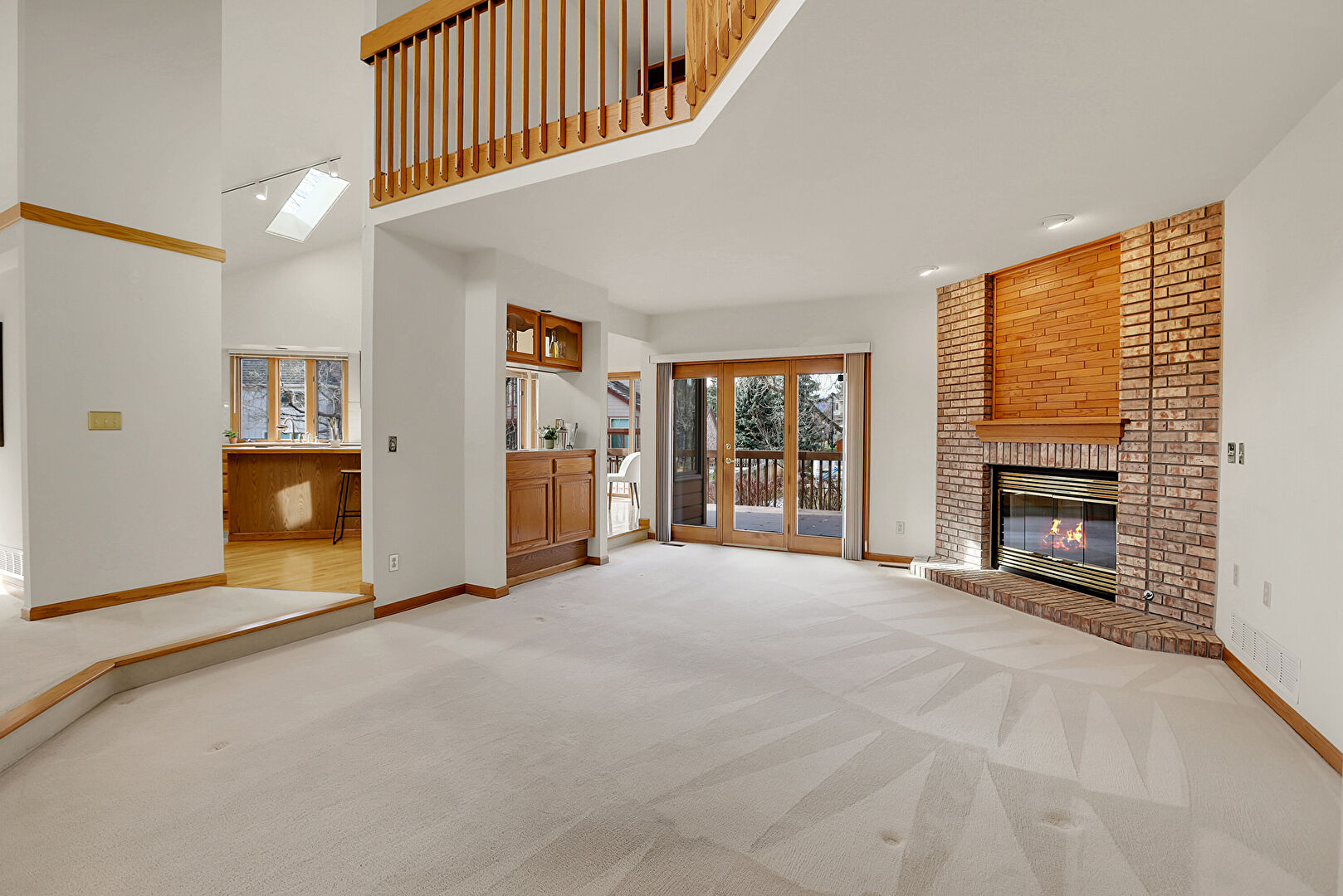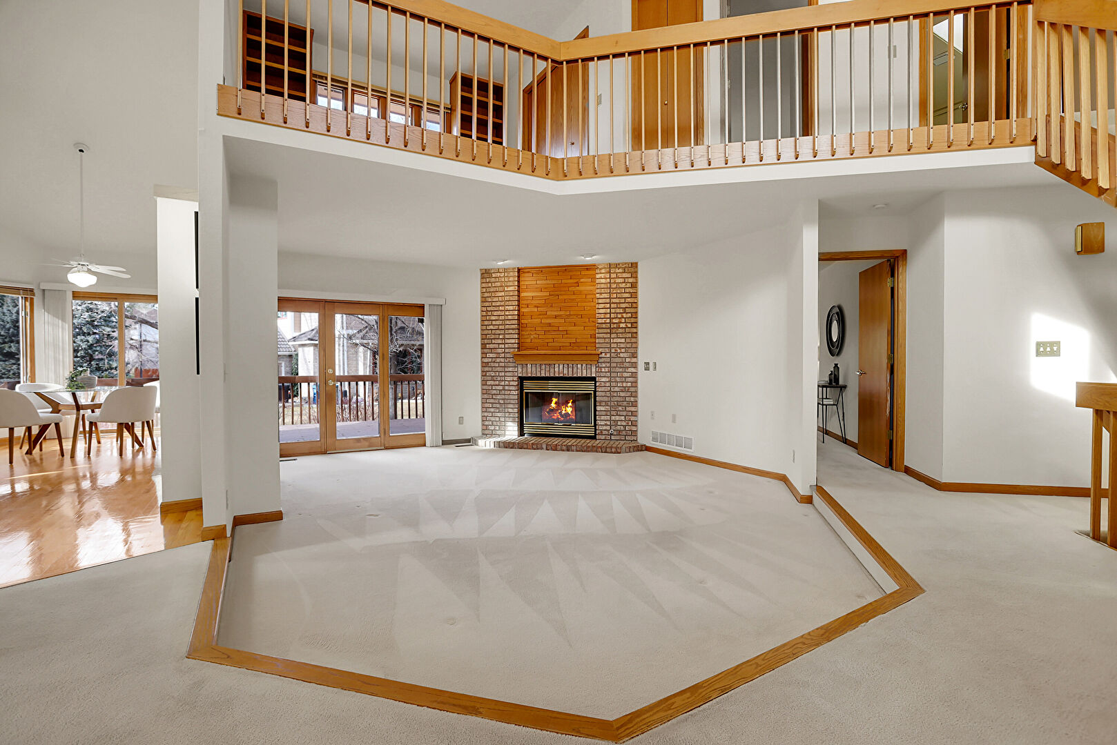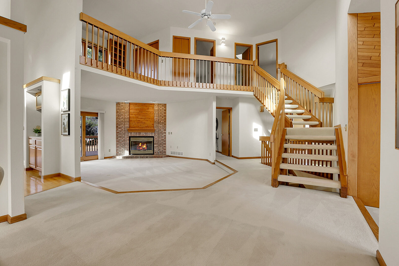 Baseboards Wall, Carpet, Ceiling Fan, Drywall, Fireplace, French Doors, High Ceiling, Natural Light, Notable Chandelier, Recessed Lighting, Stairs, Vent, Carpet, Drywall, Fireplace, Stairs