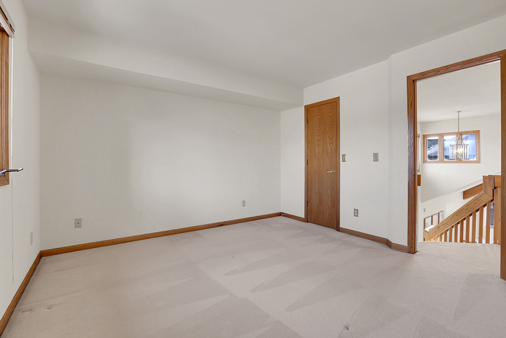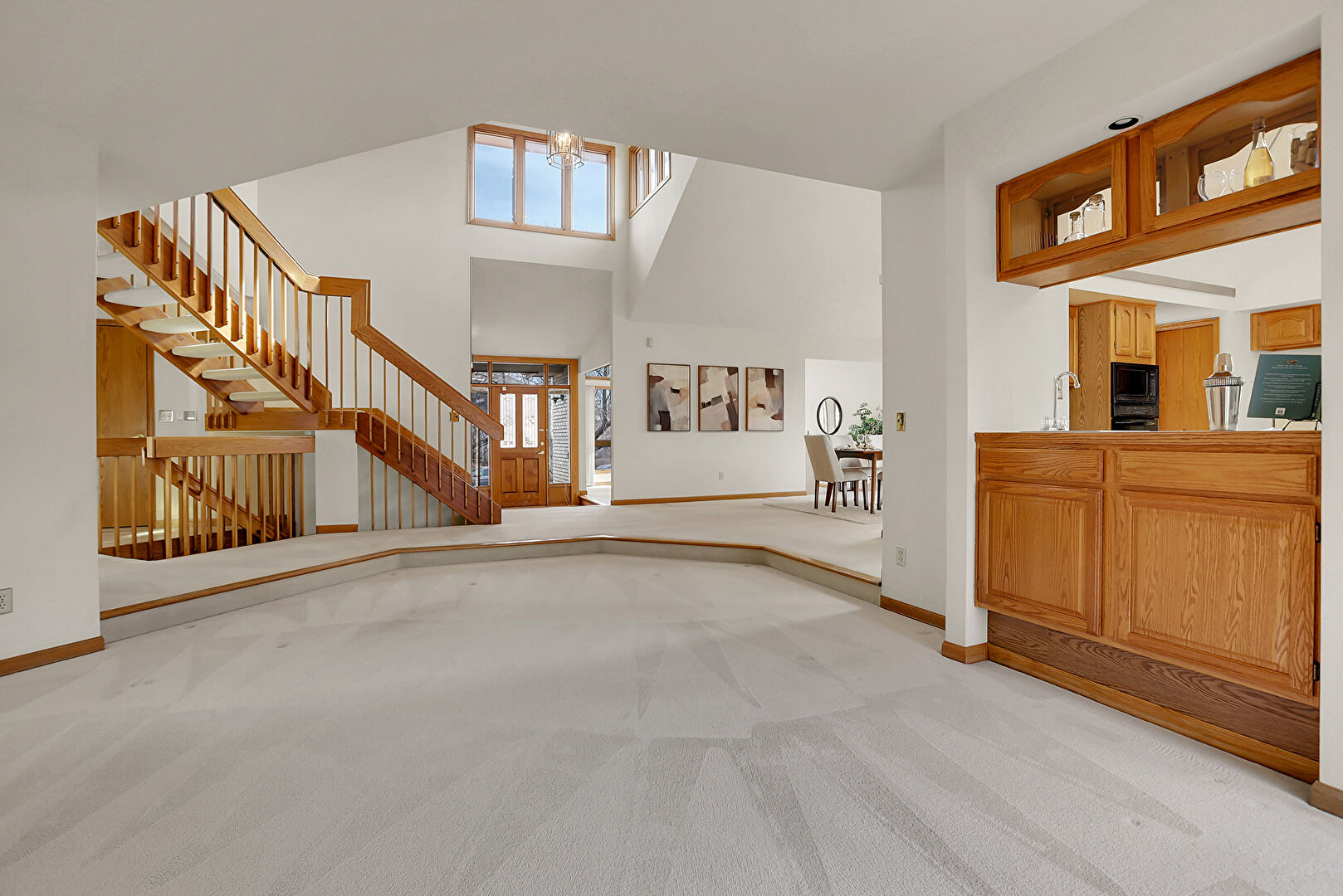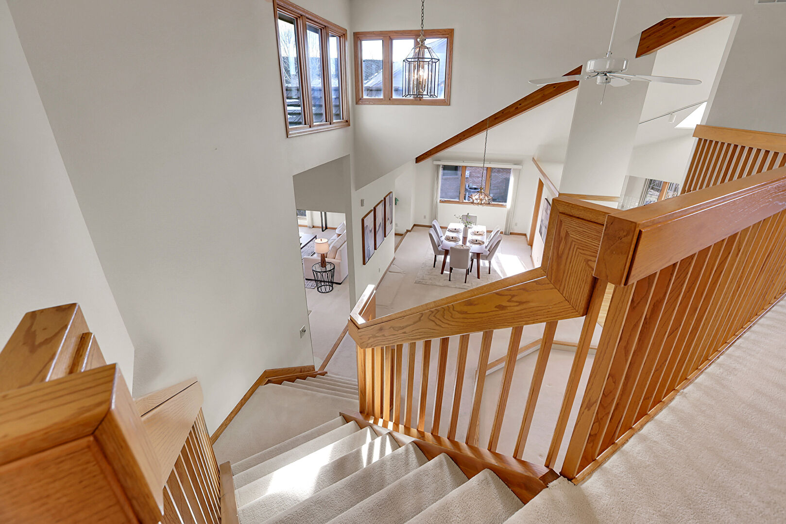 Baseboards Wall, Ceiling Fan, Drywall, High Ceiling, Natural Light, Notable Chandelier, Stairs, Carpet
