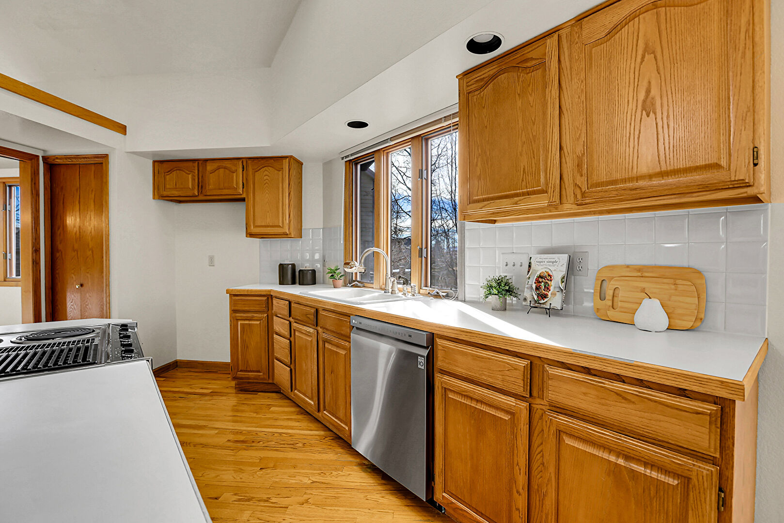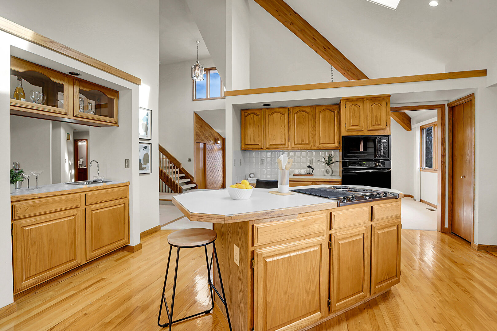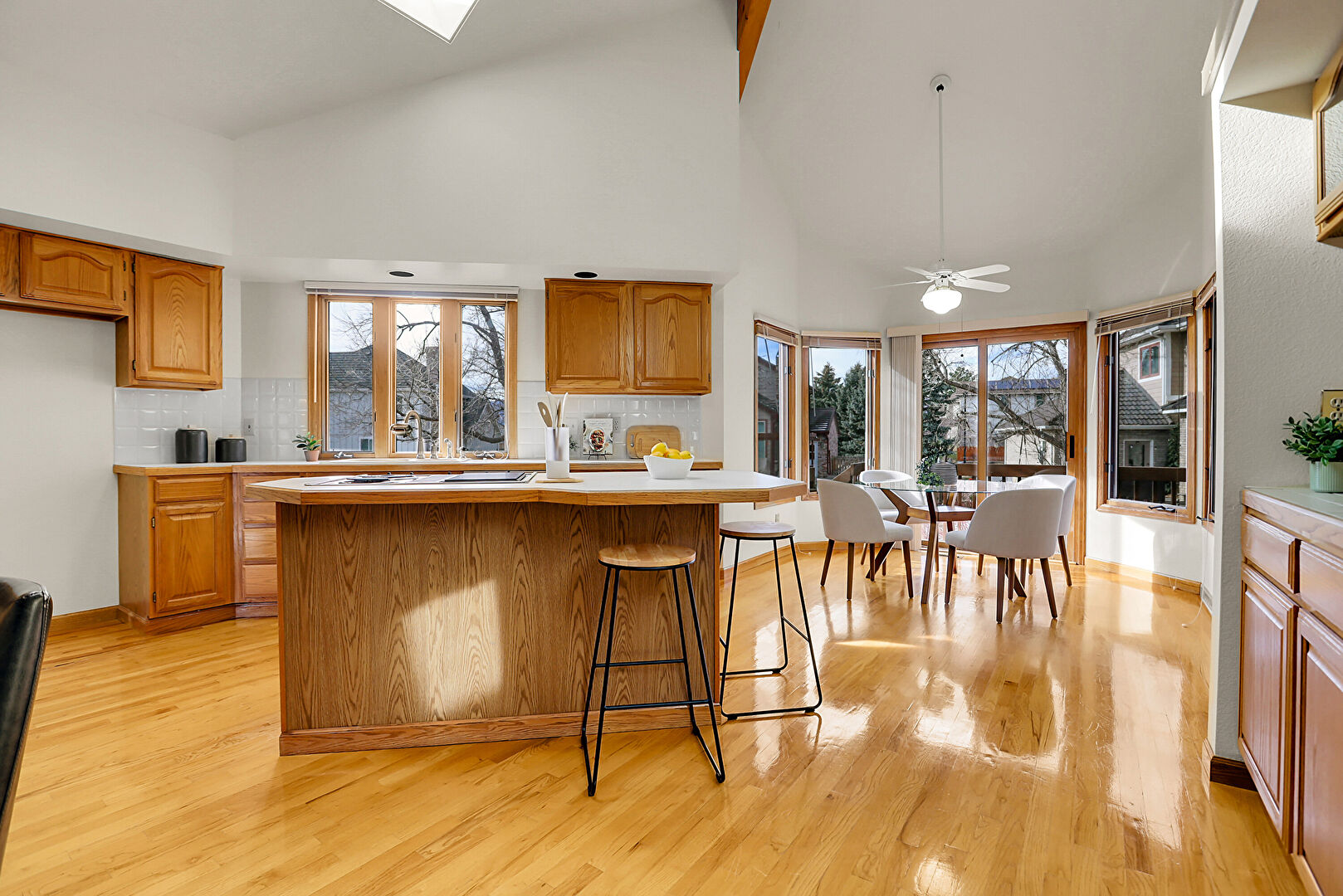 Arched Cabinets, Baseboards Wall, Beamed Ceiling, Built In Desk, Ceiling Fan, Drywall, Glass Insert Cabinets, High Ceiling, Kitchen Bar, Kitchen Island, Medium Brown Cabinets, Natural Light, Notable Chandelier, Office Area, Pendant Lighting, Raised Cabinets, Residential View, Skylight, Sunroom, U Shaped Kitchen, Vaulted Ceiling, Visible Hinge Cabinets, Wood Finish Floor, Arched Cabinets, Baseboards Wall, Drywall, Natural Light, Vaulted Ceiling