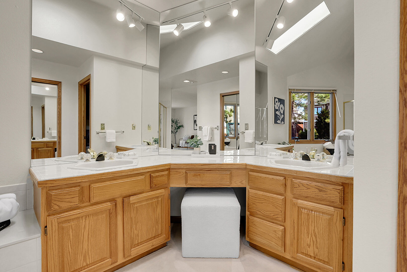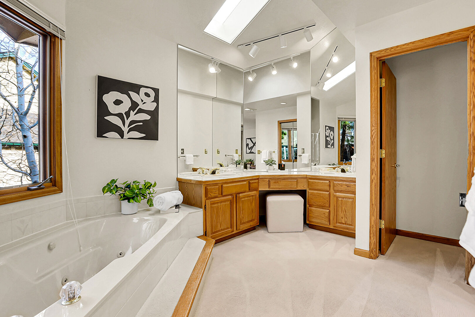 Baseboards Wall, Carpet, Double Vanity, Drywall, Ensuite Bathroom, Full Bathroom, High Ceiling, Natural Light, Recessed Lighting, Skylight, Vanity, Vaulted Ceiling, Vent, Full Bathroom, Track Lighting, Vaulted Ceiling