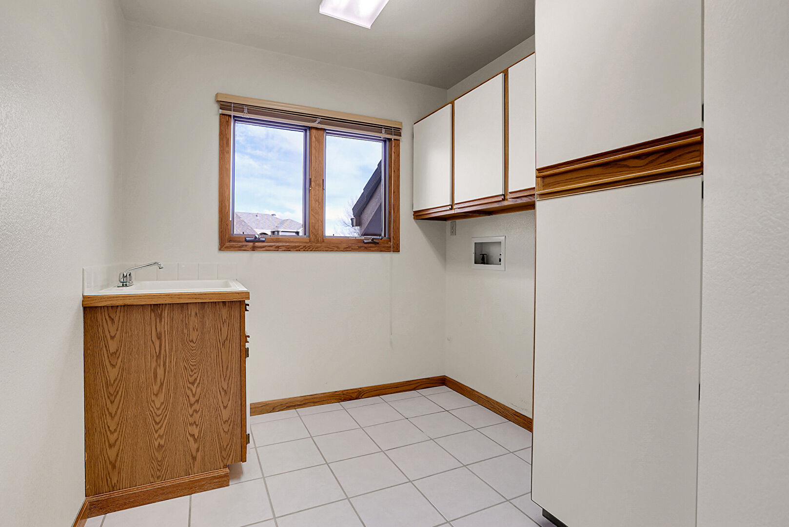 Drywall, Laundry, Natural Light, Tile Floor, Washer Hookup, Baseboards Wall