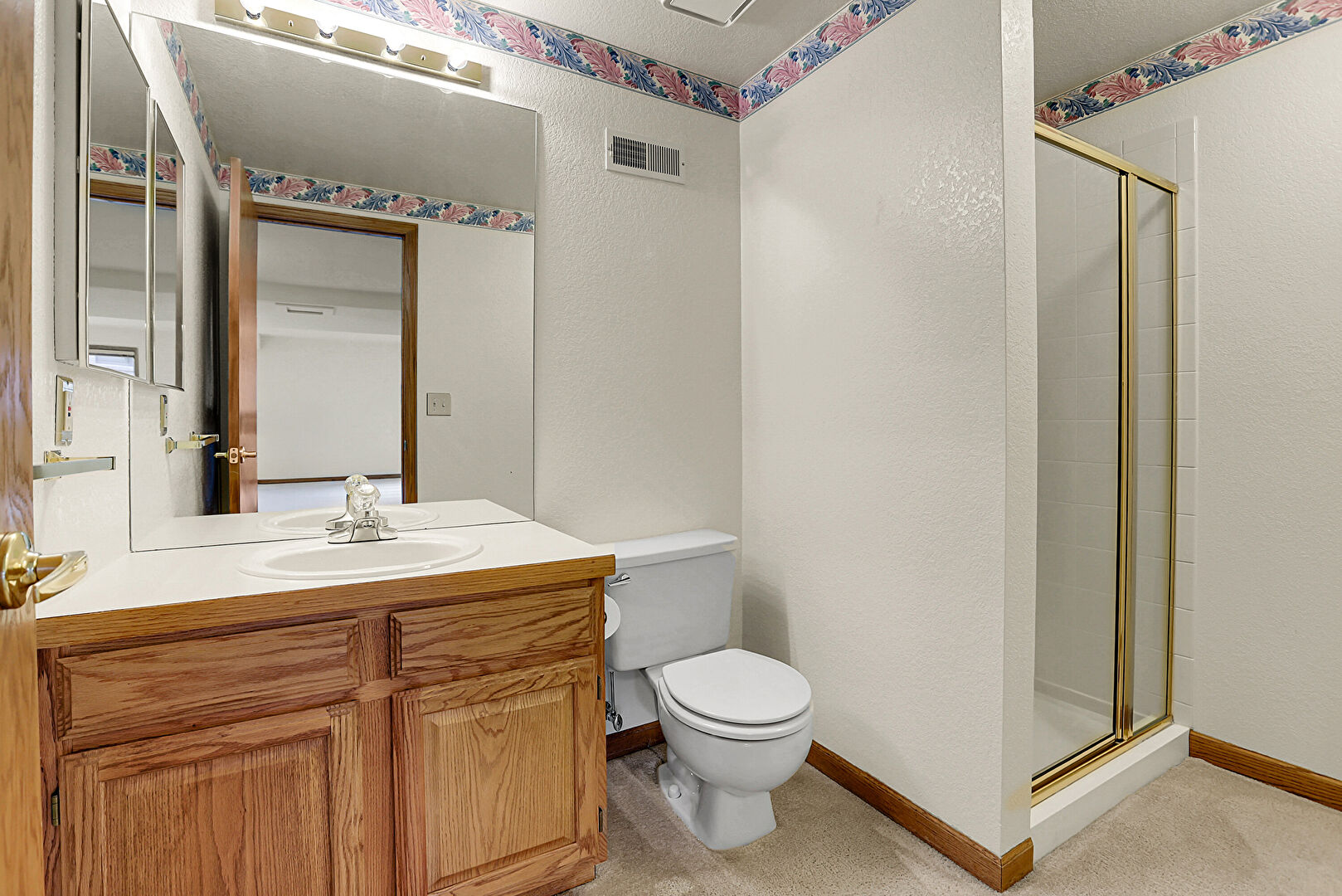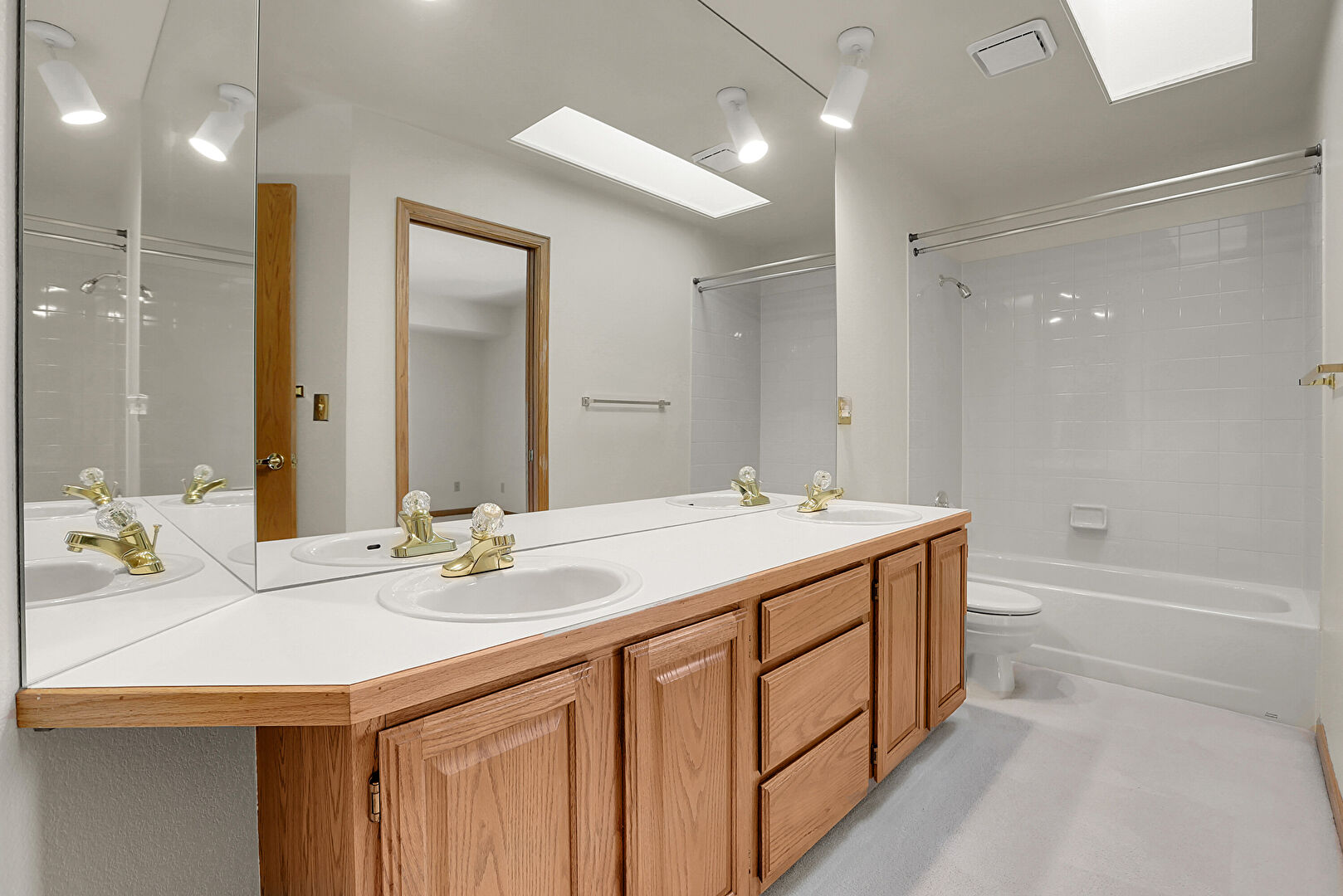 Baseboards Wall, Carpet, Combined Bath Shower, Drywall, Full Bathroom, Half Bathroom, Skylight, Textured Wall, Vanity, Vent, Double Vanity, Full Bathroom, Textured Wall