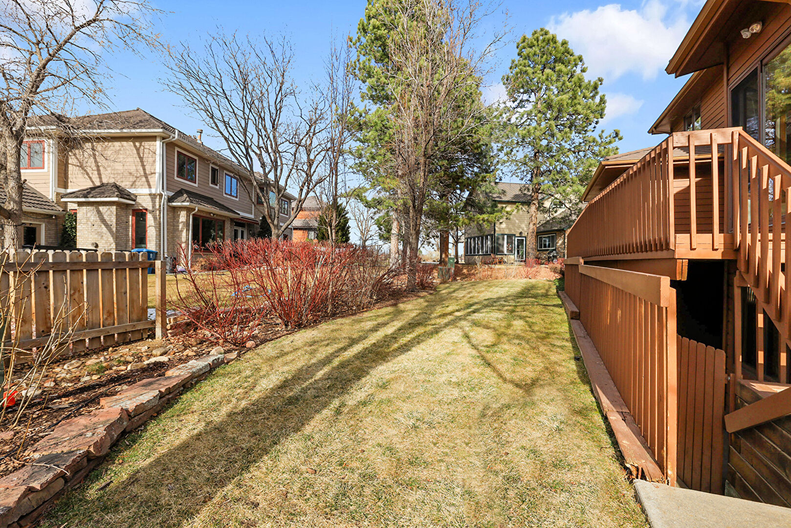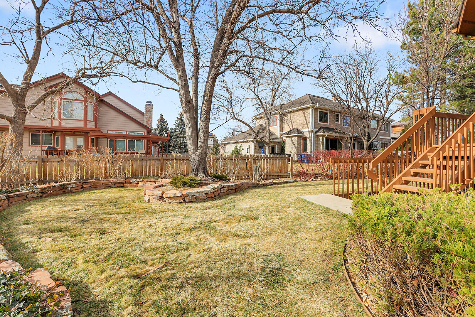 Deck, Fence, Lawn, Residential View, Stairs, Lawn, Residential View