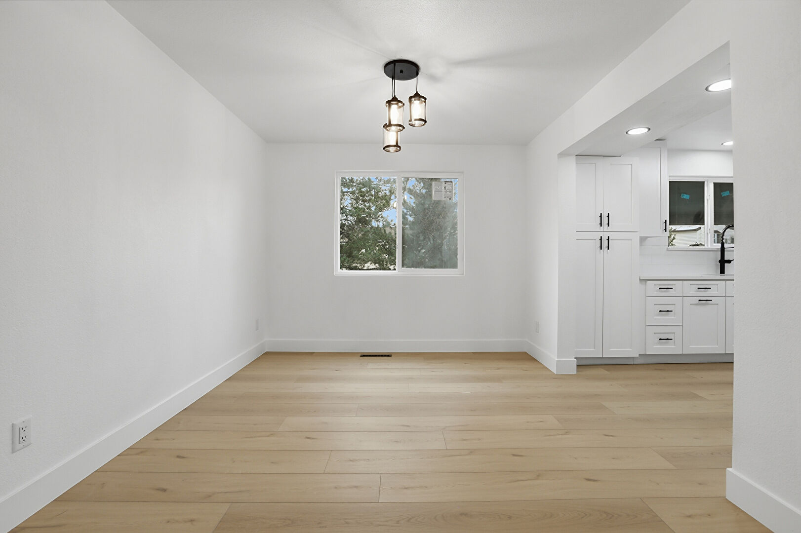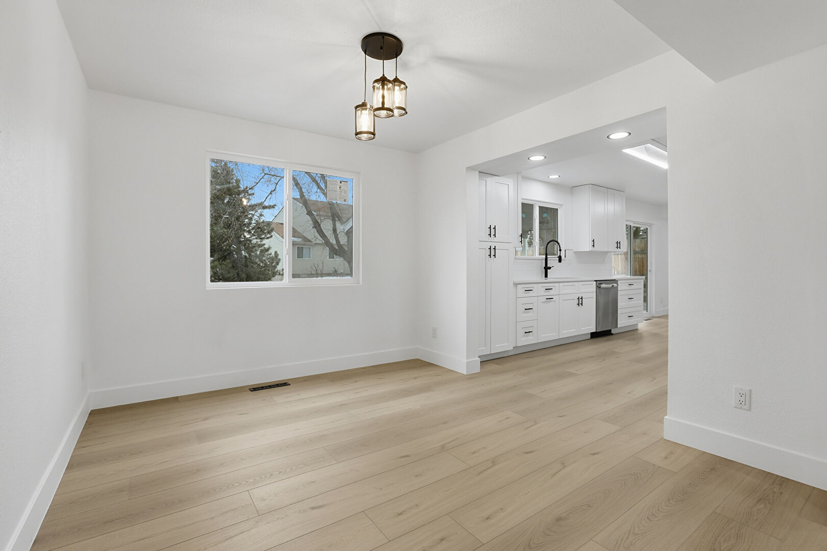 Baseboards Wall, Drywall, Natural Light, Notable Chandelier, Opens To Living Area, Pendant Lighting, Recessed Lighting, Shaker Cabinets, Vent, Wood Finish Floor, Baseboards Wall, Drywall