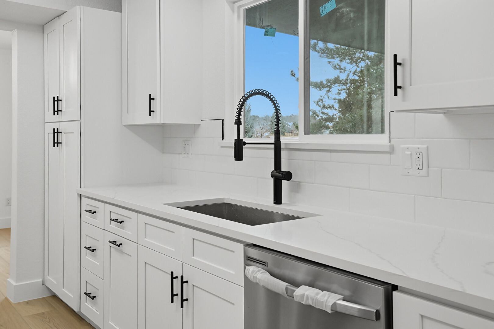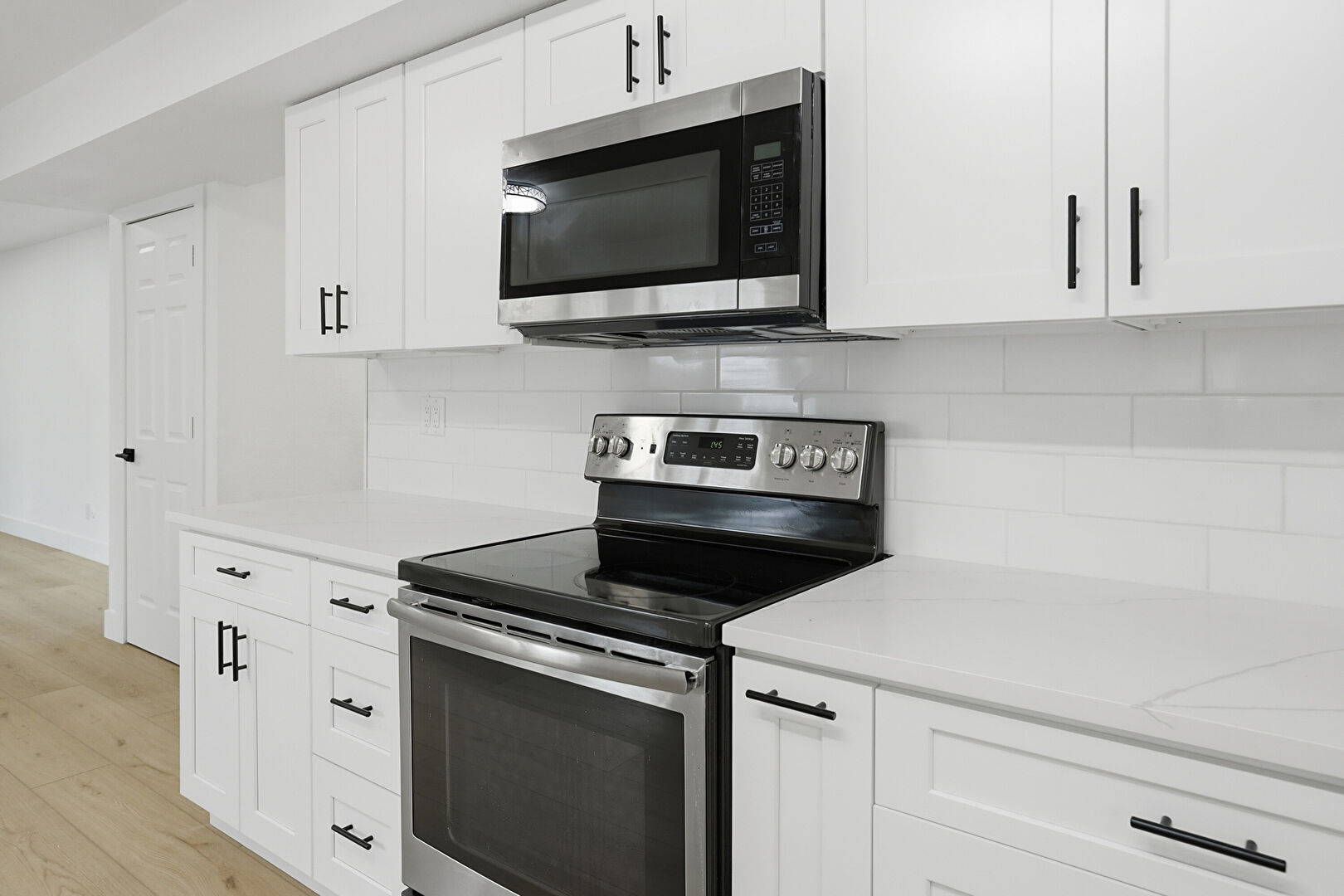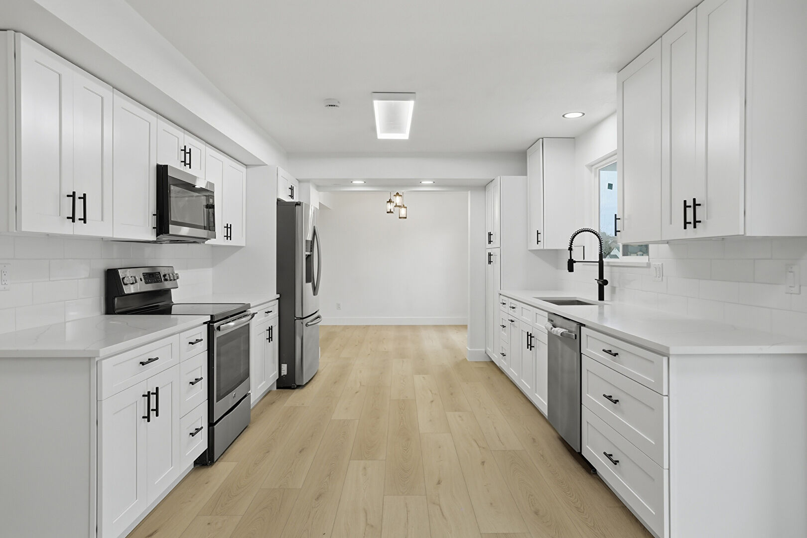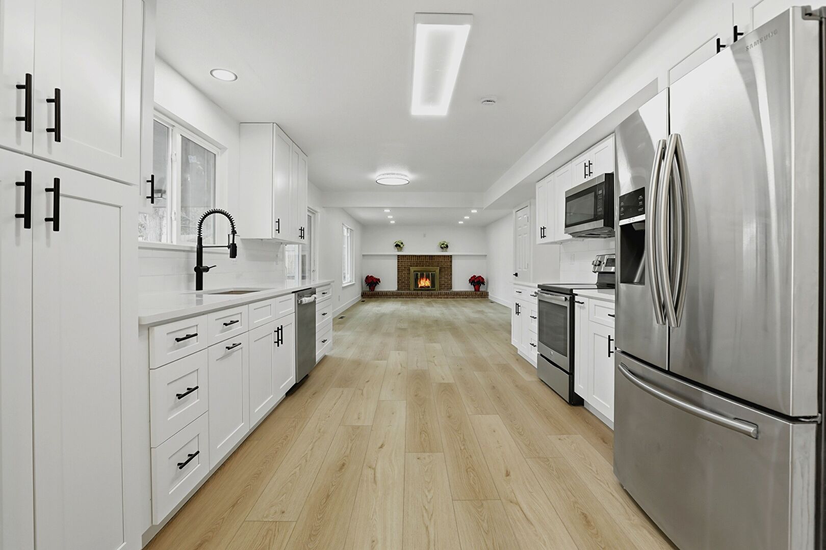 Baseboards Wall, Drywall, Fireplace, Galley Kitchen, Natural Light, Opens To Living Area, Recessed Lighting, Shaker Cabinets, Stone Countertops, Tray Ceiling, Wood Finish Floor, Shaker Cabinets, Wood Finish Floor
