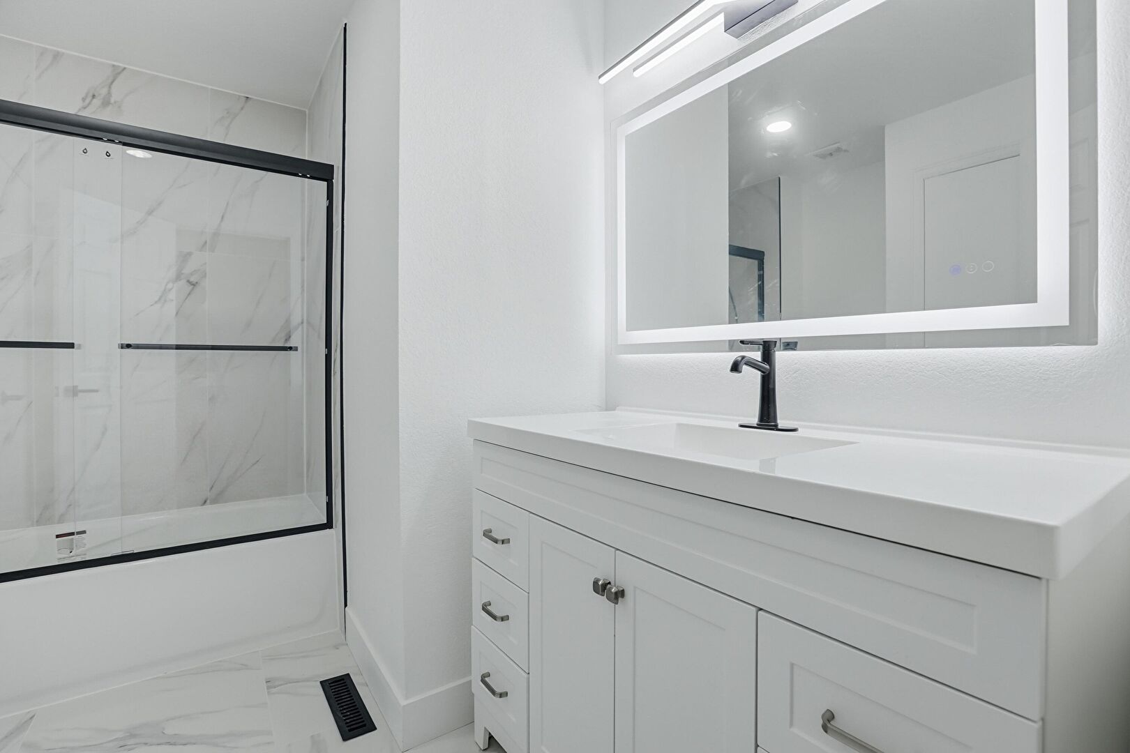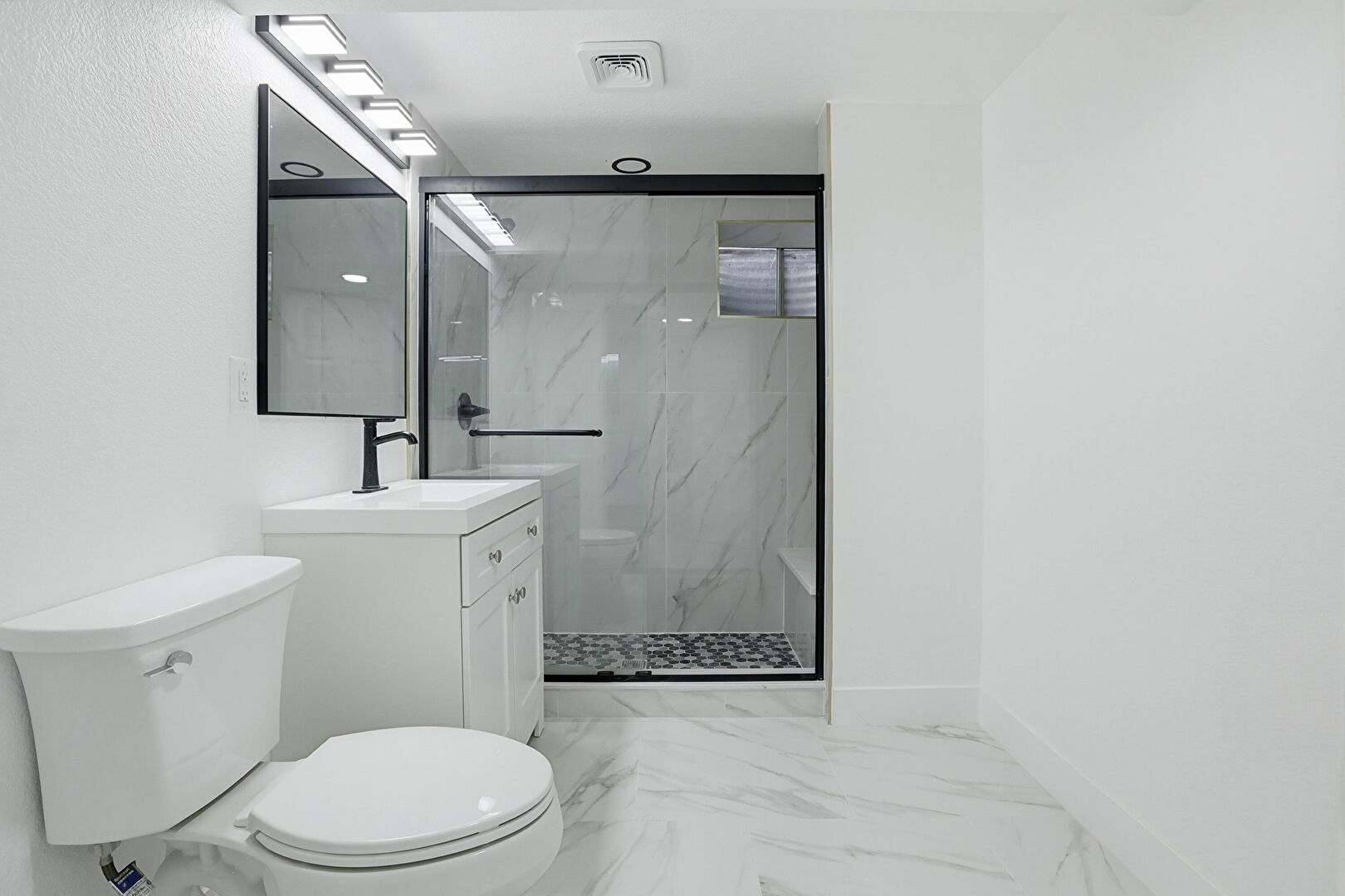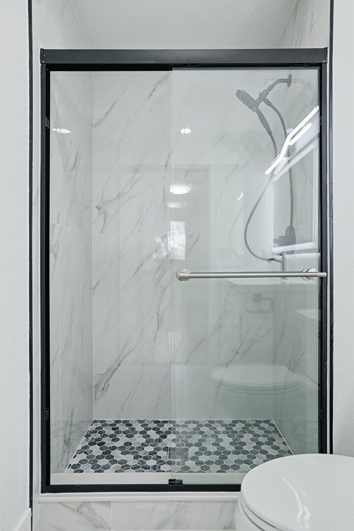 Baseboards Wall, Combined Bath Shower, Drywall, Full Bathroom, Half Bathroom, Marble Finish Floor, Vanity, Vent, Baseboards Wall, Full Bathroom, Marble Finish Floor, Recessed Lighting