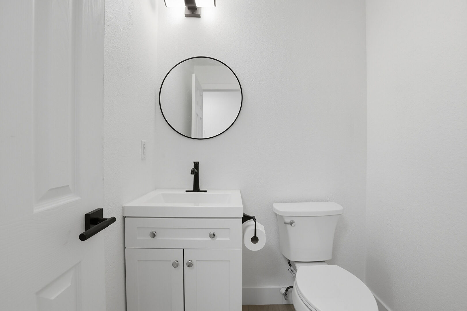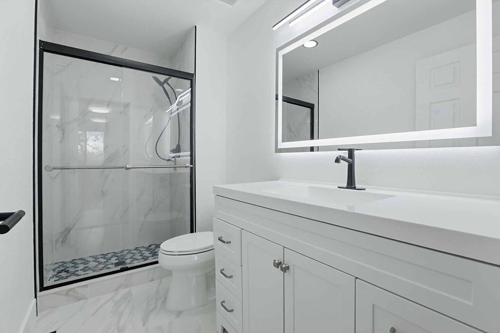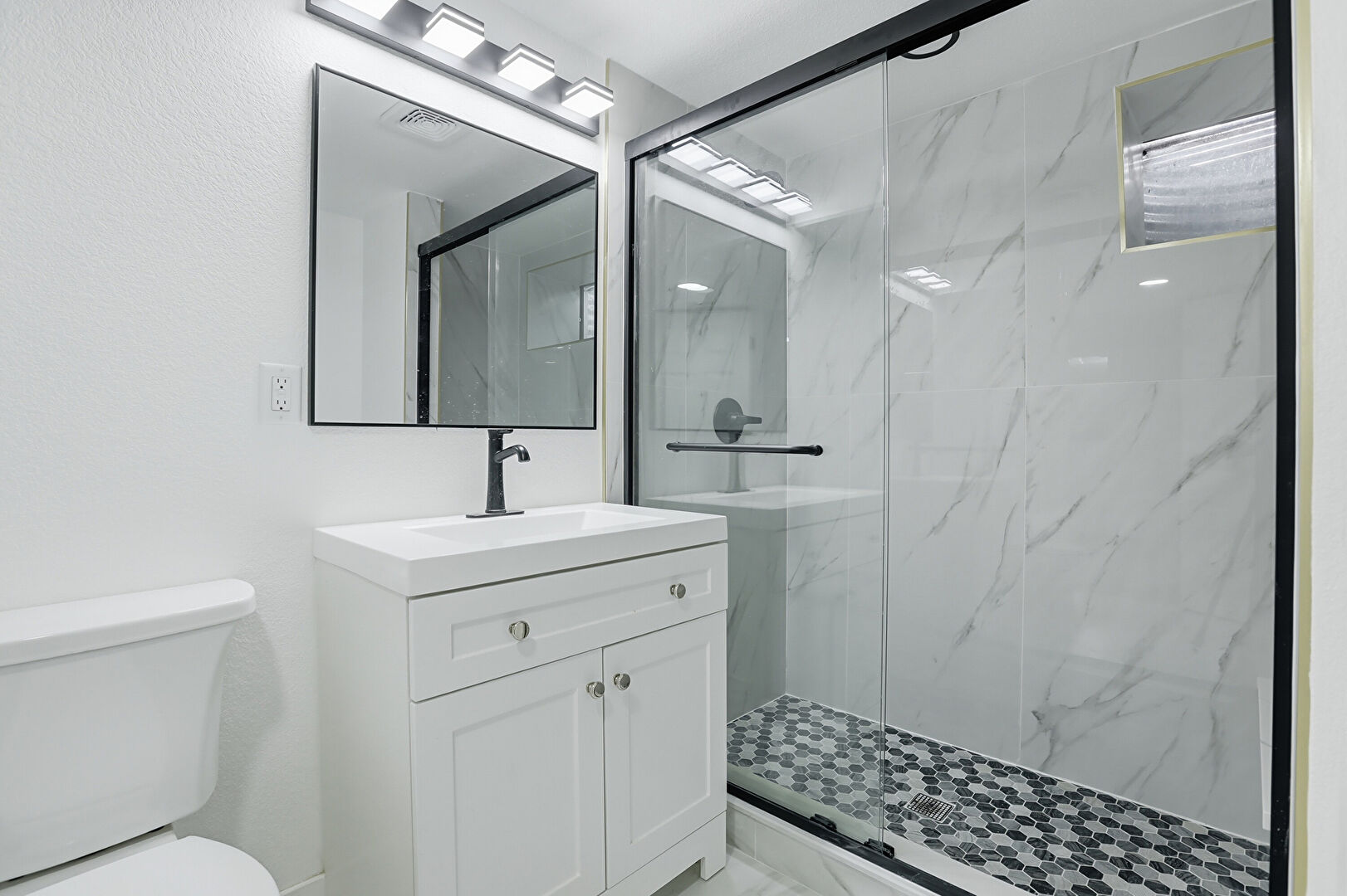 Baseboards Wall, Combined Bath Shower, Drywall, Full Bathroom, Half Bathroom, Marble Finish Floor, Vanity, Vent, Baseboards Wall, Full Bathroom, Marble Finish Floor, Recessed Lighting