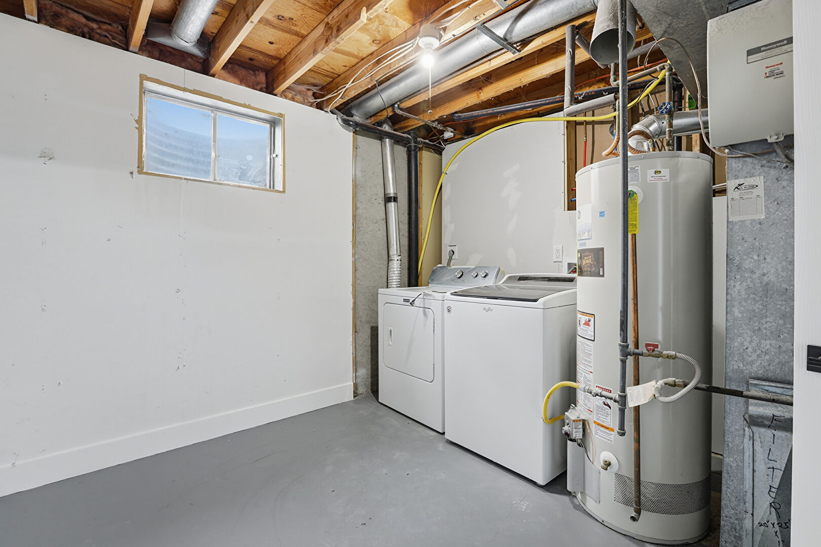 Basement, Concrete Floor, Drywall, Laundry, Natural Light, Water Heater, Furnace