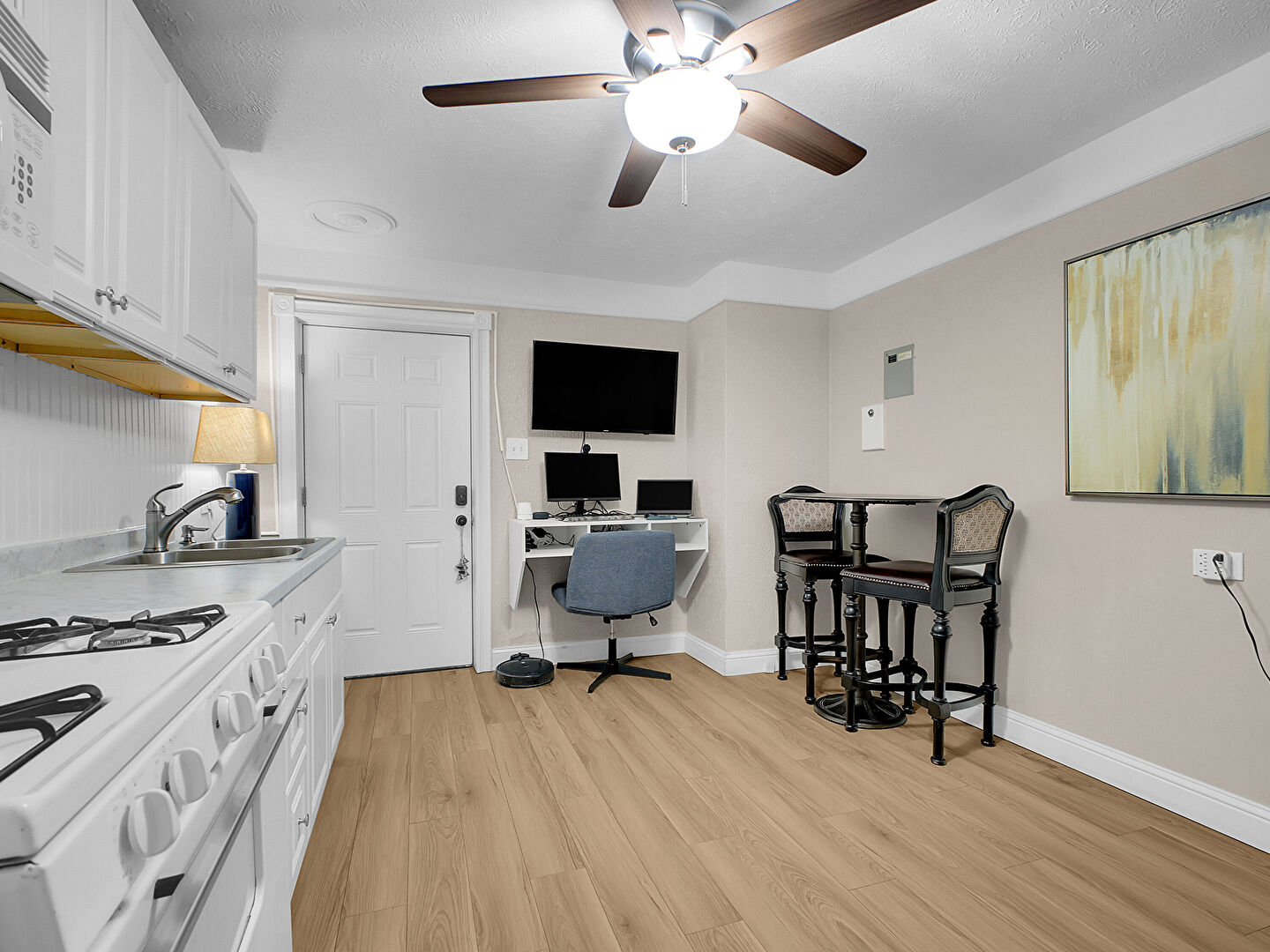 Baseboards Wall, Built In Desk, Ceiling Fan, Drywall, Office Area, Raised Cabinets, Textured Ceiling, Wood Finish Floor, Ceiling Fan, Office Area