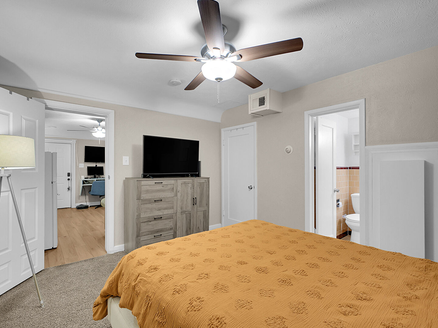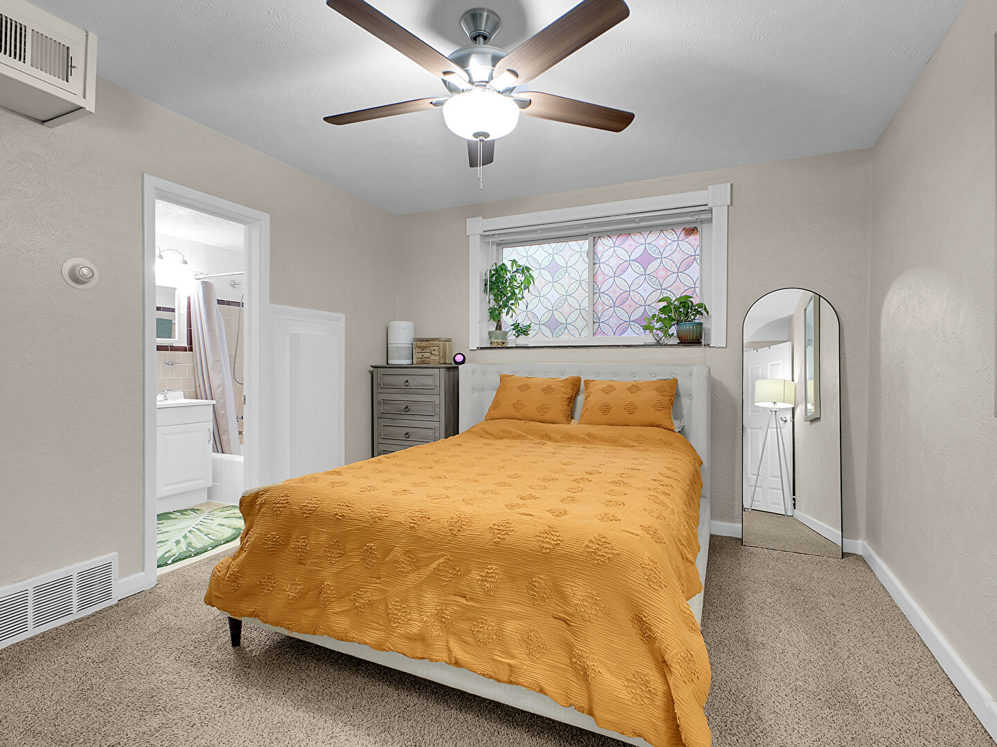 Baseboards Wall, Carpet, Ceiling Fan, Closet, Drywall, Ensuite Bathroom, Natural Light, Vent, Drywall, Textured Ceiling