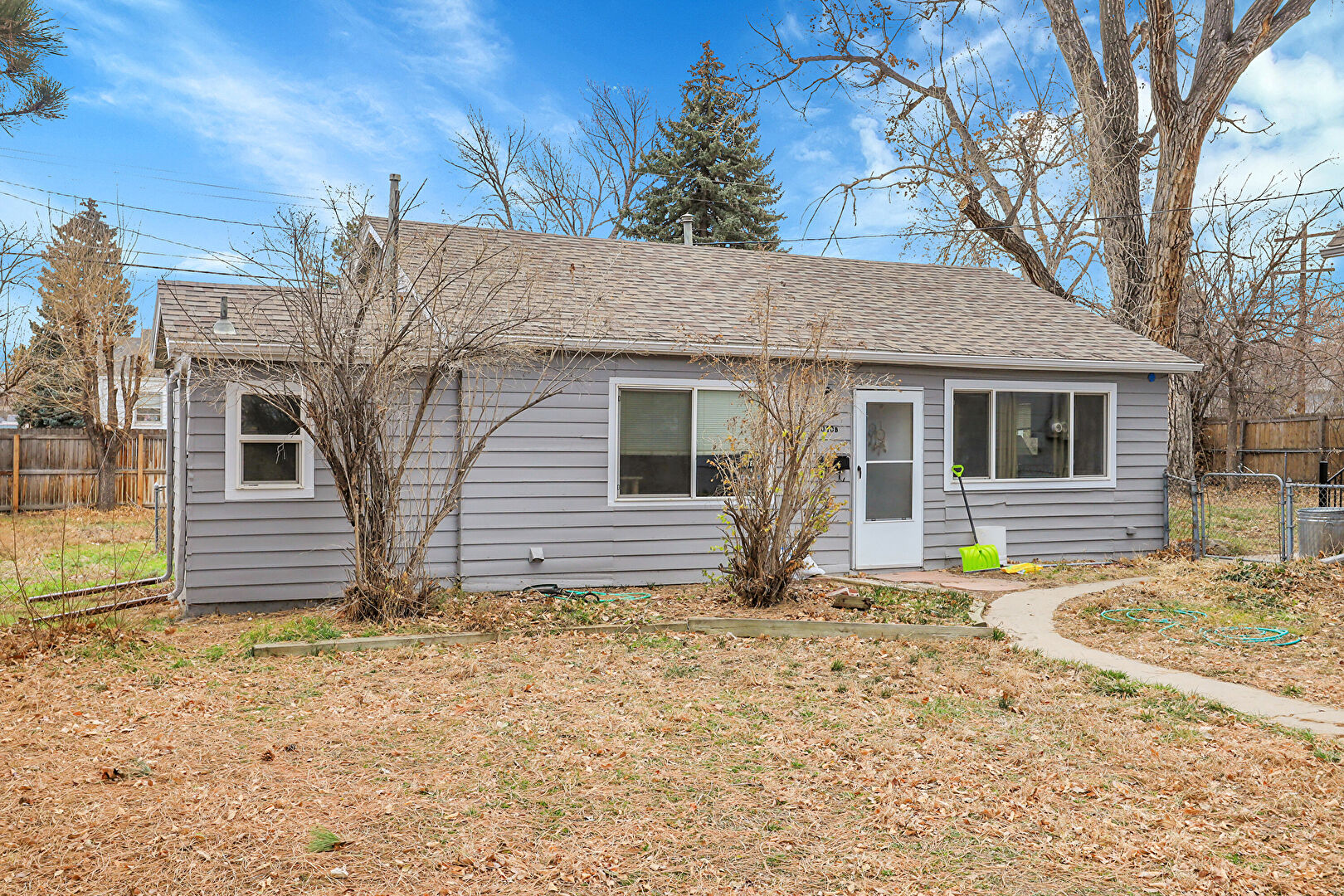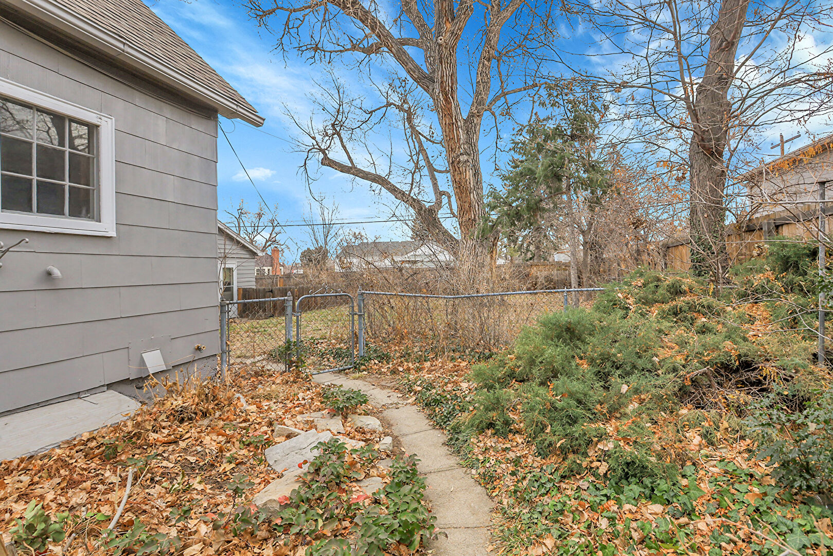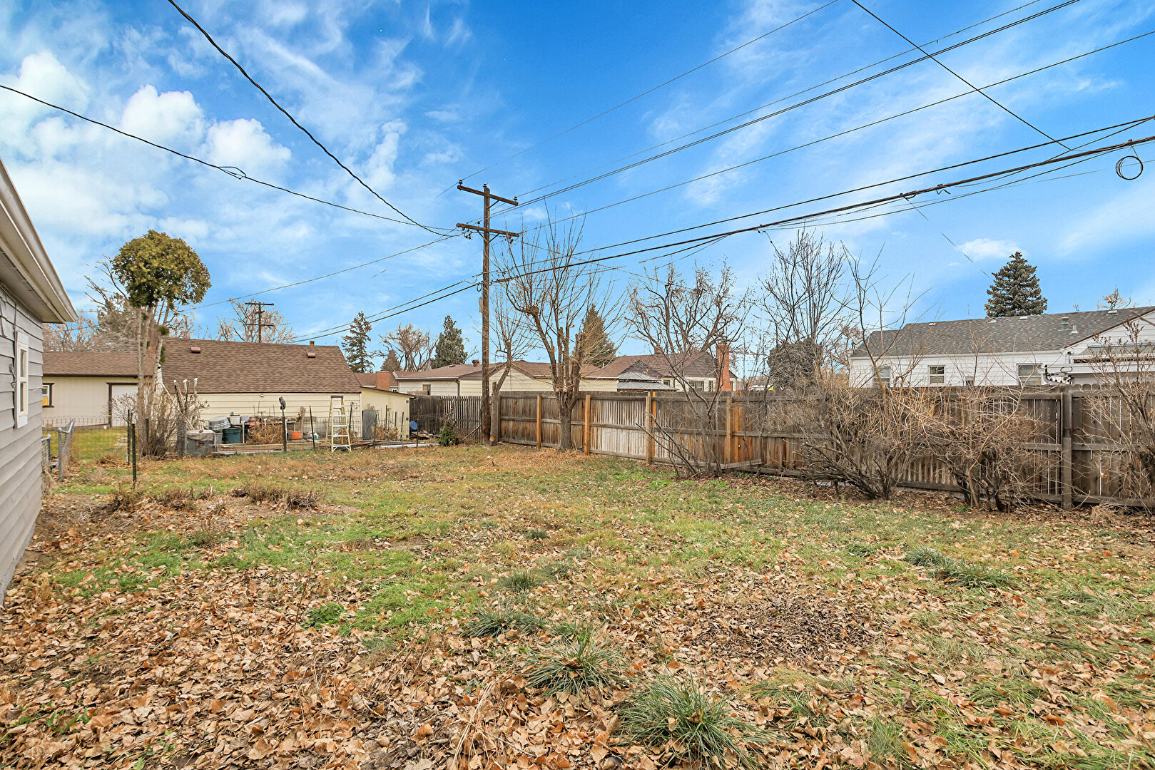 Concrete Foundation, Downspout, Electric Meter, Fence, Gutters, Horizontal Siding, Lawn, Shingle Roof, Fence, Shingle Roof