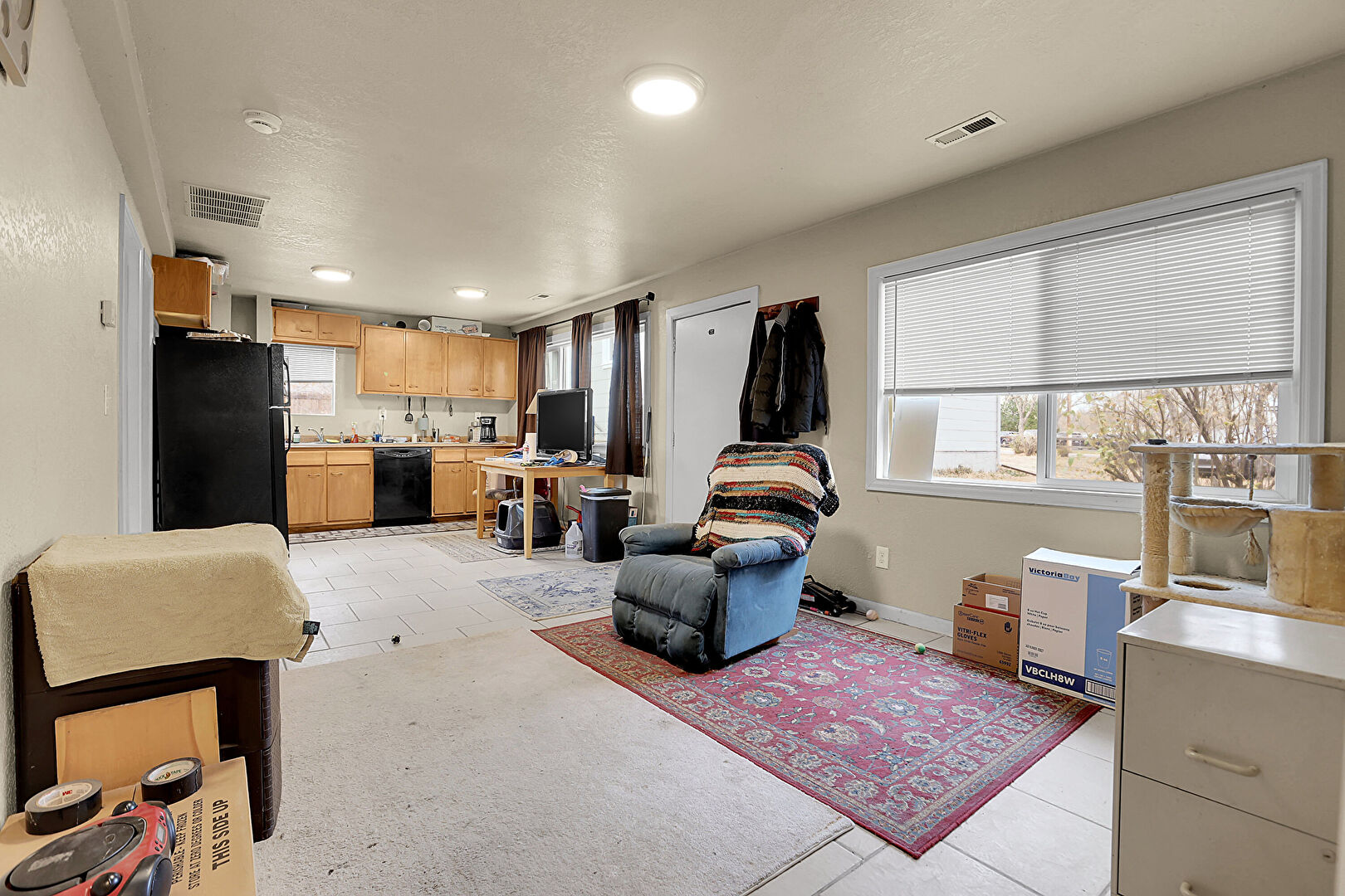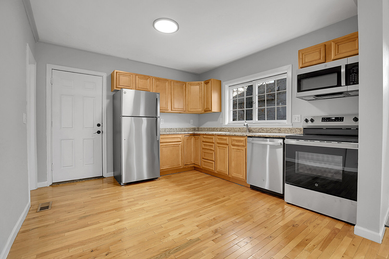 Baseboards Wall, Drywall, L Shaped Kitchen, Natural Light, Recessed Lighting, Smoke Carbon Monoxide Detector, Textured Ceiling, Tile Floor, Vent, Wood Finish Floor, Baseboards Wall, Carpet, Drywall, Vent, Wood Finish Floor