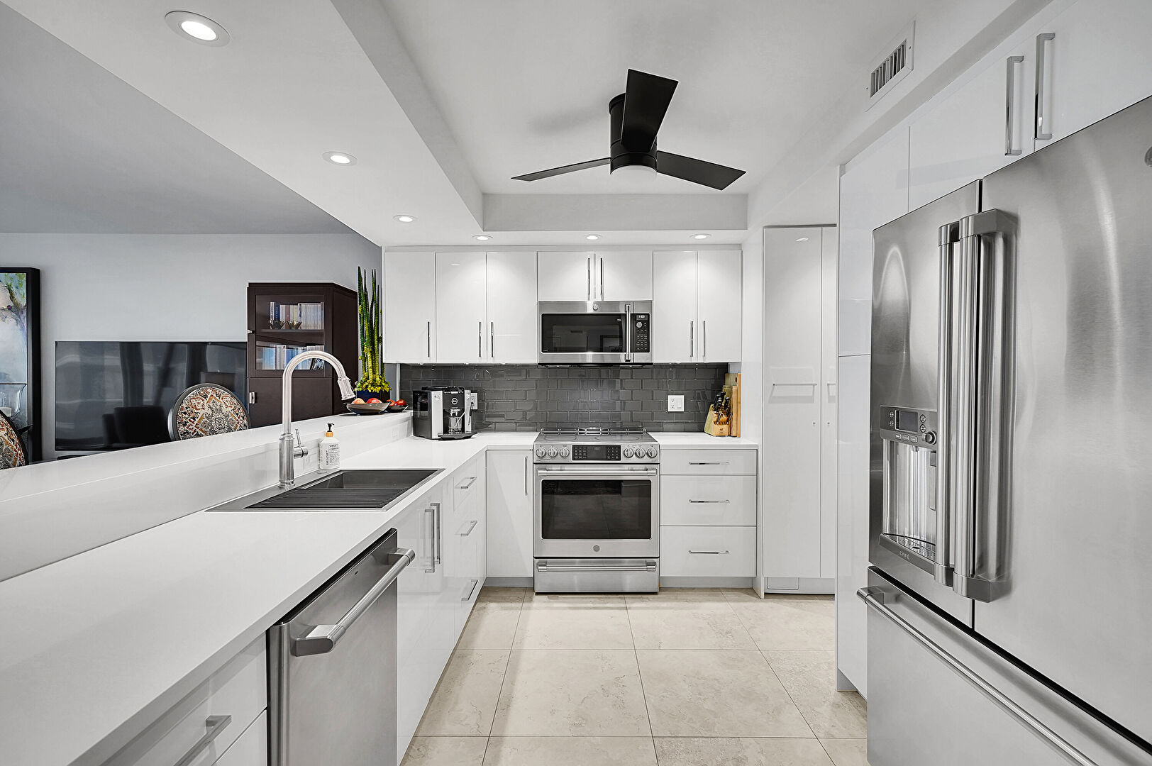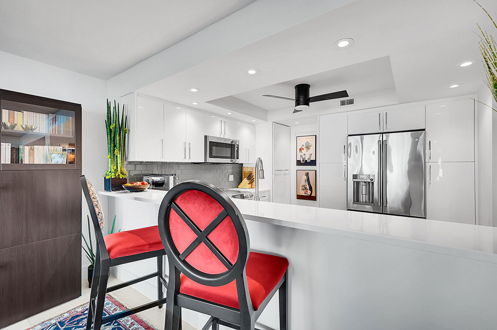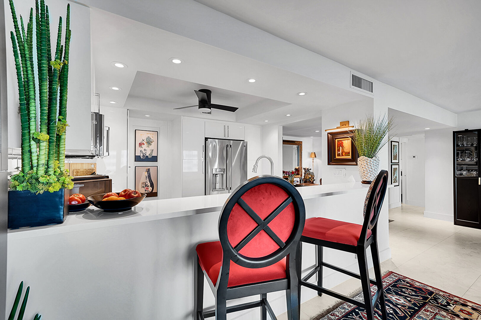 Baseboards Wall, Ceiling Fan, Drywall, Flat Panel Cabinets, Kitchen Bar, Kitchen Peninsula, Natural Light, Opens To Living Area, Pass Through Window, Recessed Lighting, Stone Countertops, Tile Floor, Tray Ceiling, U Shaped Kitchen, Vent, Baseboards Wall, Drywall, Kitchen Bar, Natural Light, Recessed Lighting, Stone Countertops, U Shaped Kitchen