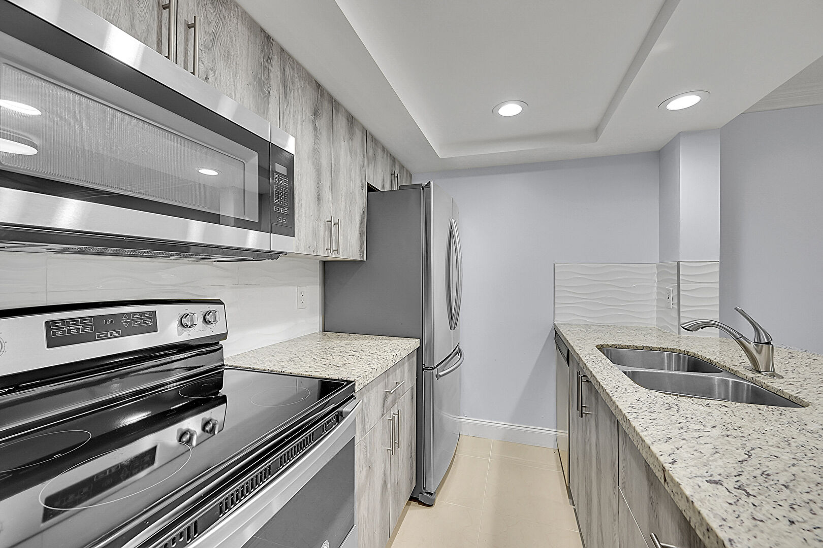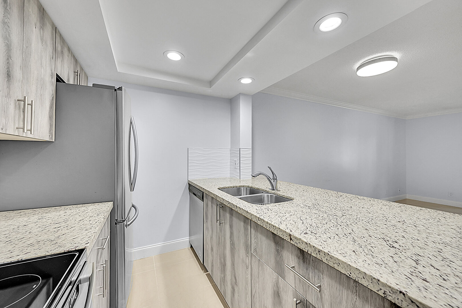 Baseboards Wall, Crown Molding, Drywall, Flat Panel Cabinets, Gray Cabinets, Kitchen Peninsula, Natural Light, Opens To Living Area, Recessed Lighting, Stone Countertops, Tile Floor, Tray Ceiling, Vent, Baseboards Wall, Drywall, Flat Panel Cabinets, Stone Countertops