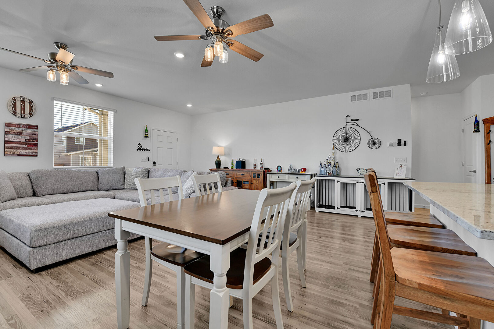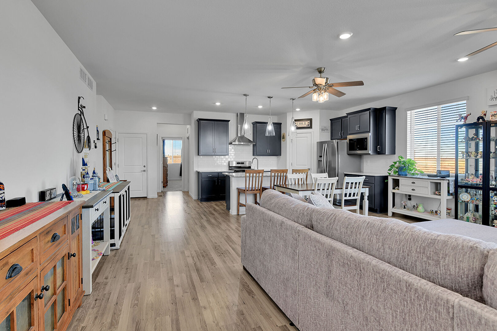 Baseboards Wall, Ceiling Fan, Drywall, Fireplace, L Shaped Kitchen, Natural Light, Recessed Lighting, Vent, Wood Finish Floor, Baseboards Wall, Recessed Lighting, Wood Finish Floor