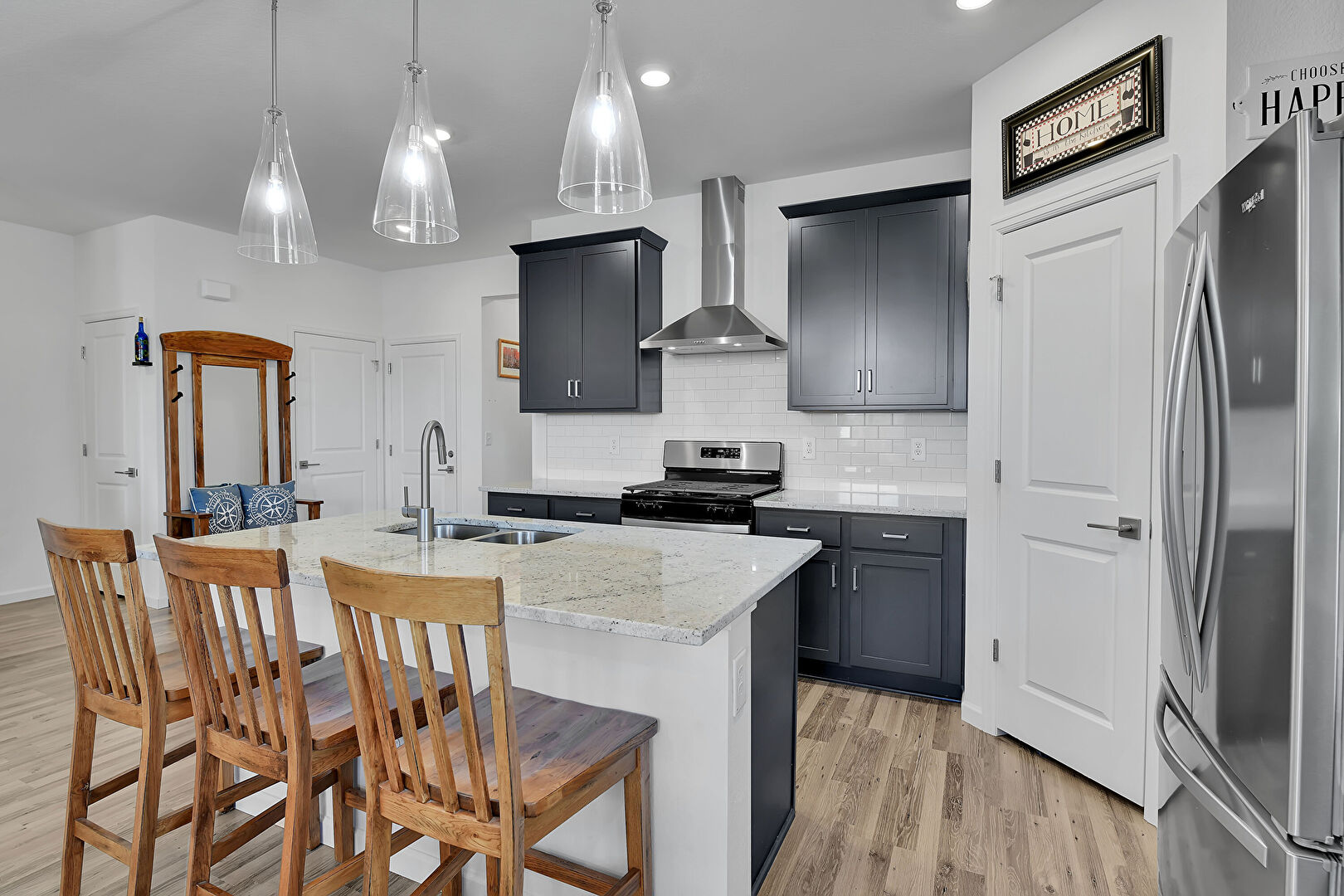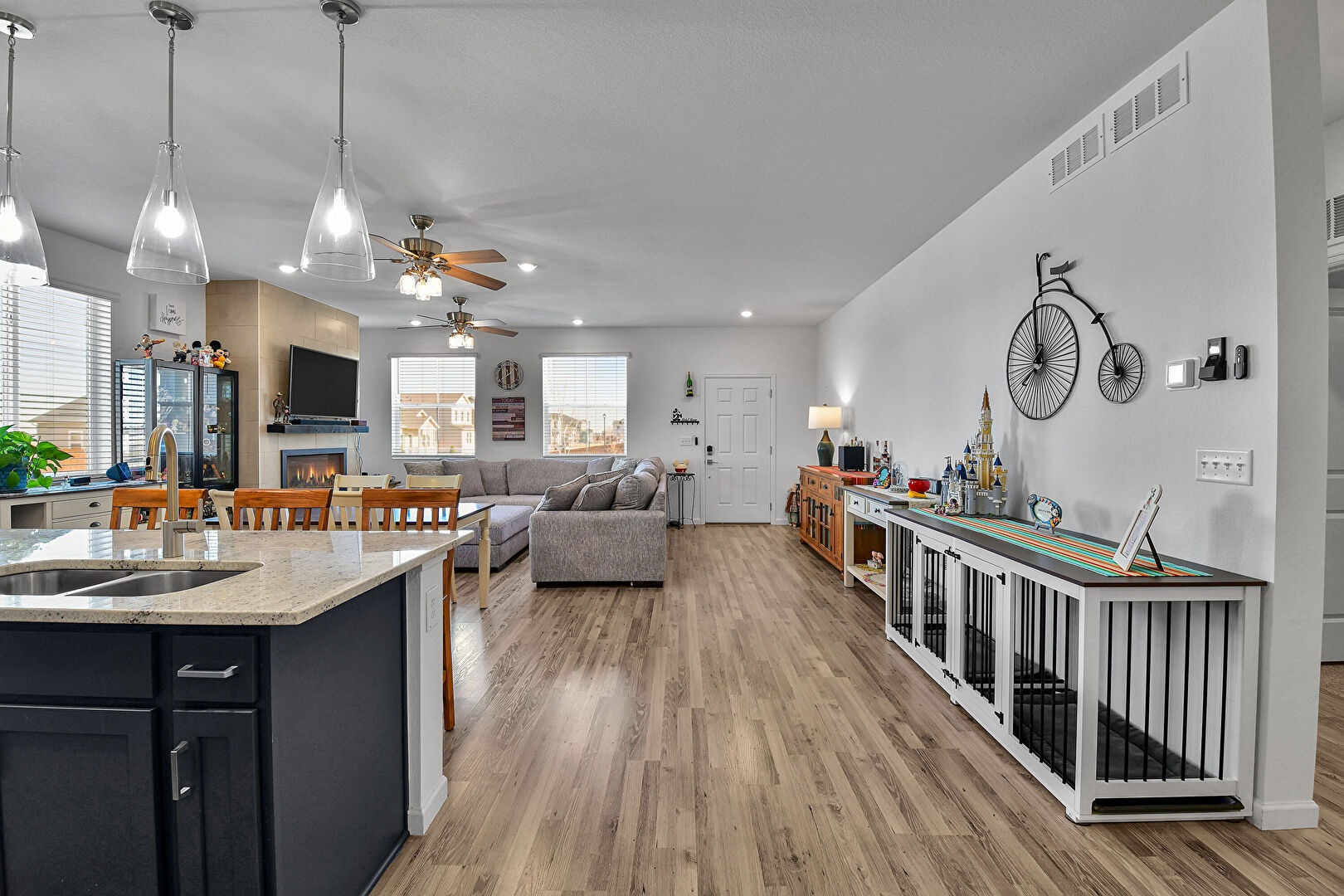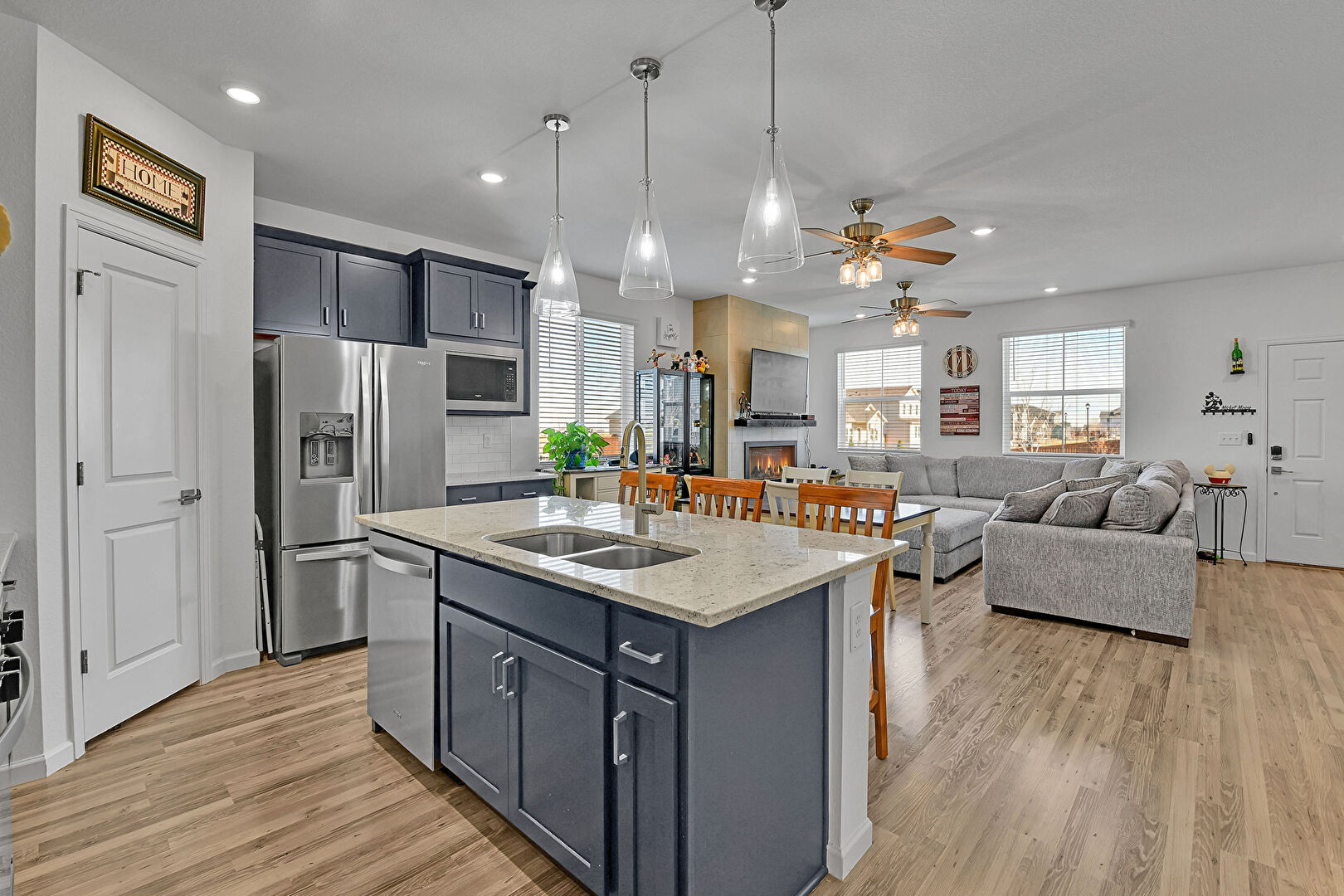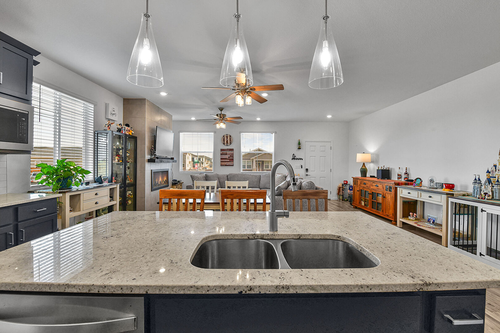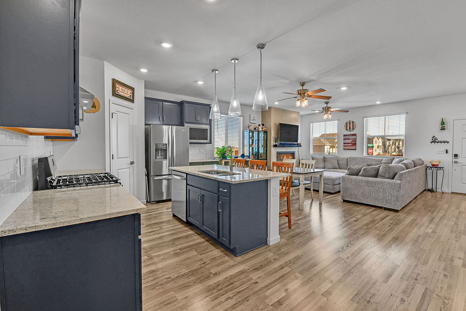 Baseboards Wall, Black Cabinets, Ceiling Fan, Crown Molding Cabinets, Drywall, Fireplace, Gray Cabinets, Kitchen Bar, Kitchen Island, L Shaped Kitchen, Natural Light, Opens To Living Area, Pendant Lighting, Recessed Lighting, Shaker Cabinets, Stone Countertops, Vent, Wood Finish Floor, Crown Molding Cabinets, Drywall, Gray Cabinets, Kitchen Island, Natural Light, Shaker Cabinets, Stone Countertops