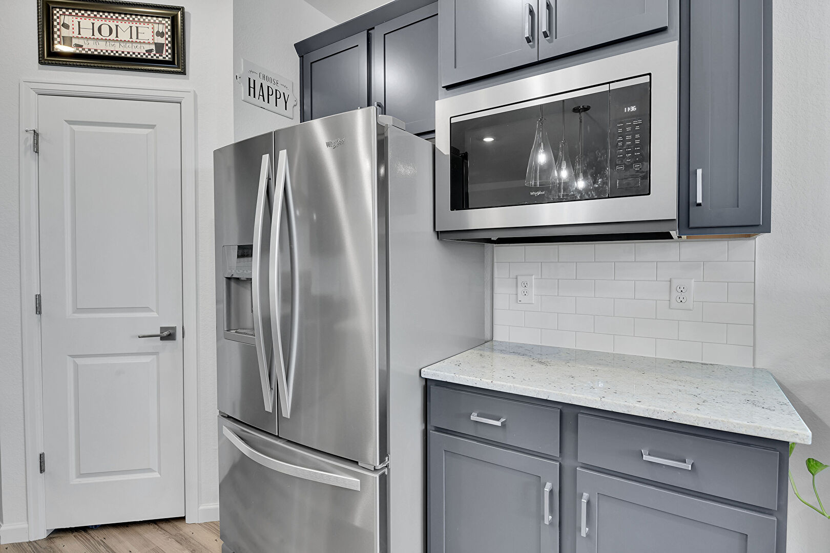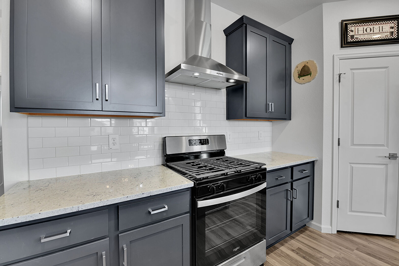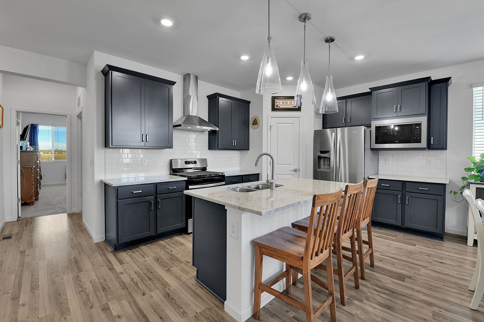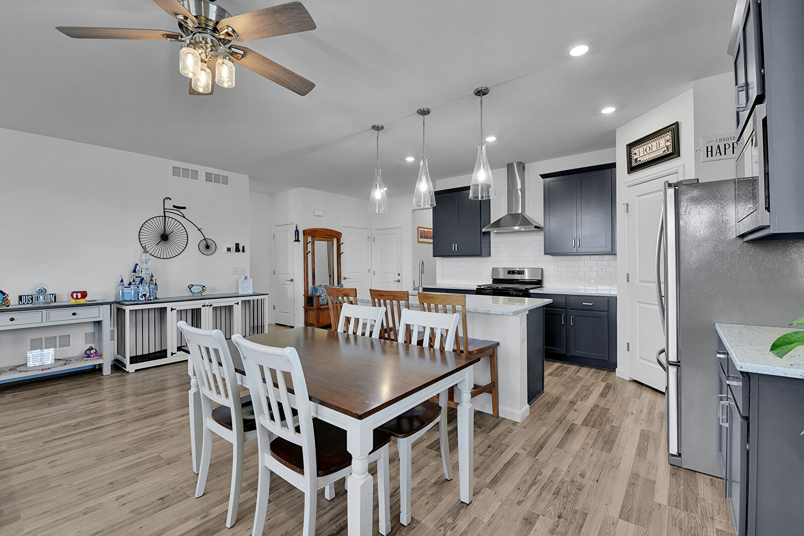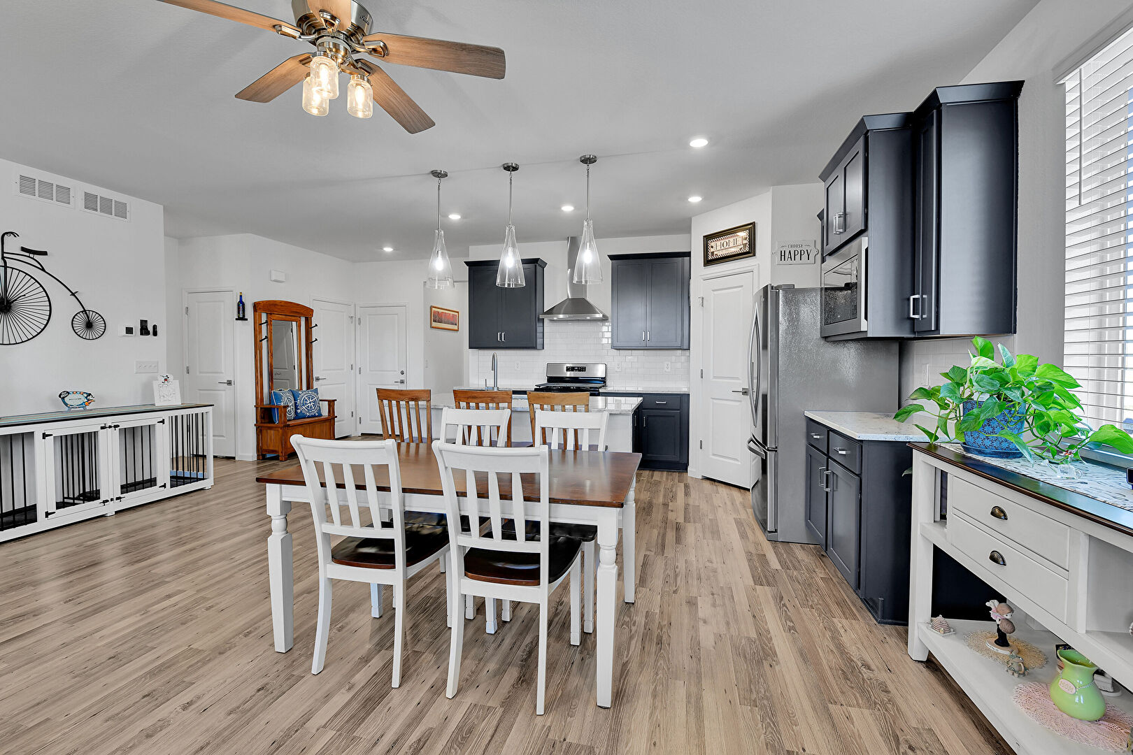 Baseboards Wall, Black Cabinets, Ceiling Fan, Crown Molding Cabinets, Drywall, Fireplace, Gray Cabinets, Kitchen Bar, Kitchen Island, L Shaped Kitchen, Natural Light, Opens To Living Area, Pendant Lighting, Recessed Lighting, Shaker Cabinets, Stone Countertops, Vent, Wood Finish Floor, Crown Molding Cabinets, Drywall, Gray Cabinets, Kitchen Island, Natural Light, Shaker Cabinets, Stone Countertops