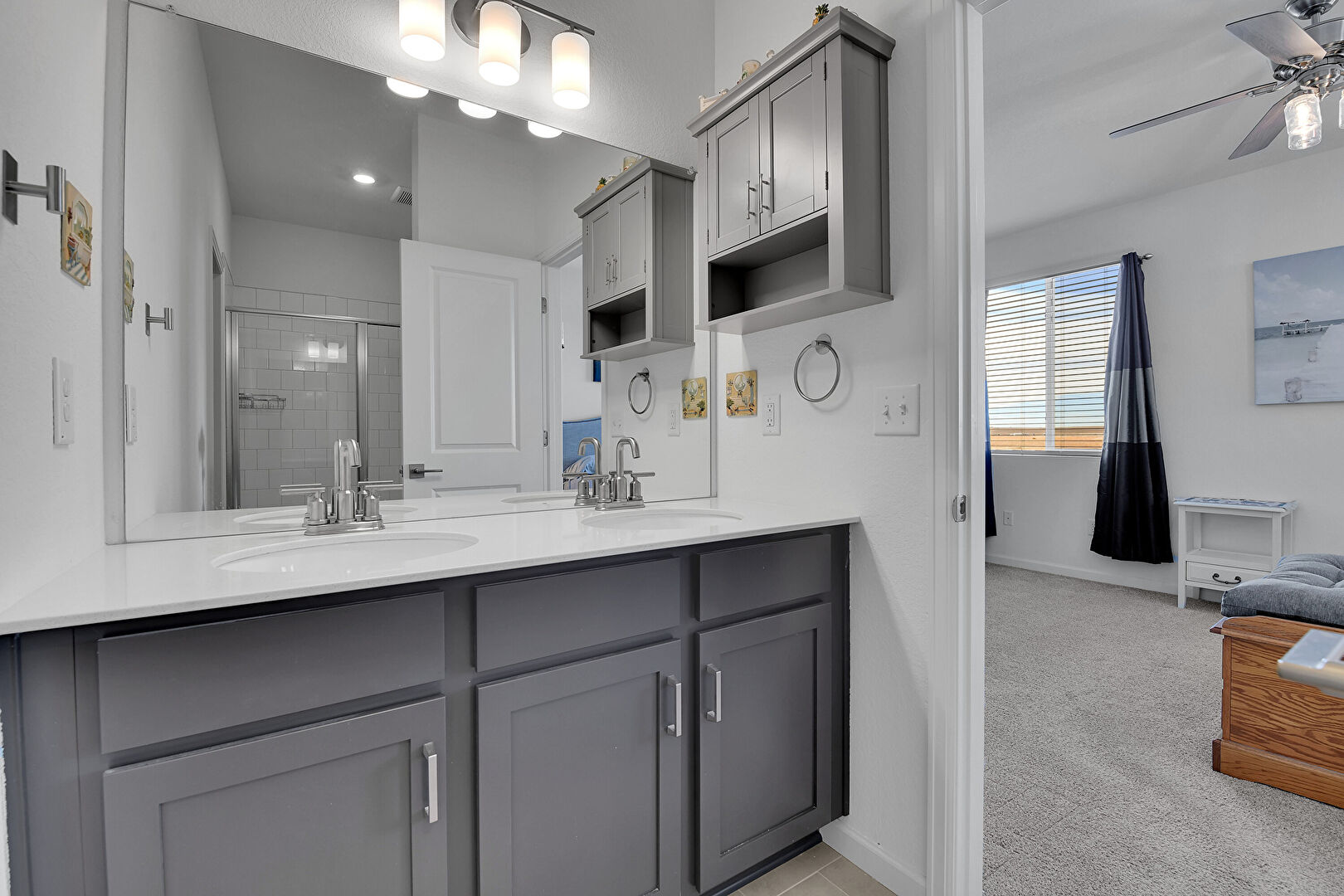Carpet, Ceiling Fan, Double Vanity, Drywall, Full Bathroom, Natural Light, Textured Wall, Tile Floor, Baseboards Wall, Full Bathroom