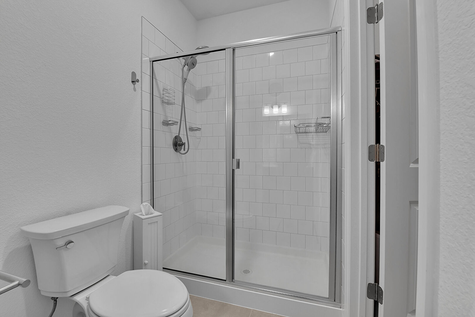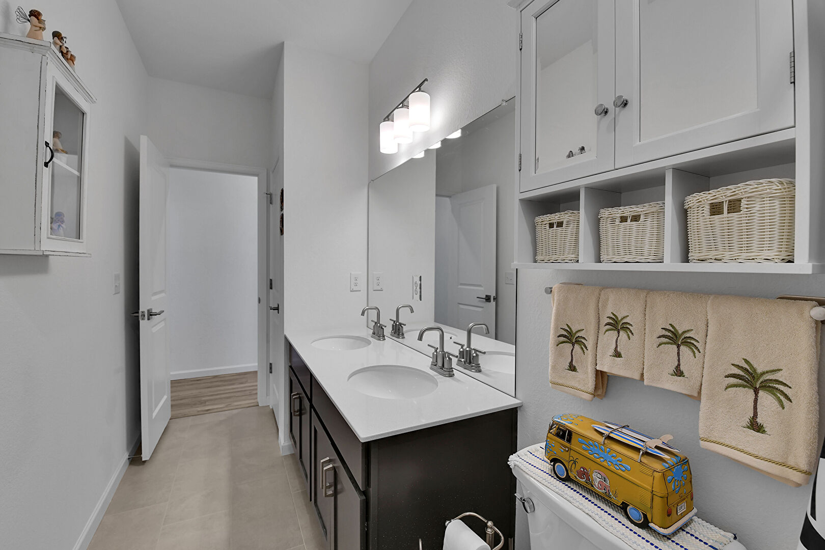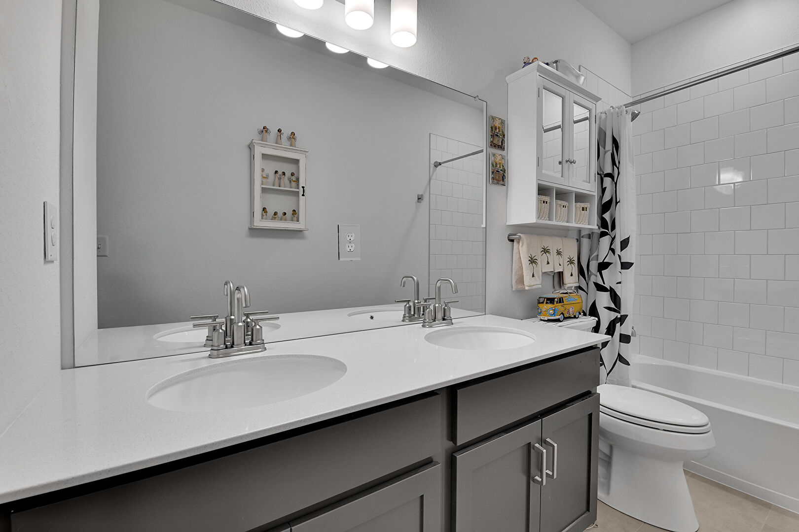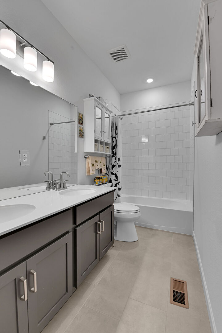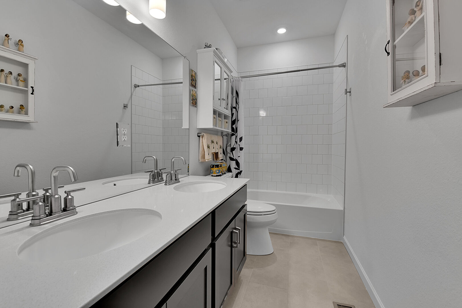 Baseboards Wall, Combined Bath Shower, Double Vanity, Drywall, Full Bathroom, Recessed Lighting, Tile Floor, Vent, Vinyl Floor, Baseboards Wall, Double Vanity, Full Bathroom, Tile Floor