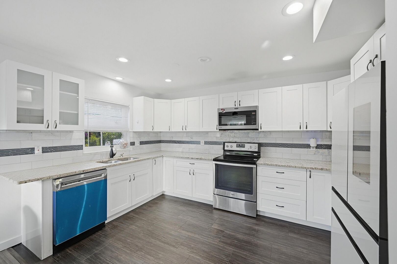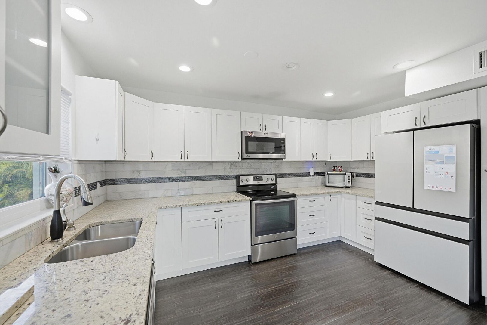 Glass Insert Cabinets, Natural Light, Recessed Lighting, Shaker Cabinets, Stone Countertops, Toaster, Wood Finish Floor, Drywall, Vent