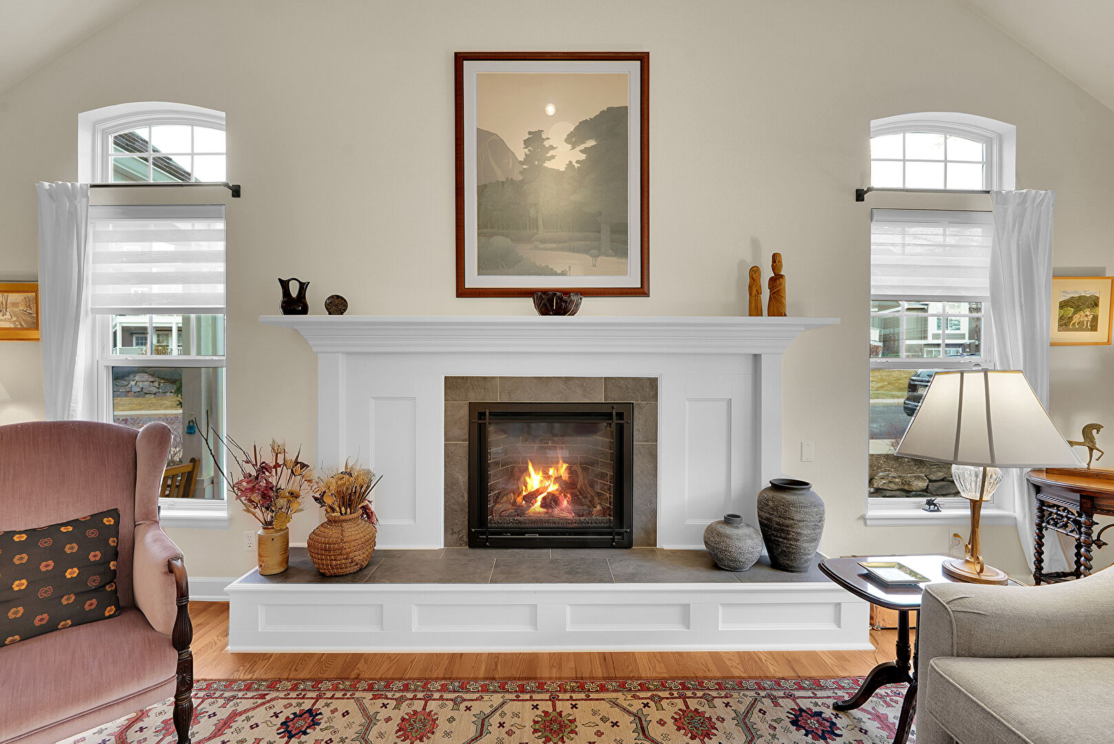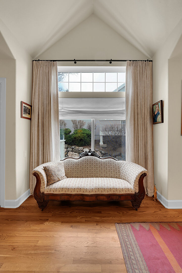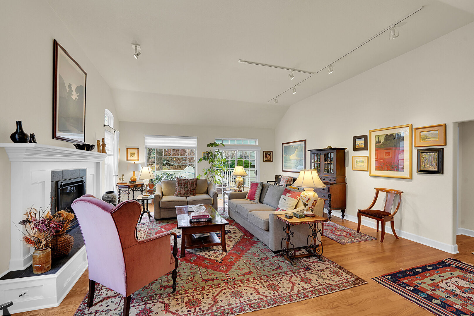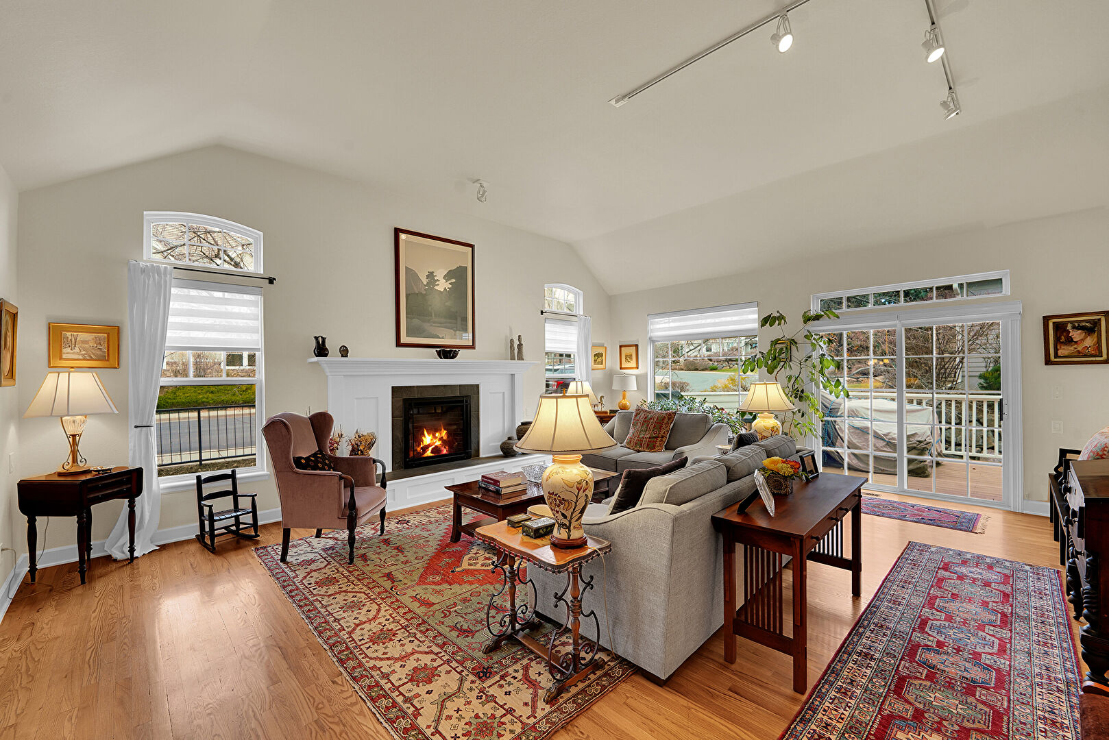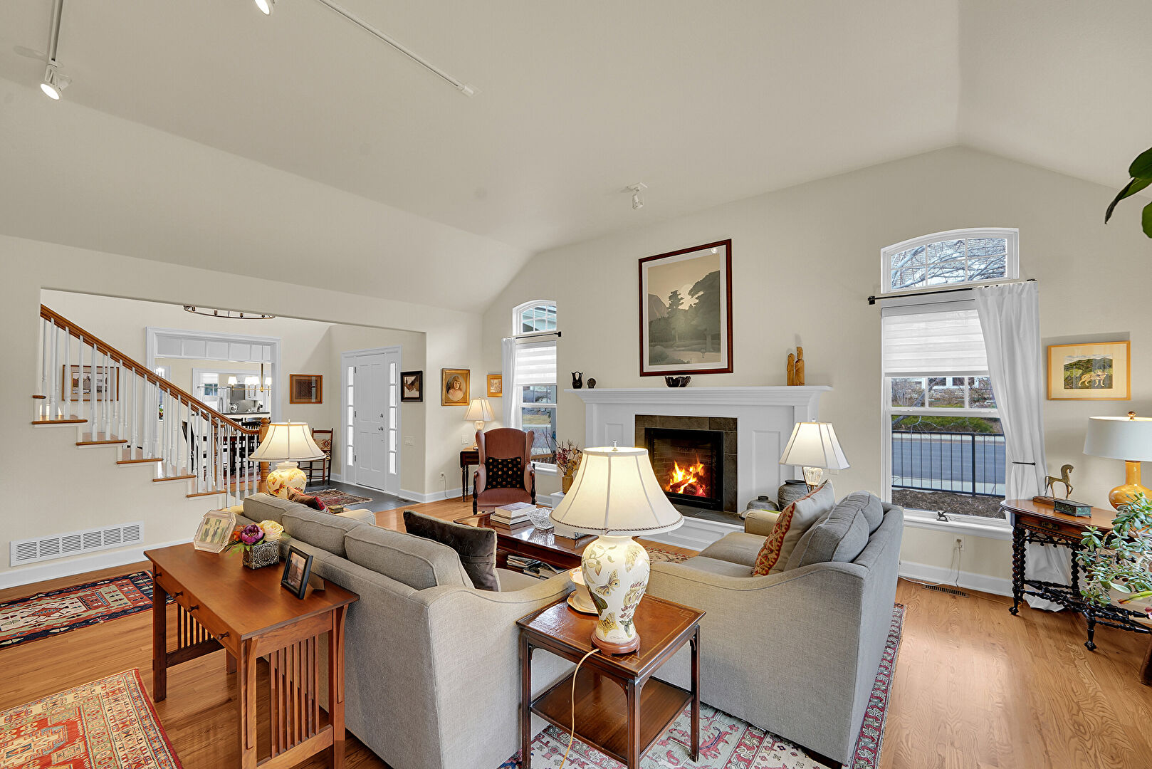 Cathedral Ceiling, Drywall, Fireplace, Natural Light, Vaulted Ceiling, Wood Finish Floor, High Ceiling